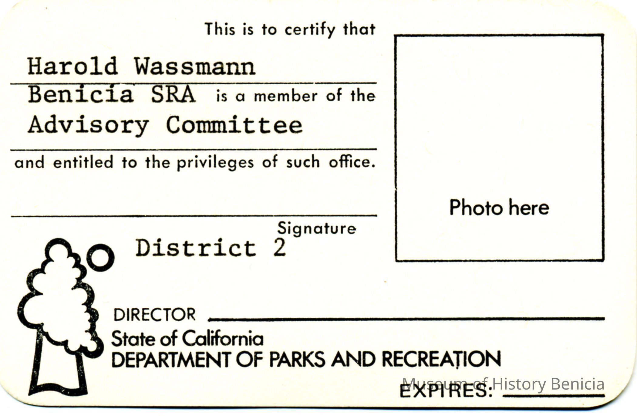 This is an identification card for Harry Wassmann as part of the Advisory Committee for the State Recreation Area..