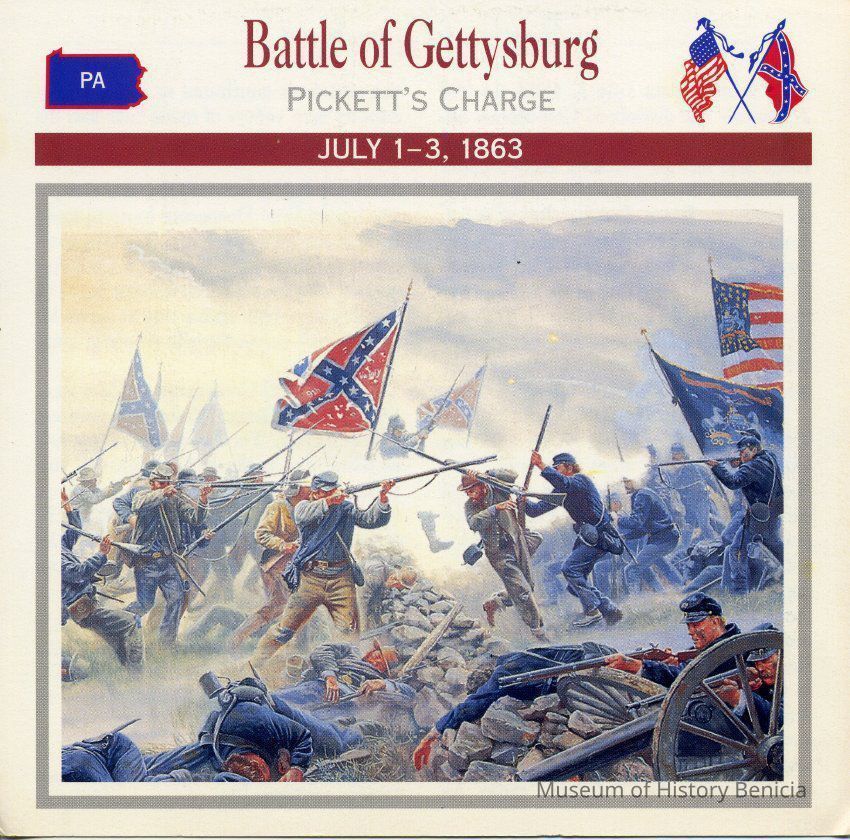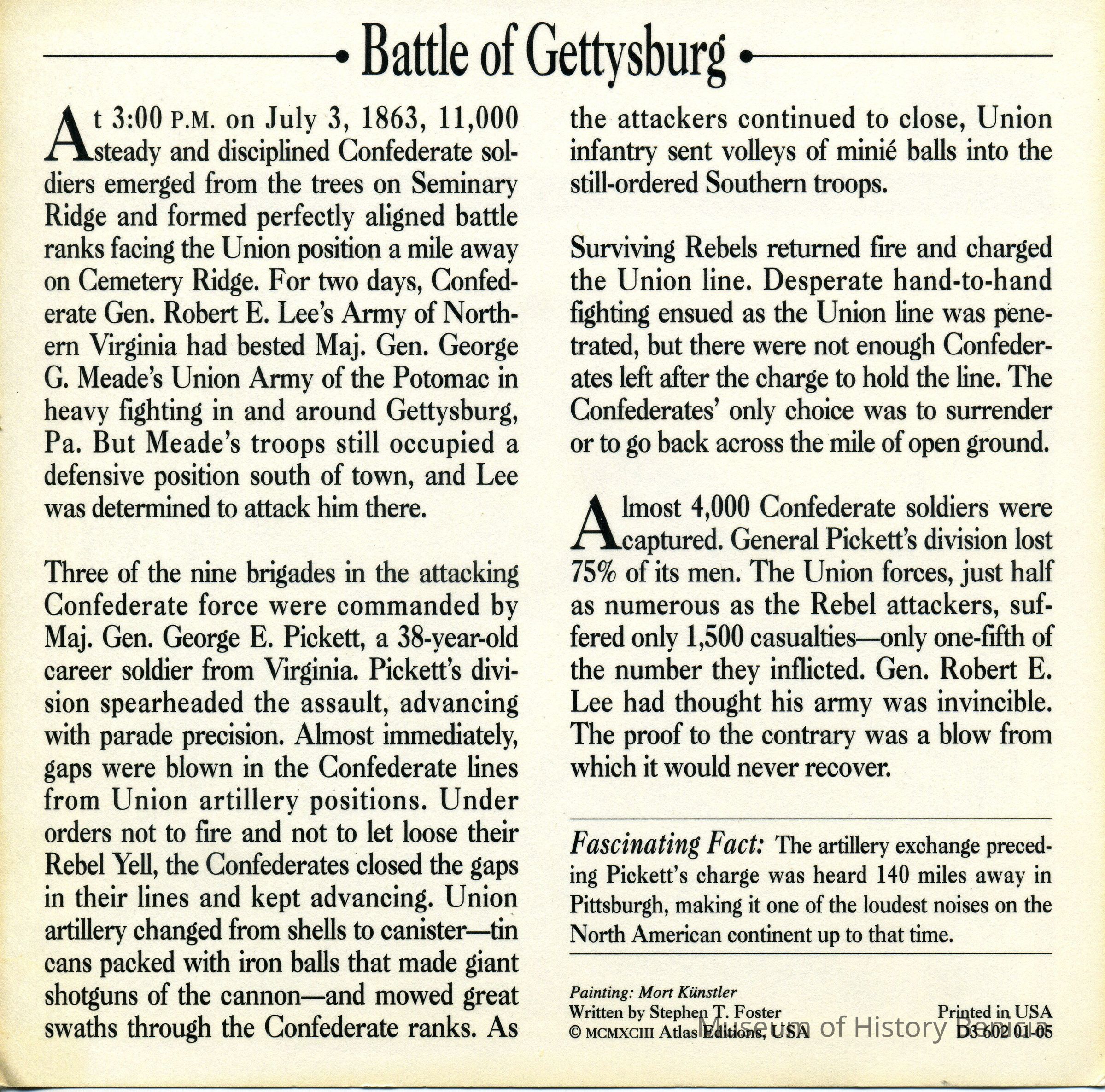 Back of card has a summary of the battle. Mentions Seminary Ridge, Gen. Robert E. Lee, and Maj. Gen. George E. Pickett.