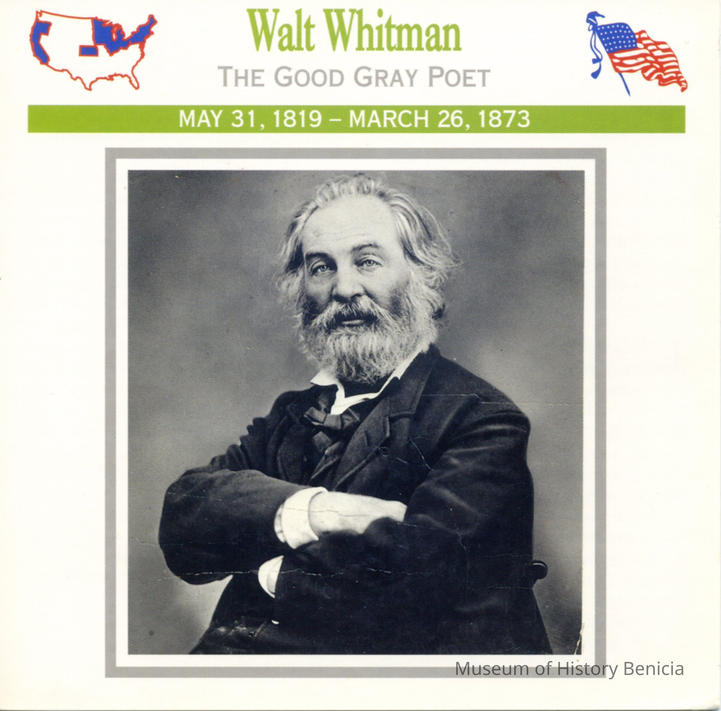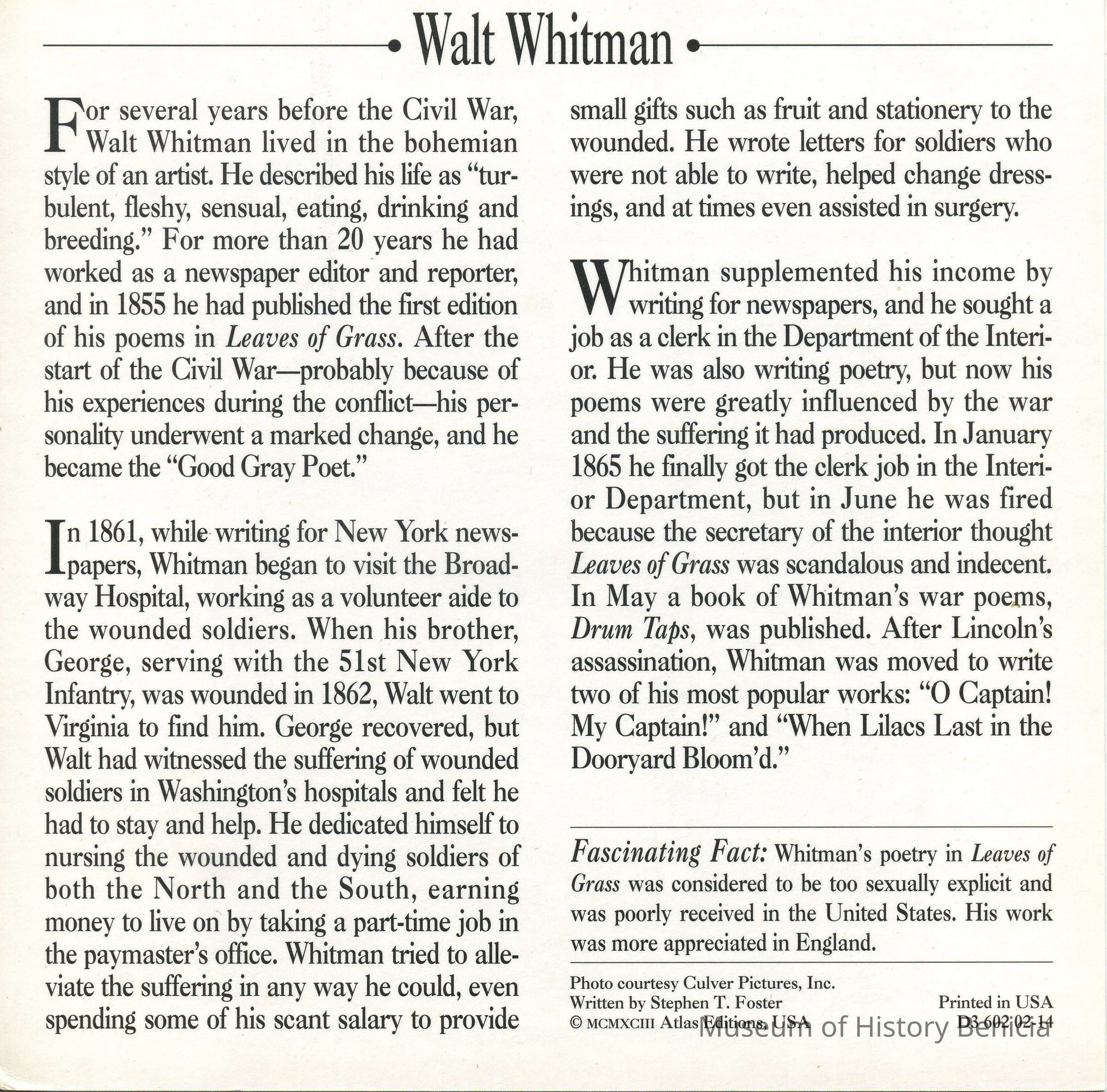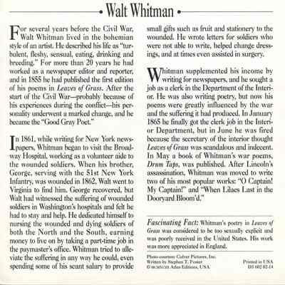 Back of card has a summary of Whitman's life. Mentions Leaves of Grass, Broadway Hospital, and Drum Taps.
