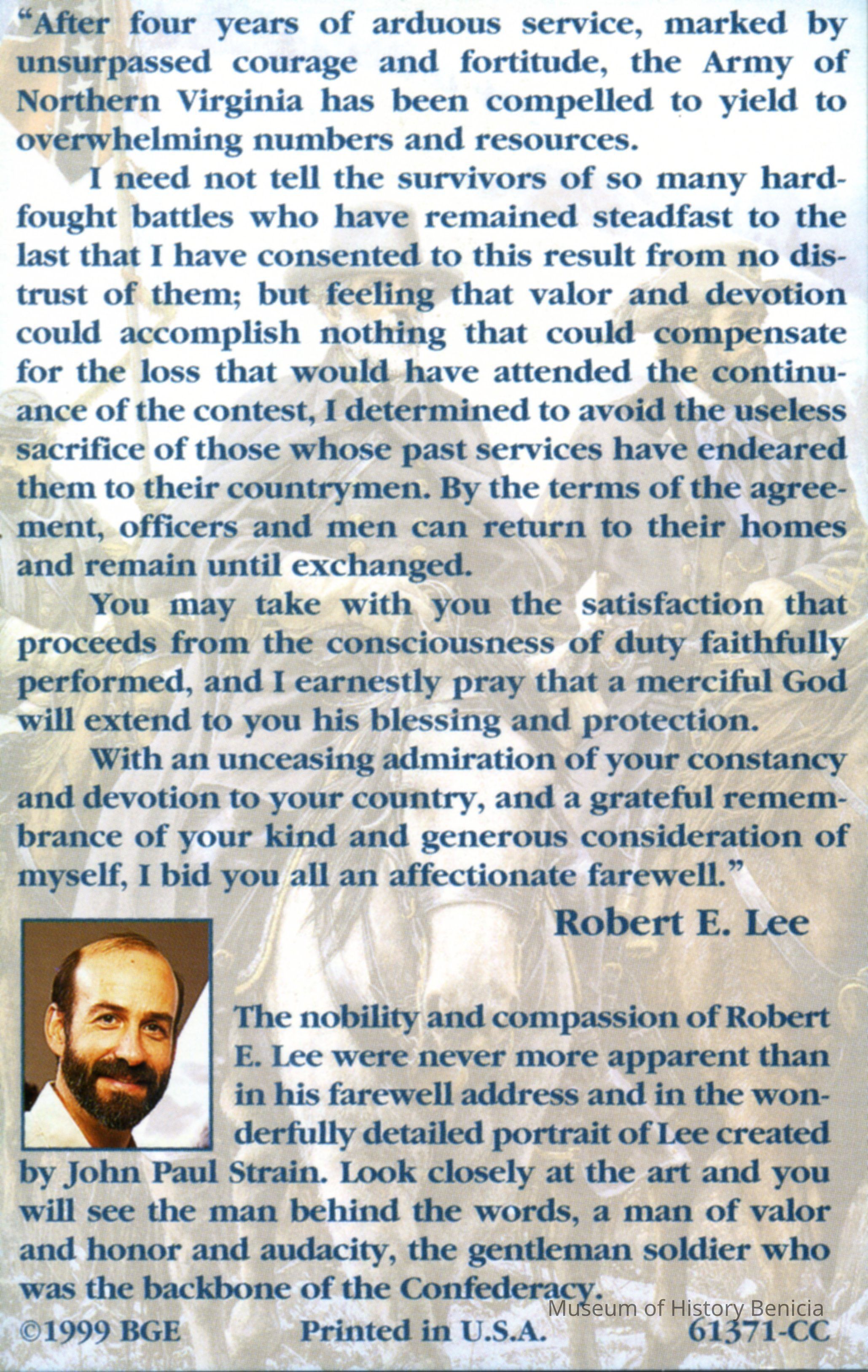 Robert E. Lee's farewell address is printed on the back of the card. There is also a short paragraph under the quote with more information about Lee.Collection