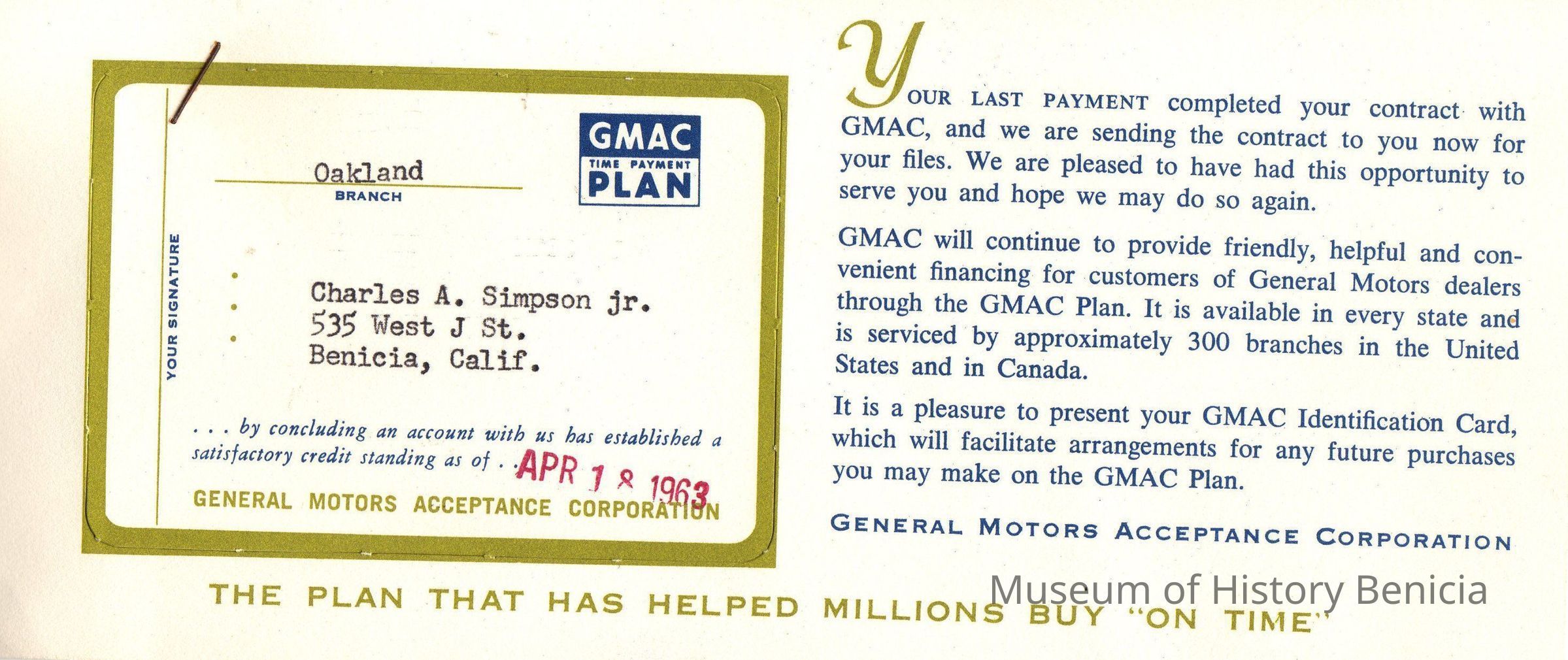 GMAC (General Motors Acceptance Corporation) Time Payment Plan for Charles A Simpson jr., 535 West J St. Benicia CA. The card was to be used when arranging purchases on the Time Payment Plan