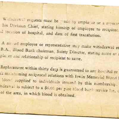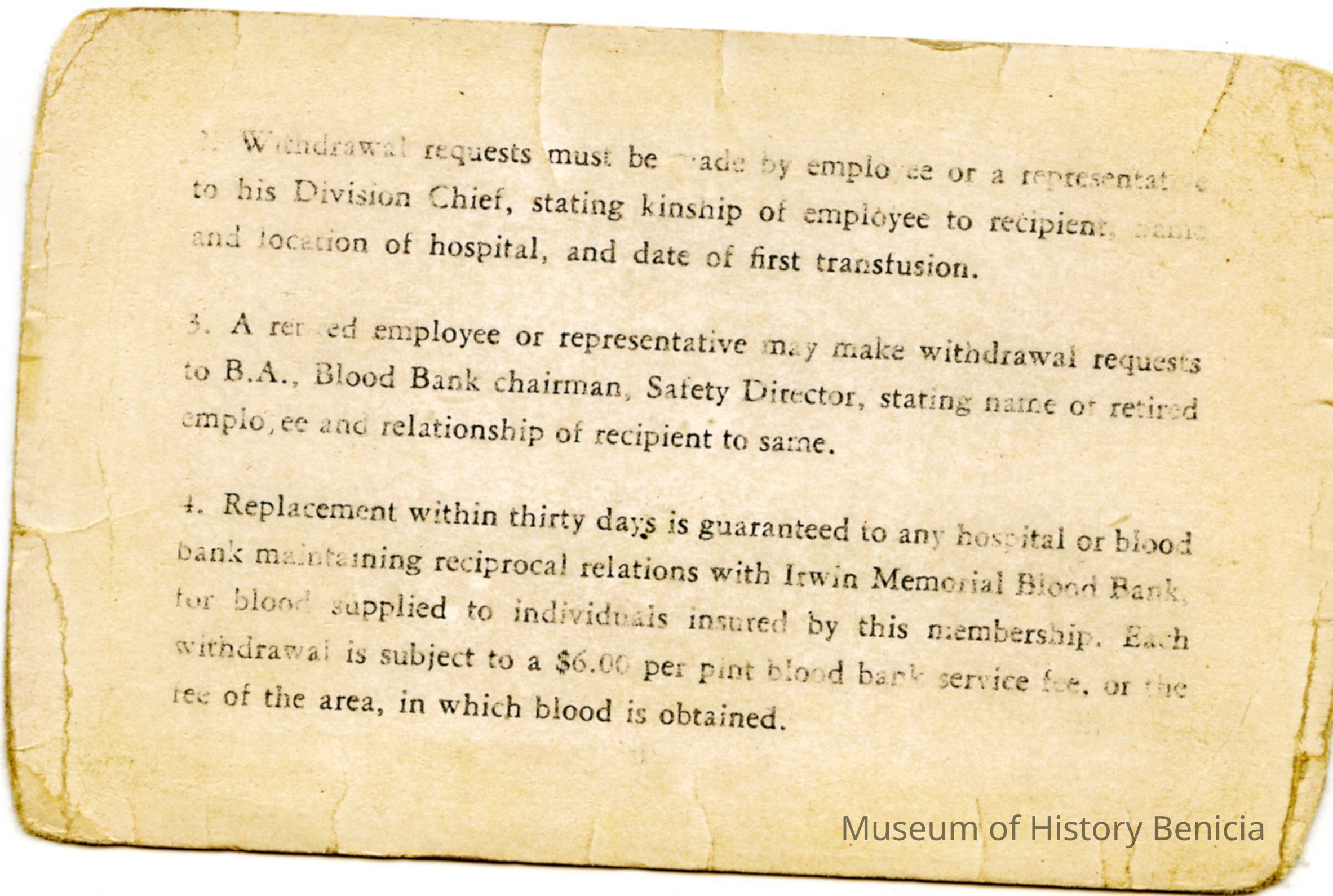 The card allows Mr Perrin to withdraw blood from the Benicia Arsenal account at the Irwin Memorial Blood Bank in San Francisco. There was a $6.00 per pint withdrawl fee.Collection