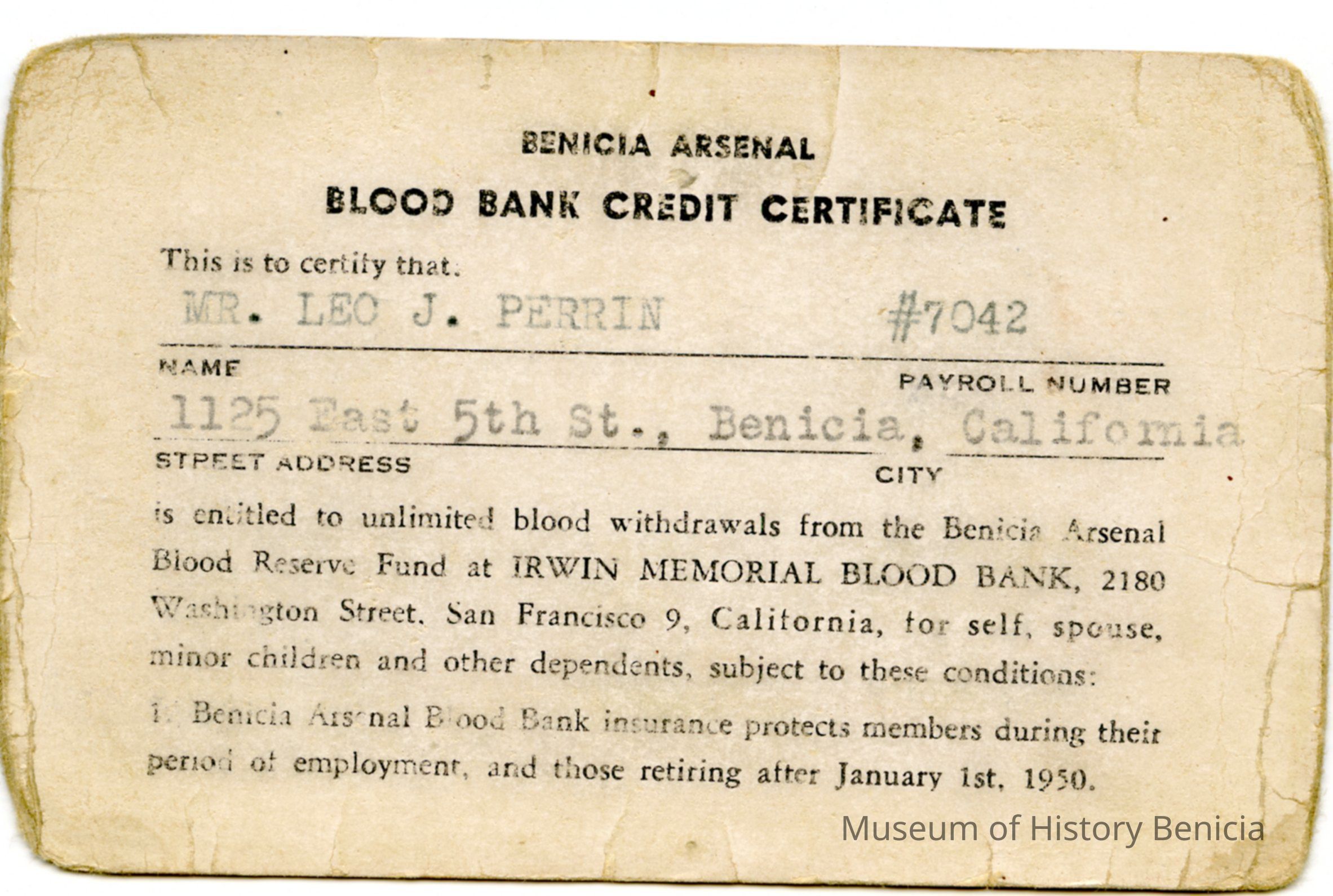 This is a card for the Benicia Arsenal Blood Bank Credit Certificate. It is for Mr. Leo J. Perrin (#7042) who lived at 1125 East 5th St. in Benicia California.