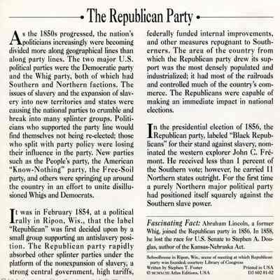 Back of card has a summary of the political party. Mentions Democratic Party, Whig Party, and presidential election of 1856.