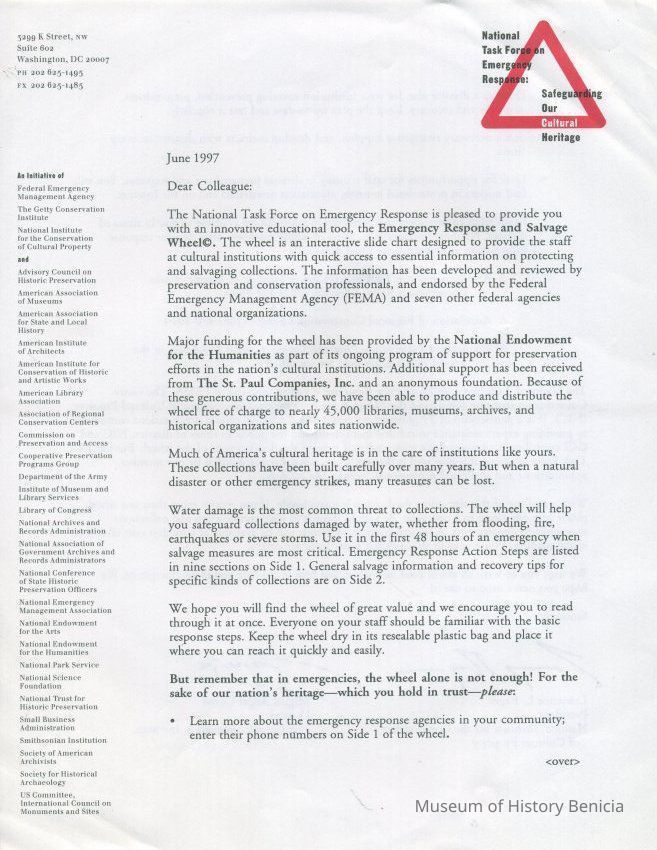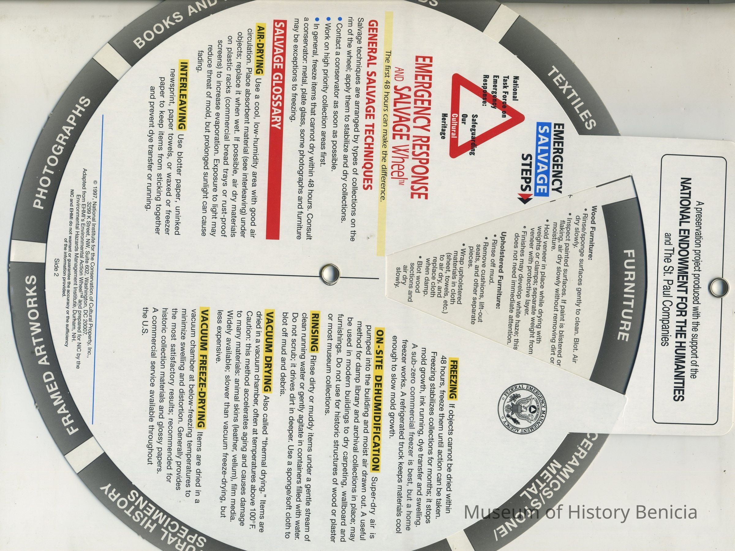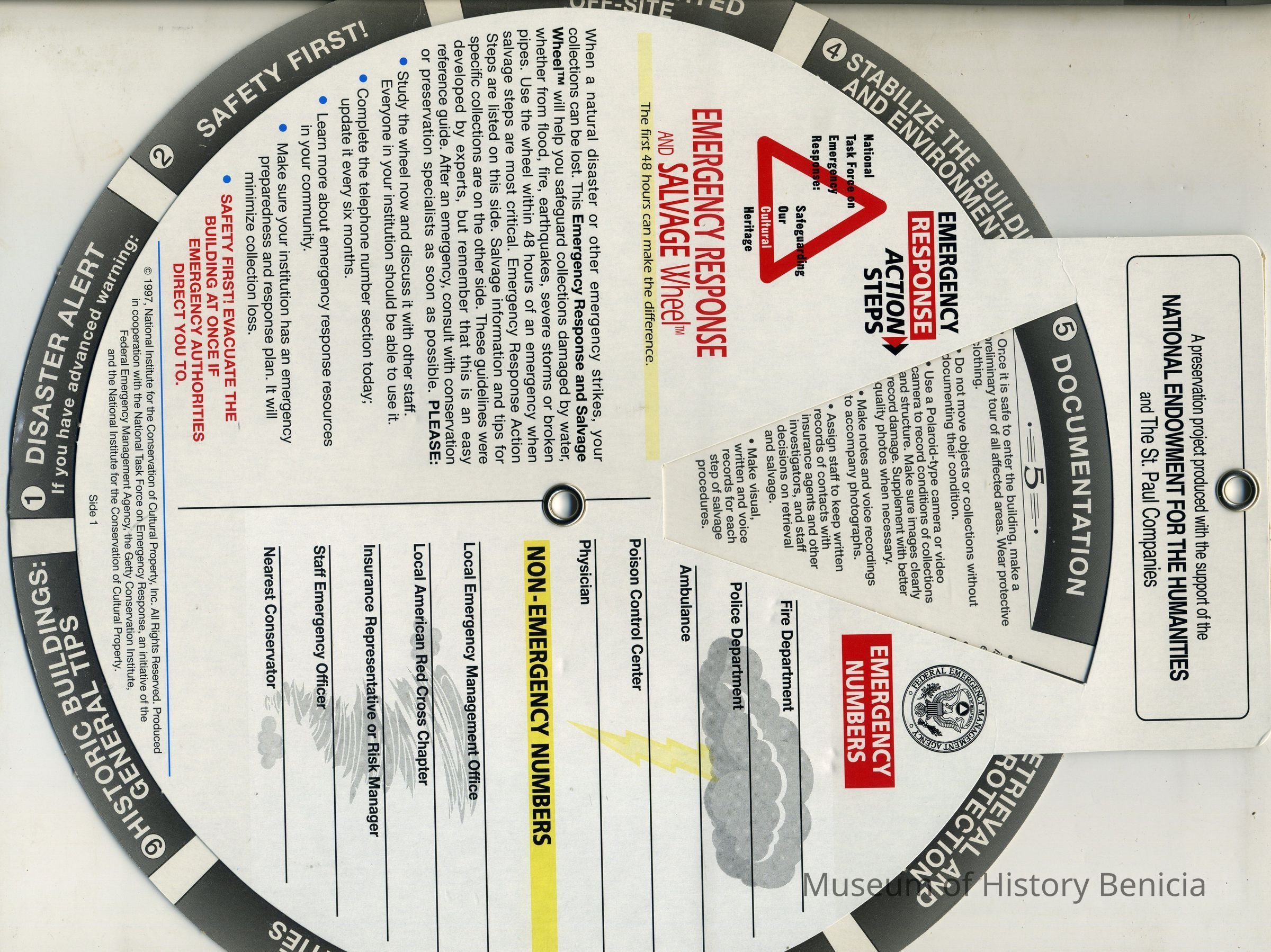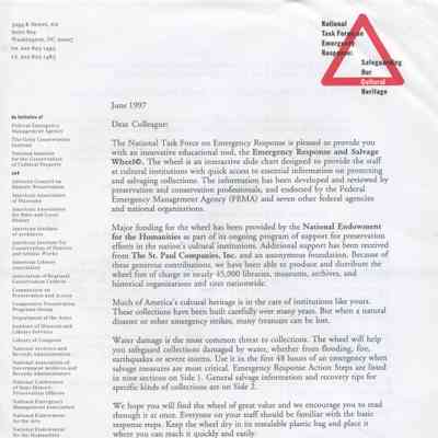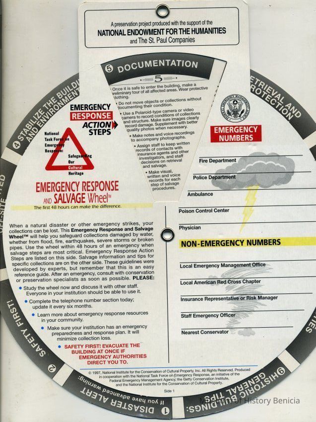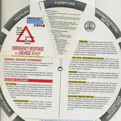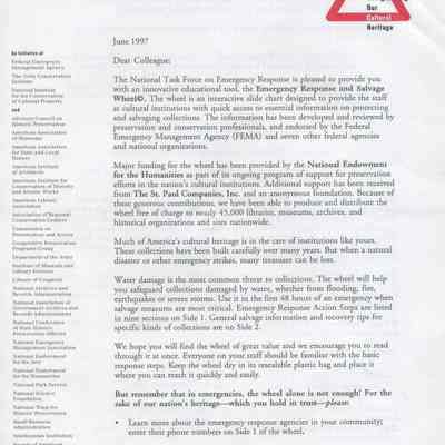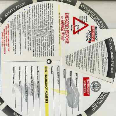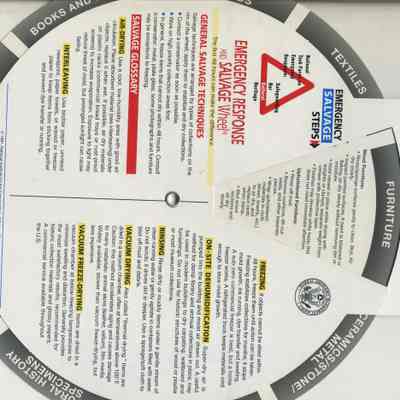 This is a "Disaster informational card/wheel". It shows the steps to take in case of or before a disaster strikes. It deals with various types of objects on one side and steps to be taken in a disaster on the other side. It was made for cultural institutions in the US.Collection