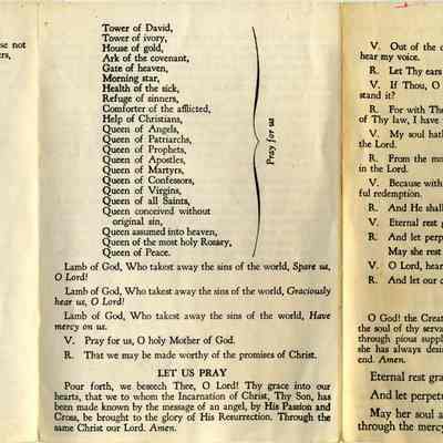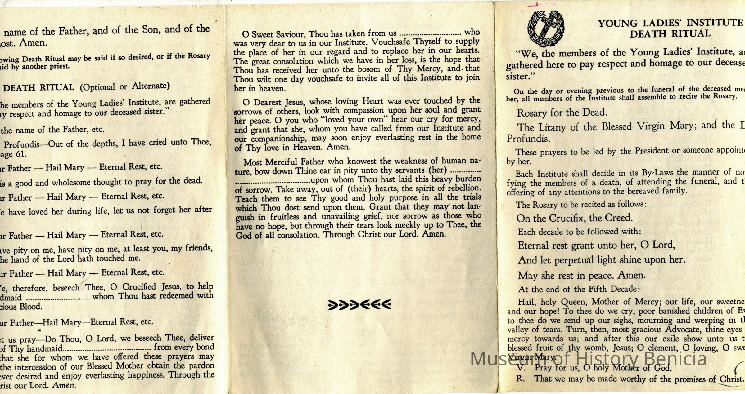 This is a card prepared by the Young Ladies Institute for instructions to be followed when one of their members dies. The title is "Young Ladies Institute Death Ritual".