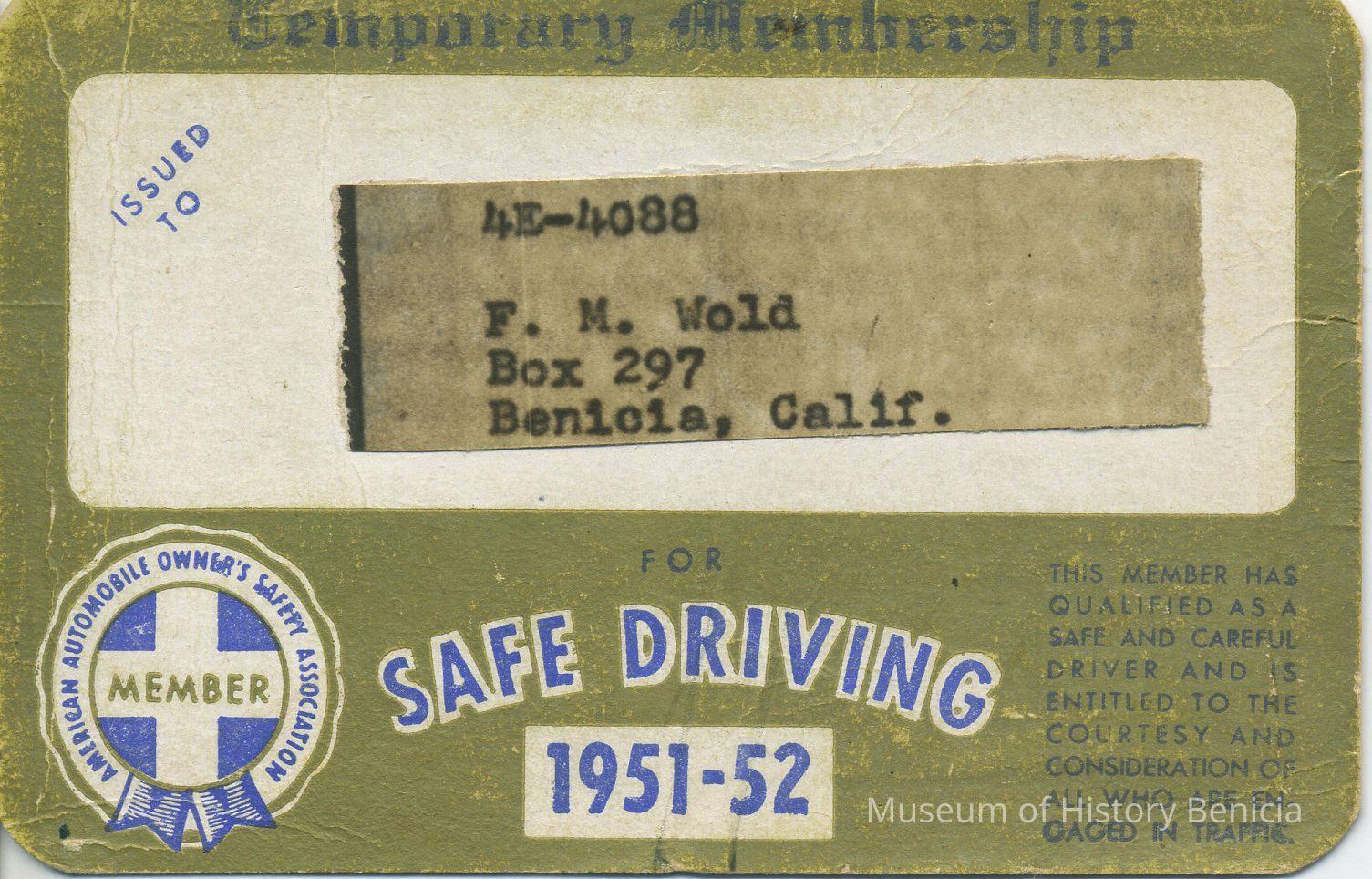 F. N. Wold, Box 297, Benicia Calif. #4E-4088 1951-52