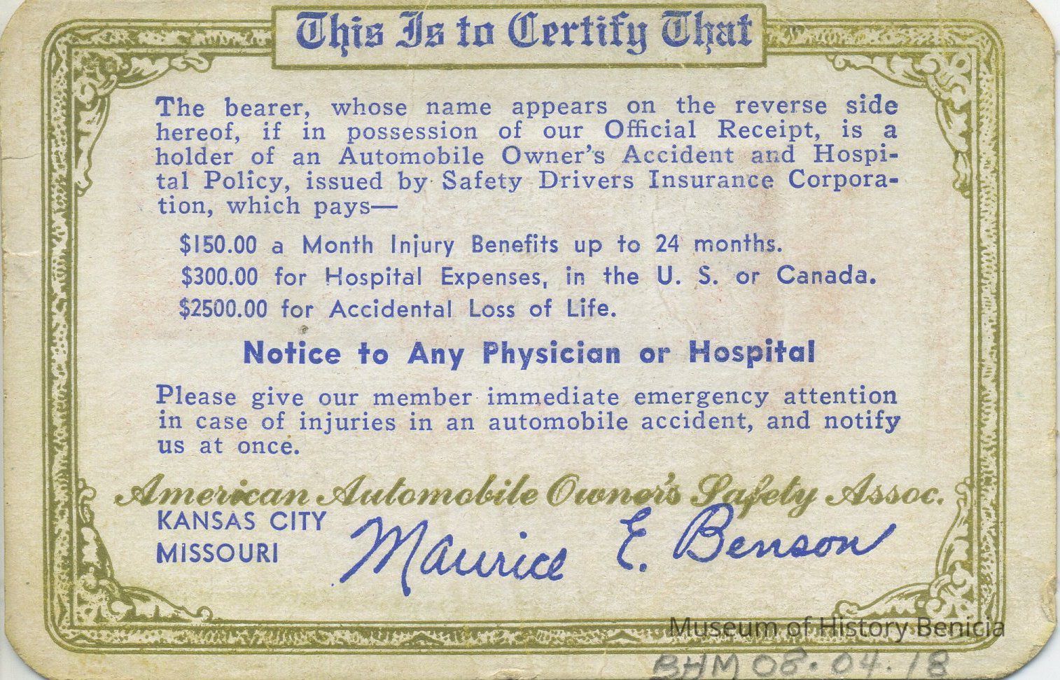 signed by Maurice E. Benson (position/job unknown)