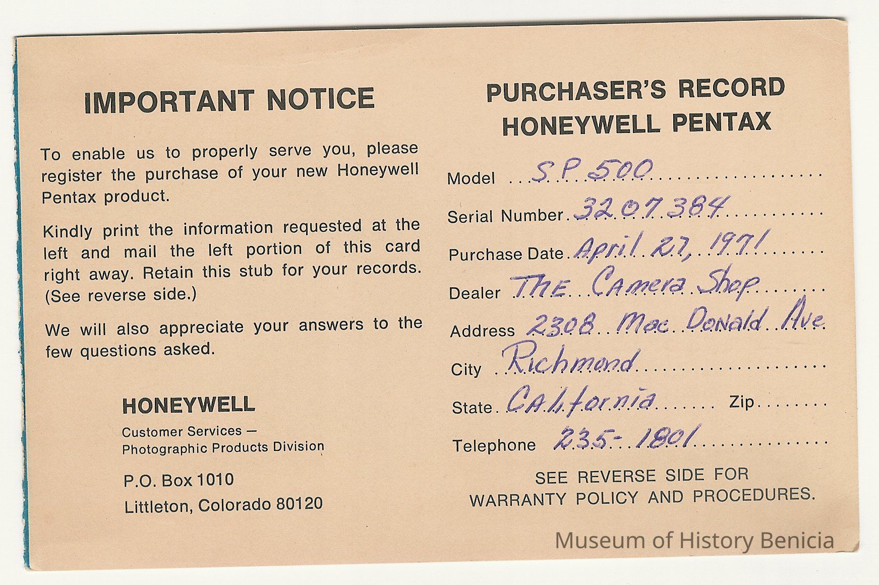 Honeywell Pentax warranty card