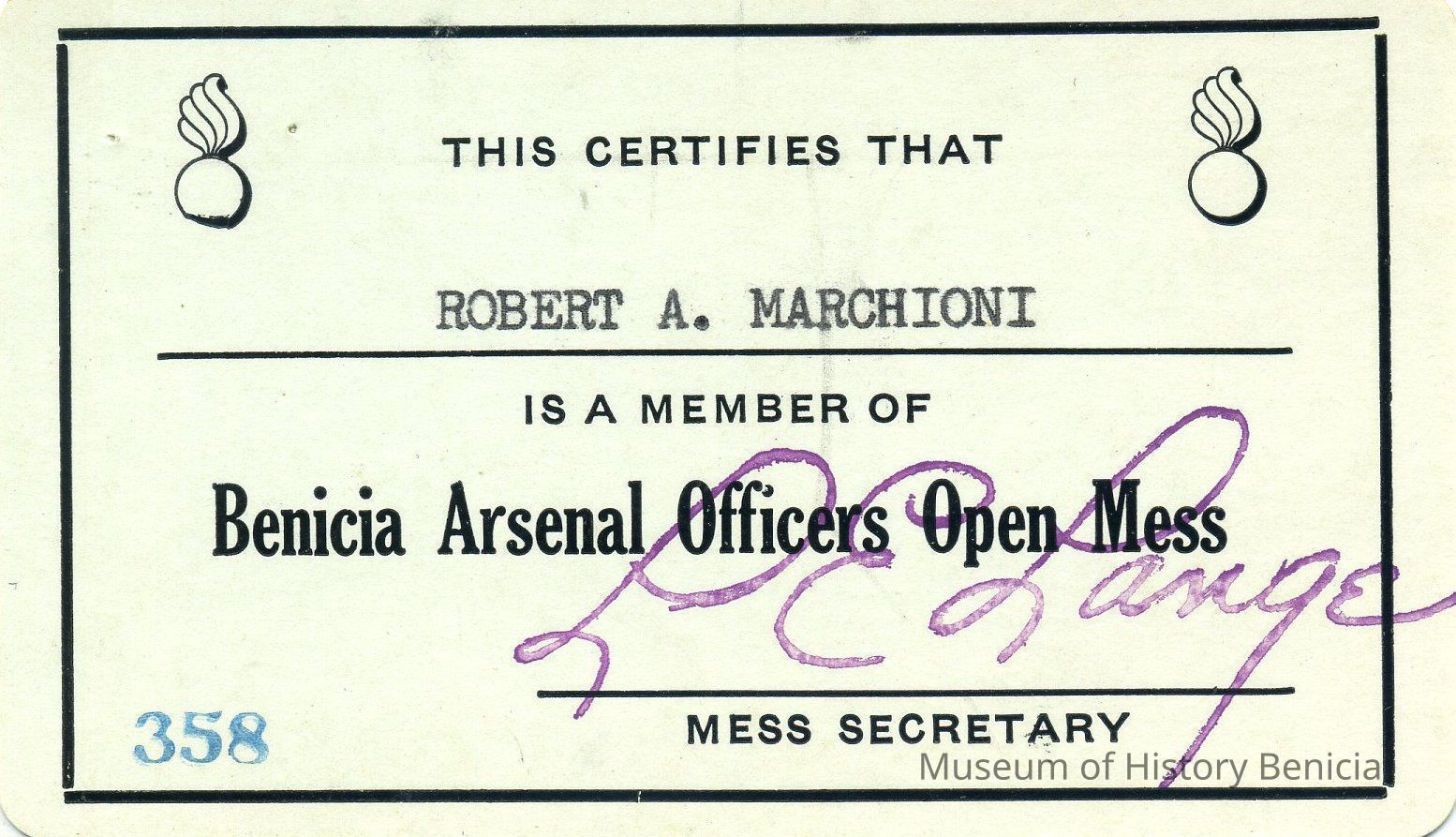 It certifies that Robert A. Marchioni is a member of the Benicia Arsenal Officers Ope Mess, signed by L. E. Lange, Mess Secretary; Card #358 2-3/8" x 3-7/8"Collection