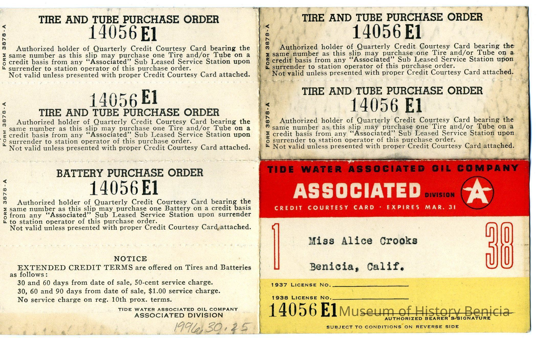 Red, yellow and white card with 1 Battery Purchase Order and 4 Tire and Tube Purchase Order coupons attached. #14056E1