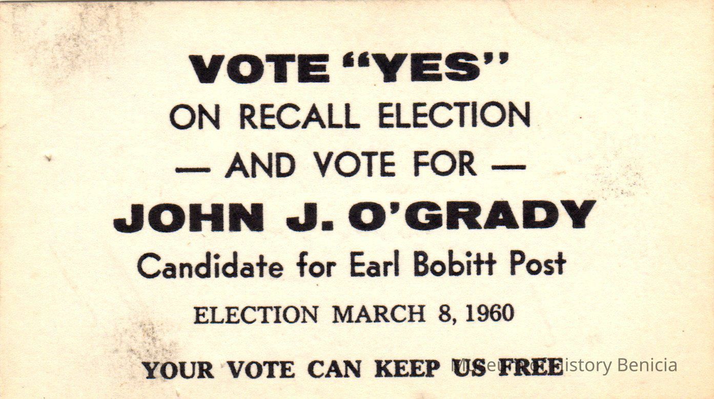 Political card for John J O'Grady 1960. Also asking for support of the recall. On the back is a receipe for some kind of rub.