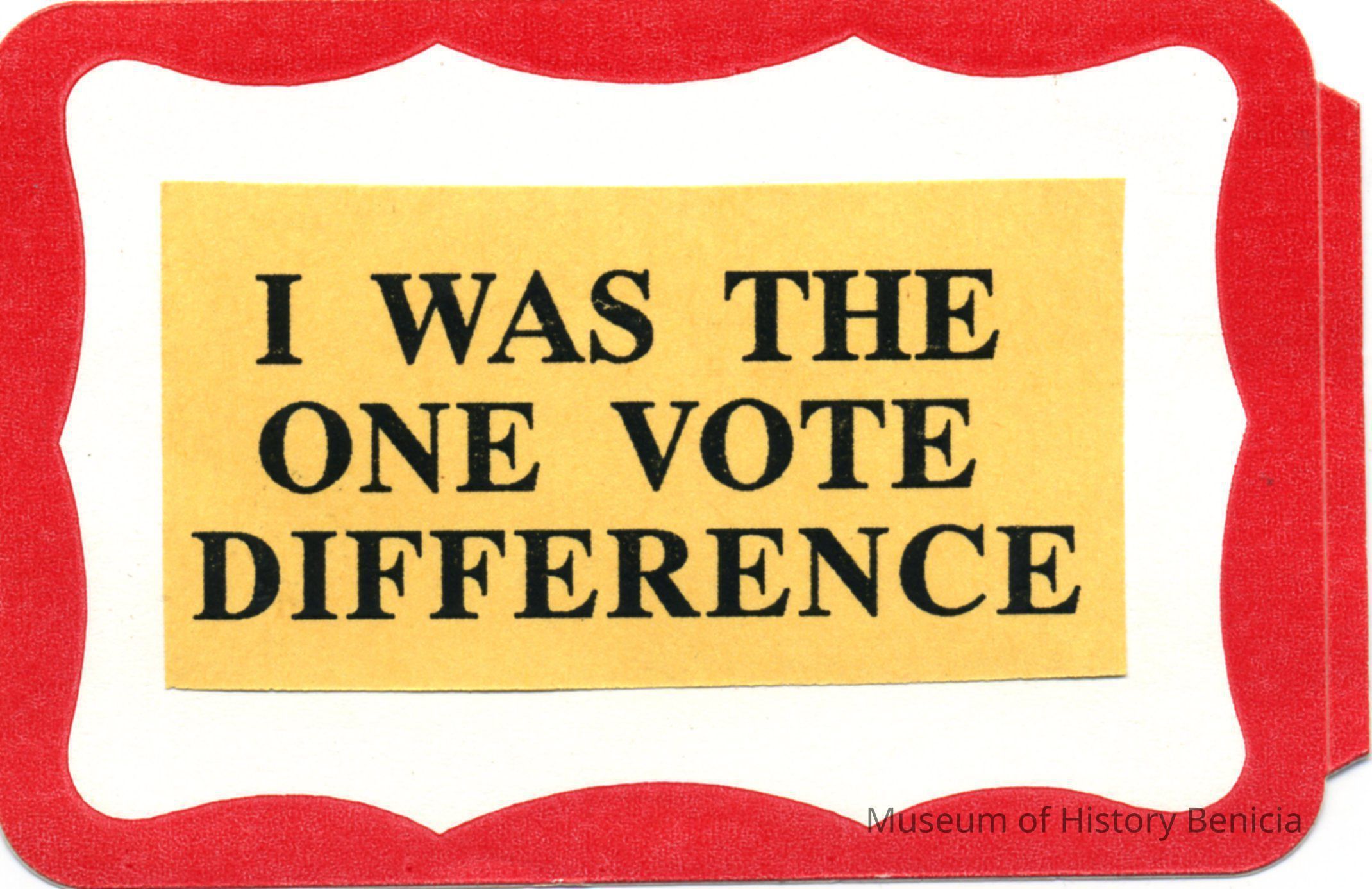 Sticker saying "I was the one vote difference". It was received by the Museum Director after the election of Pepe Arteaga to the Benicia City Council.Collection