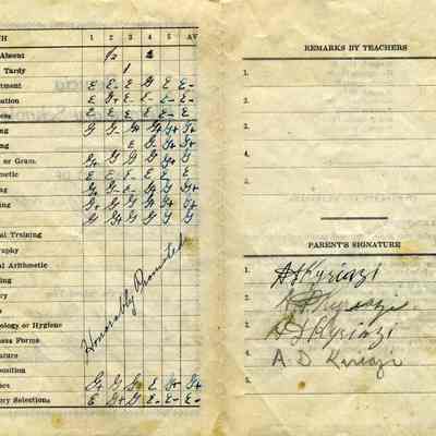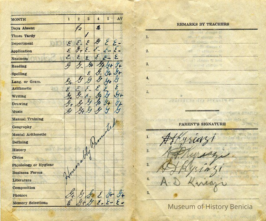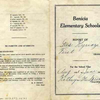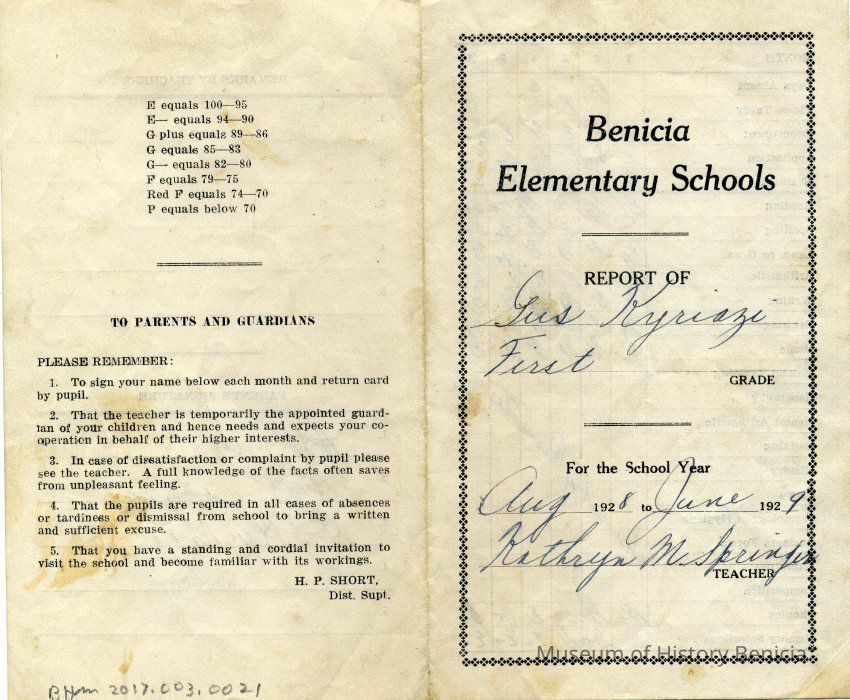This is a report card for Gus Kyriazi from Benicia Elementary school for 1929 when he was in the First grade. The teacher was Kathryn M Springer.Collection