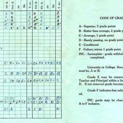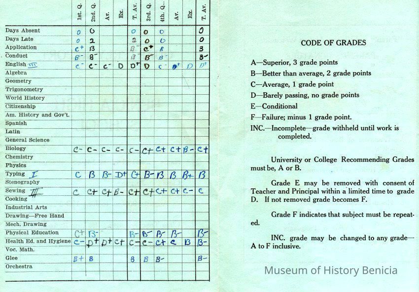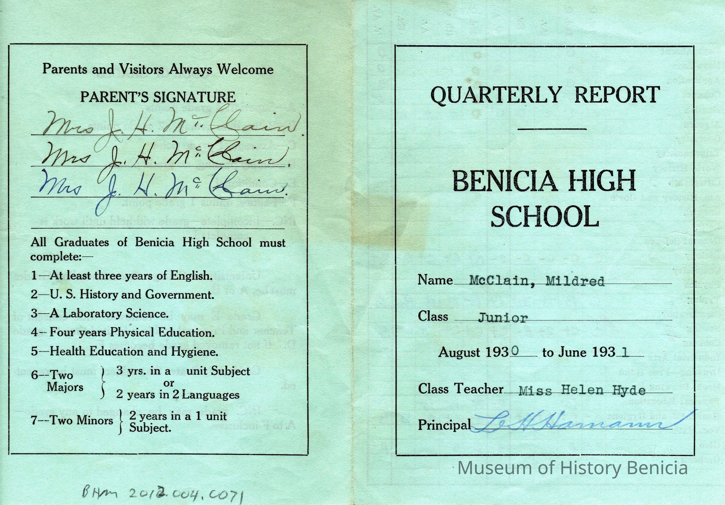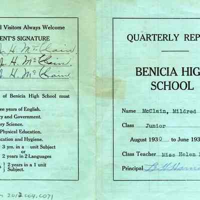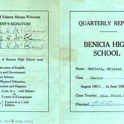 Mildred McClains Benicia High School report card from 08/1930 - 06/1931. It is her Junior report card and the class teacher is Miss Helen Hyde.Collection