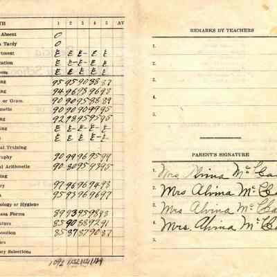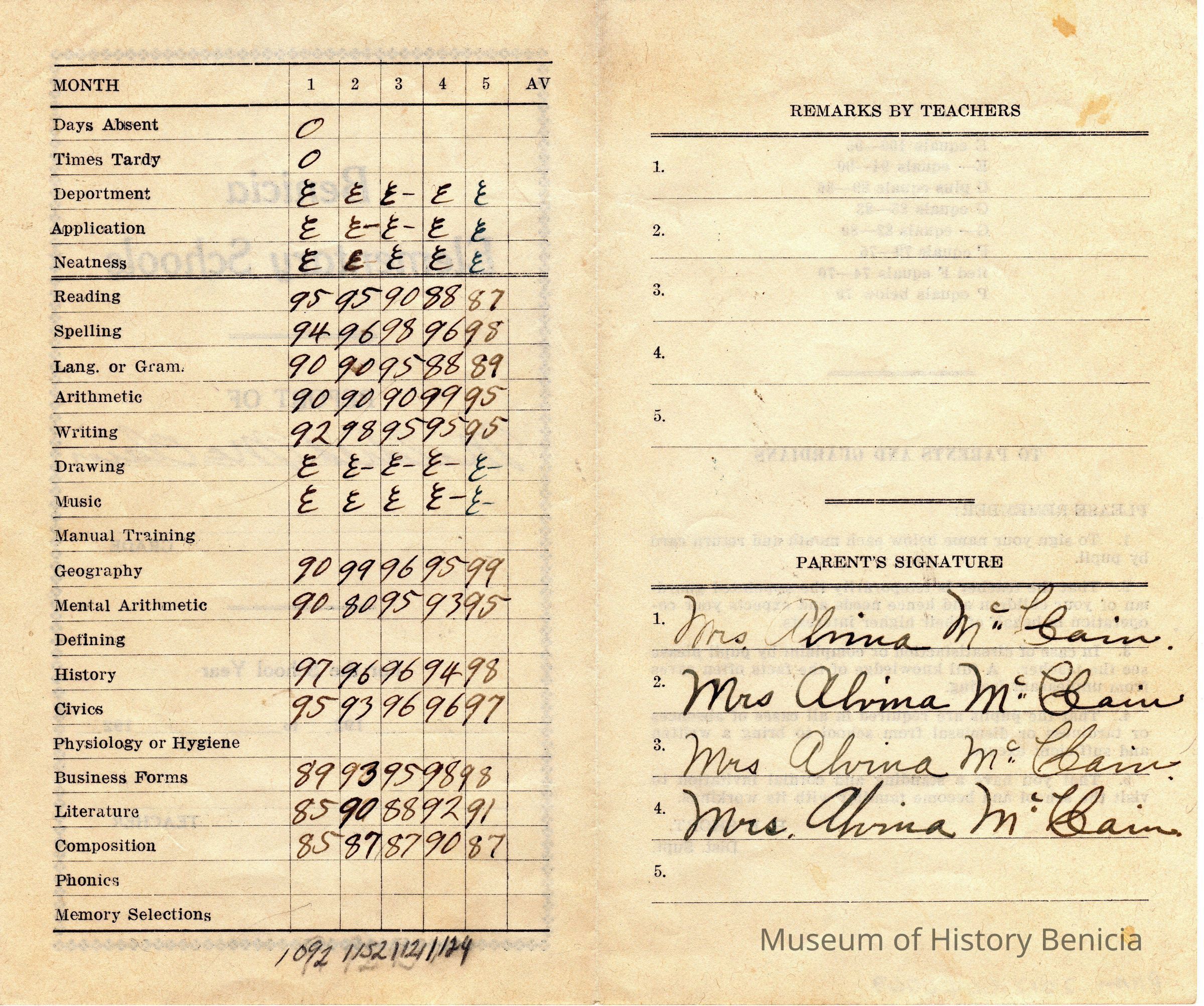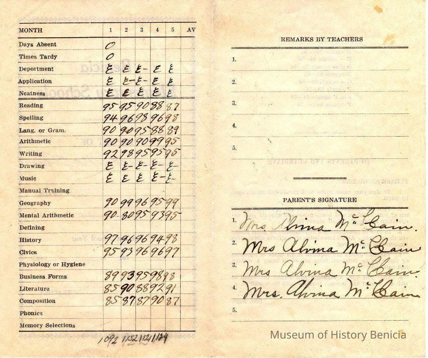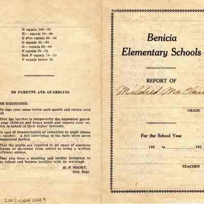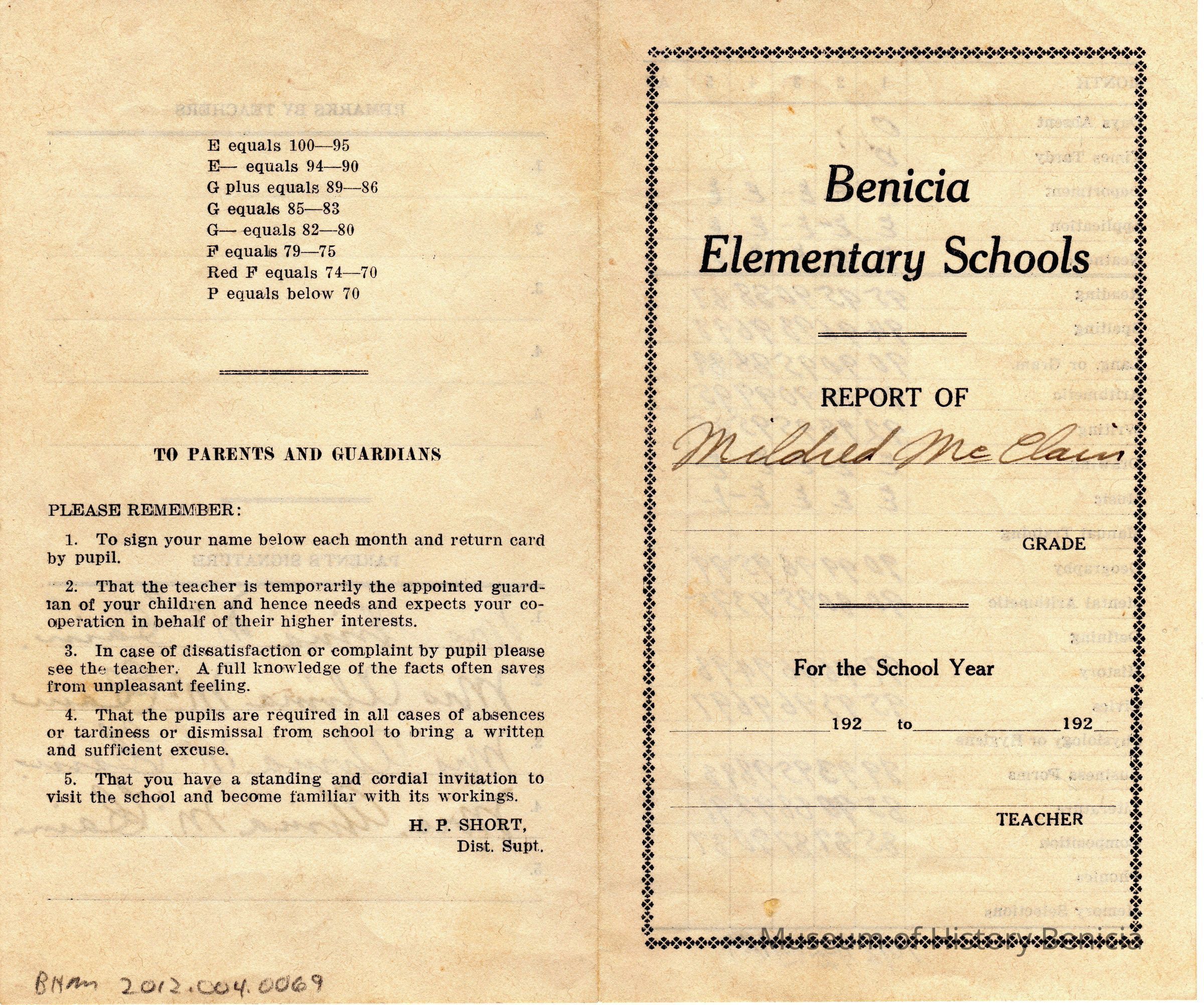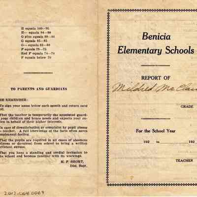 Mildred McClains Benicia Elementary School report card not dated. Assume it is her eigth grade report card but can't be sure..