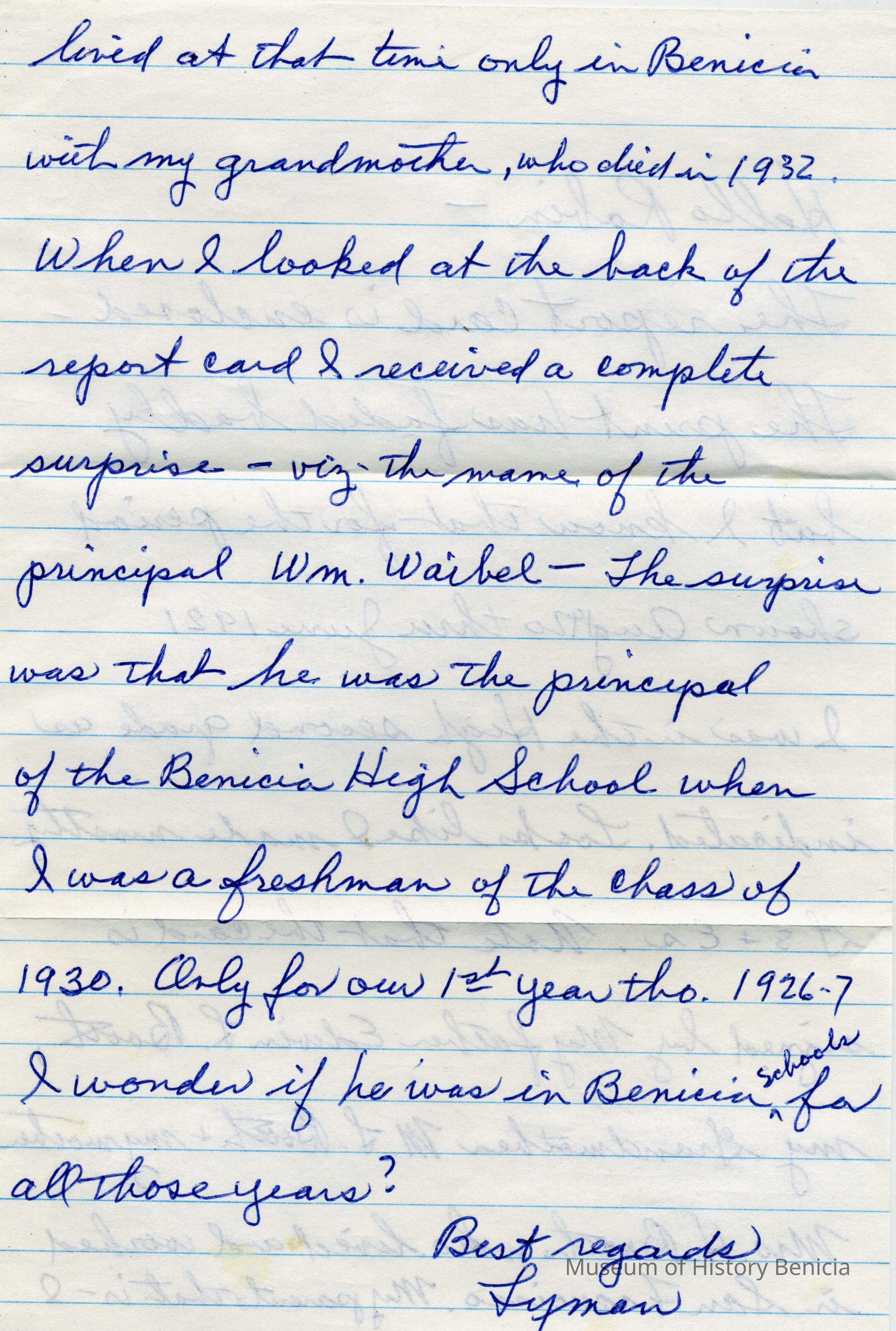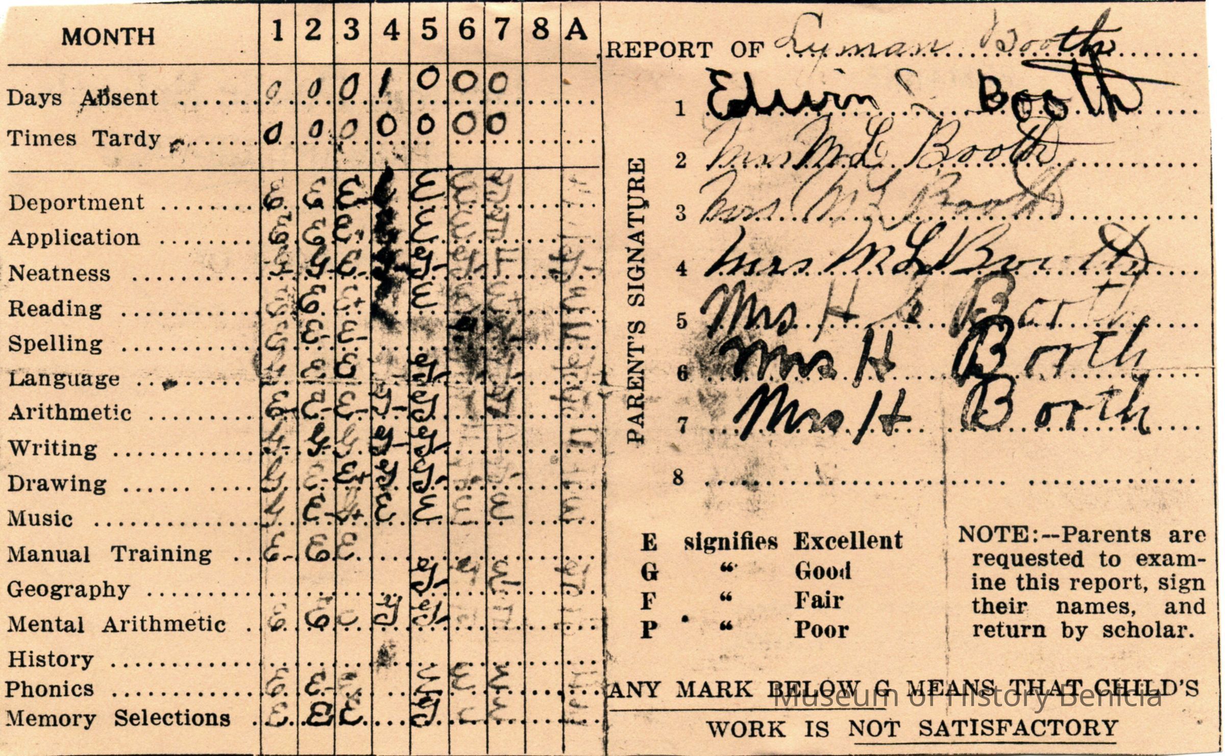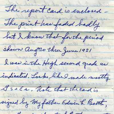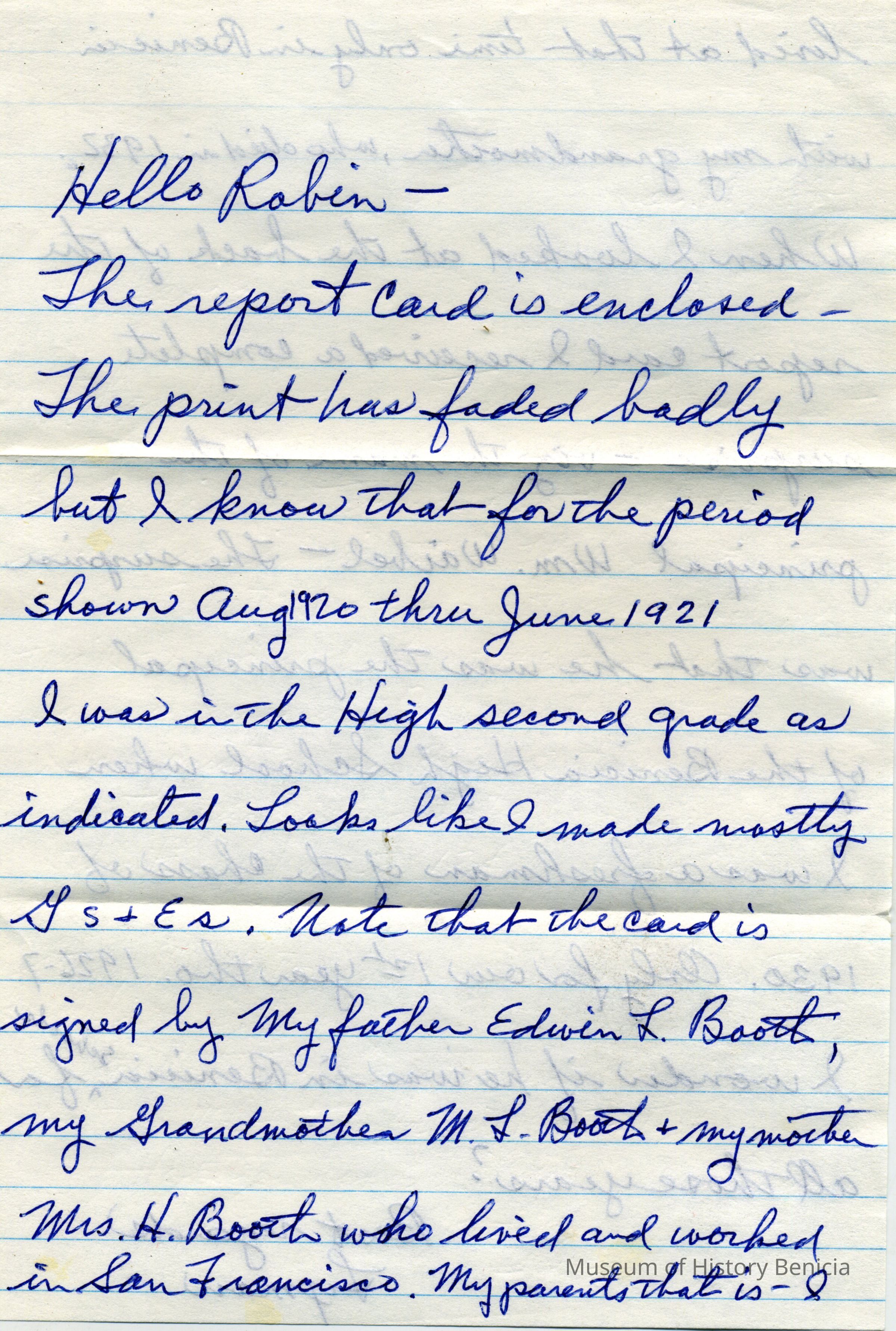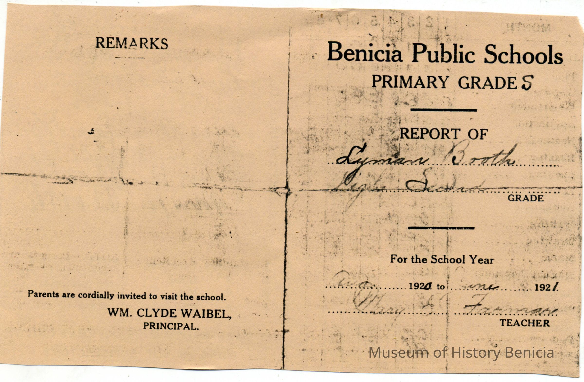 This is a copy of the report card for Lyman Booth from the West End Primary School in Benicia for the 1920/1921 school year. Also attached is a letter from Mr. Booth describing the report card. (The original was on temporary loan at the Museum but has been returned.)Collection