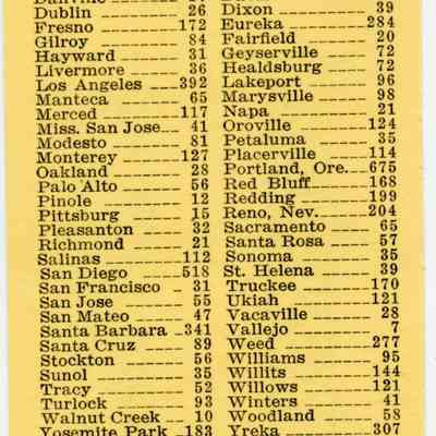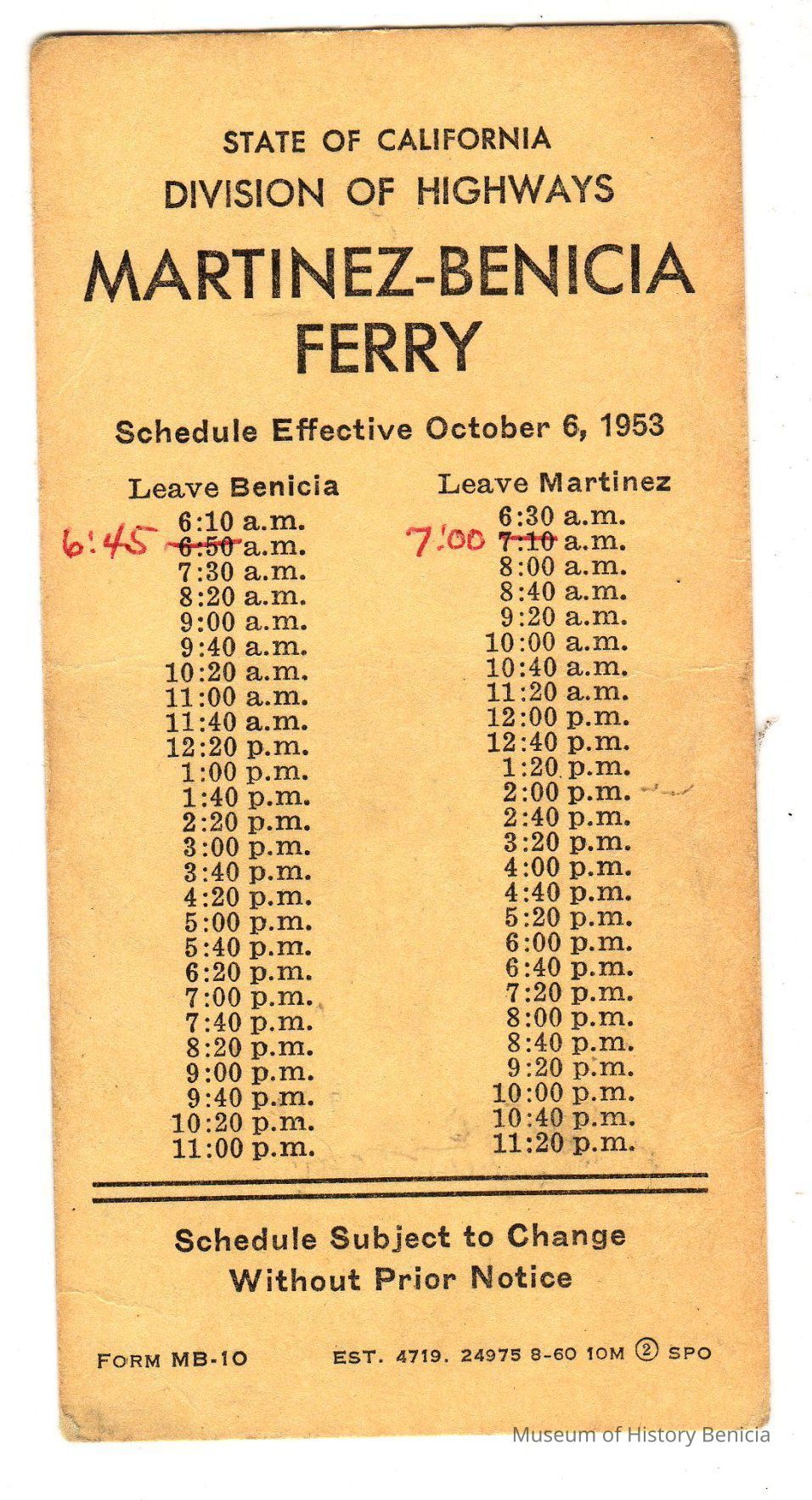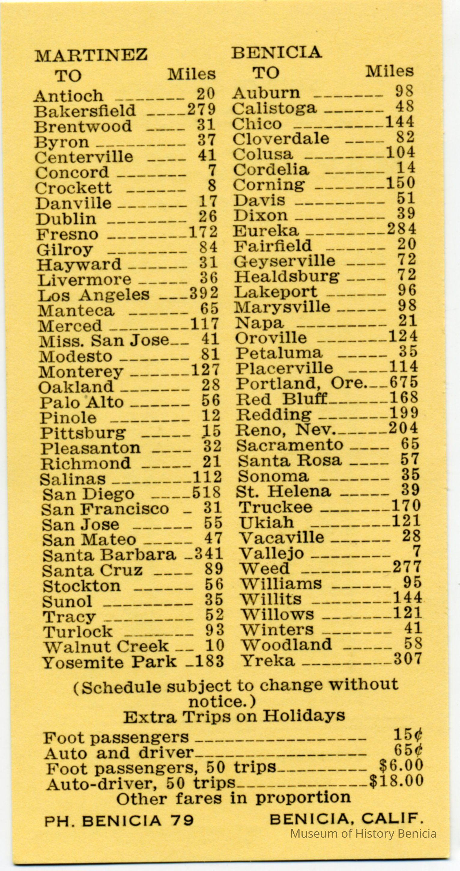 Martinez-Benicia Ferry Schedule printed in black ink on one side of a manila-colored card; effective October 6, 1953, on the back is a printed listing of mileage distances from various cities in California to Martinez and to Benicia.