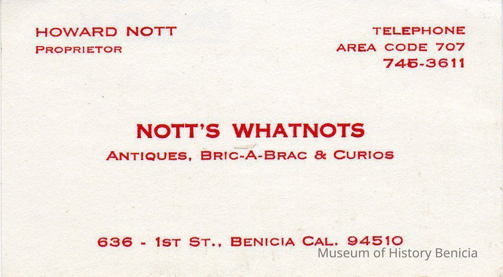Business card for Howard Nott, proprietor. "Nott's What-Nots, Antiques, Bric-a-brac and Curios"