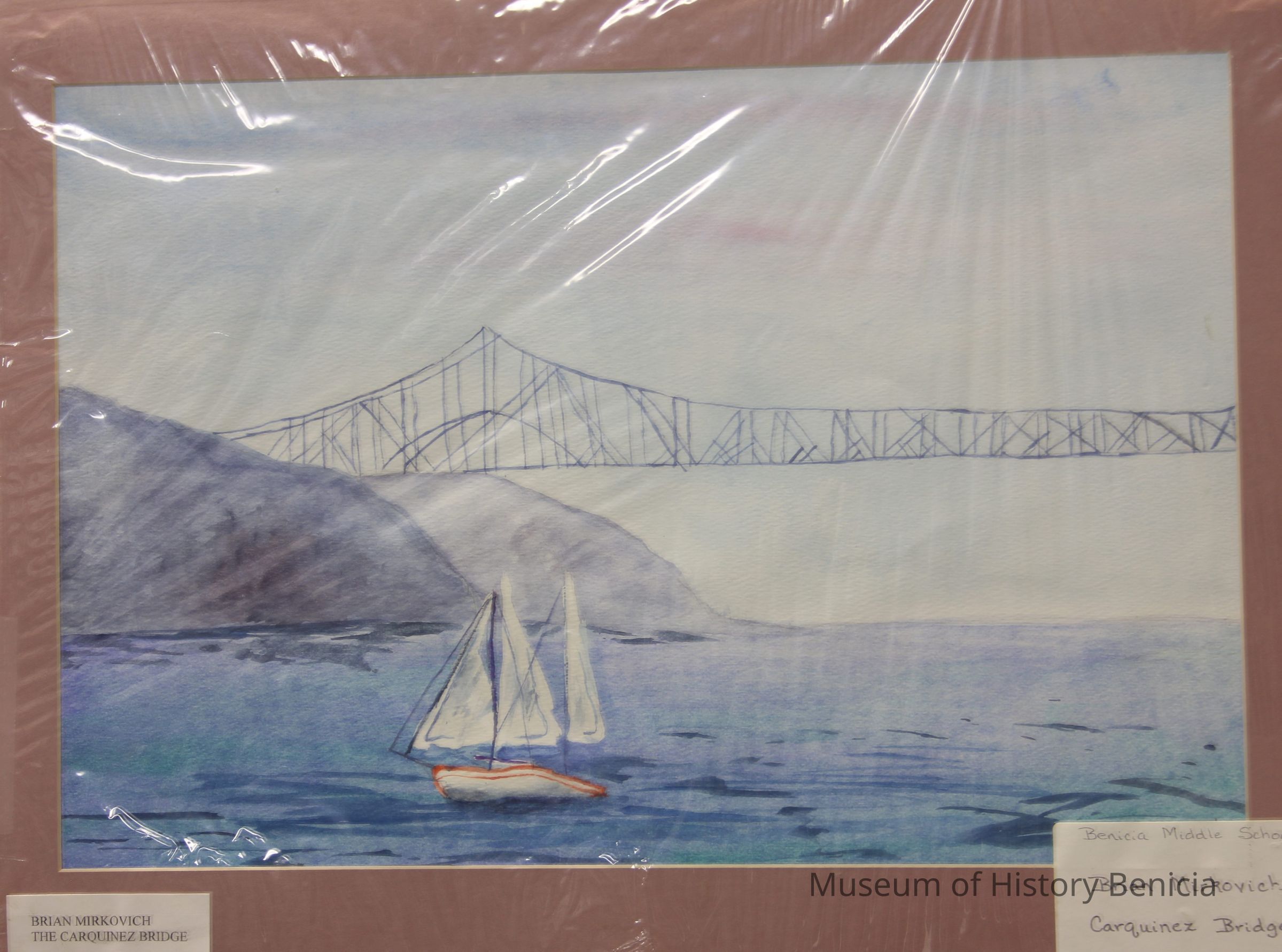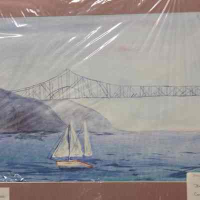 "Carquinez Bridge" watercolor painting done by Brian Mirkovich in 1995, a Benicia Middle School student matted and mounted on foamcore