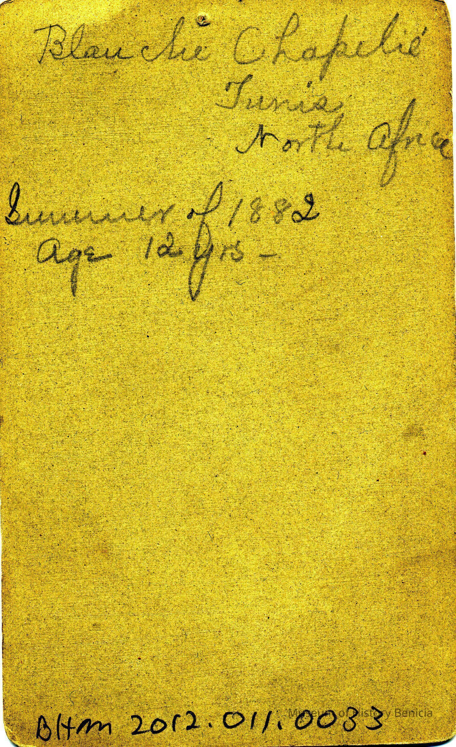 Carte-de-visite of a young girl. On the back it says "Blanche Chapelie Tunis North Africa Summer of 1882 age 12 years." She's wearing a necklace with her name on it.