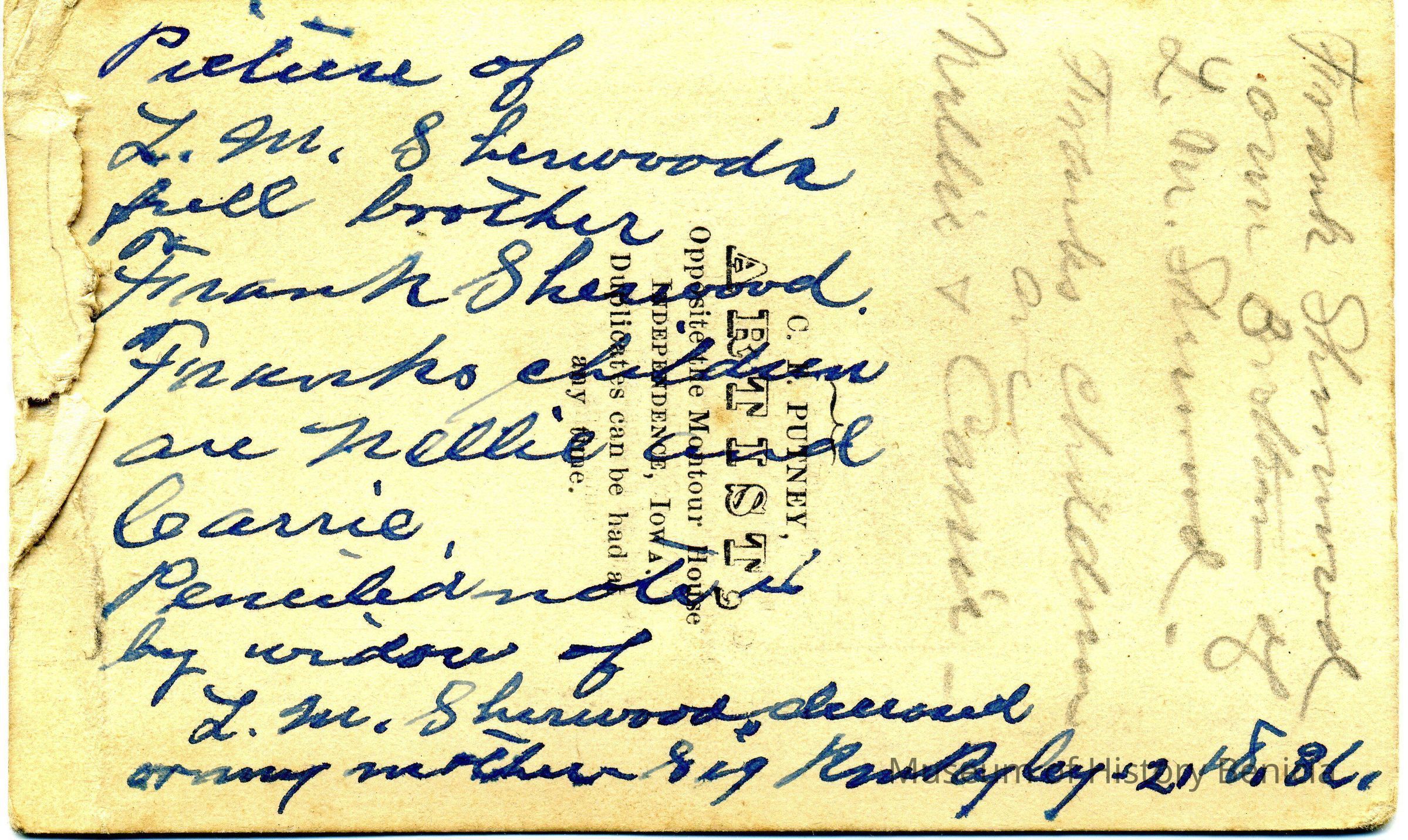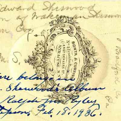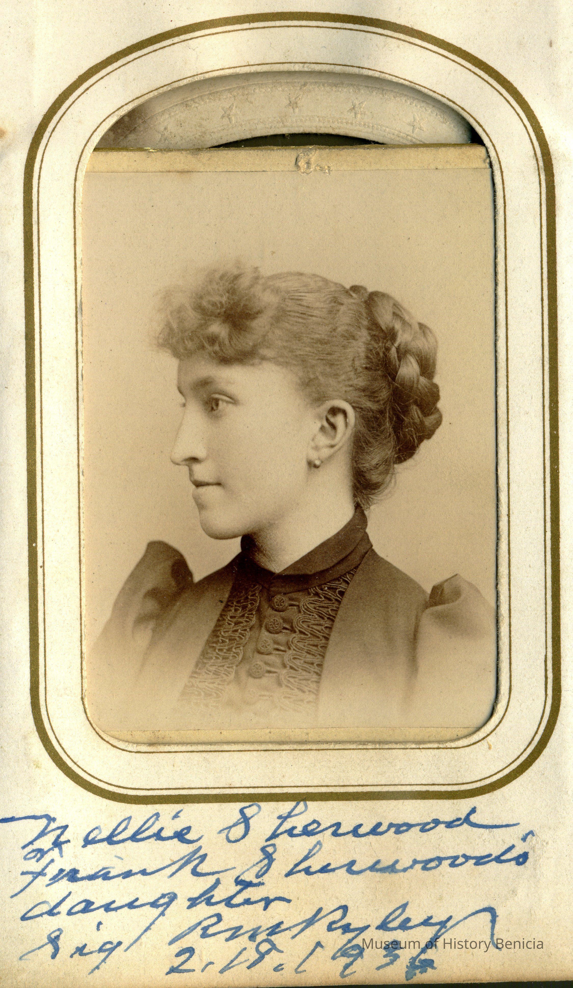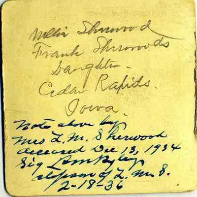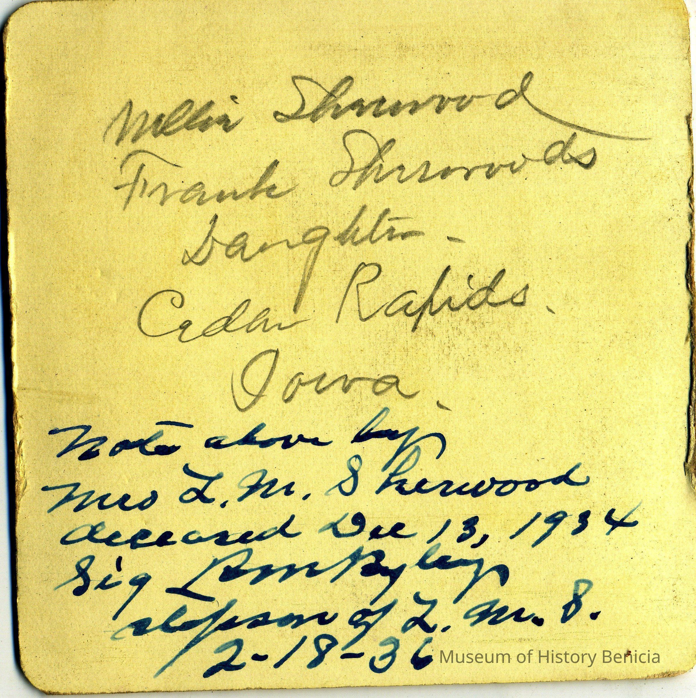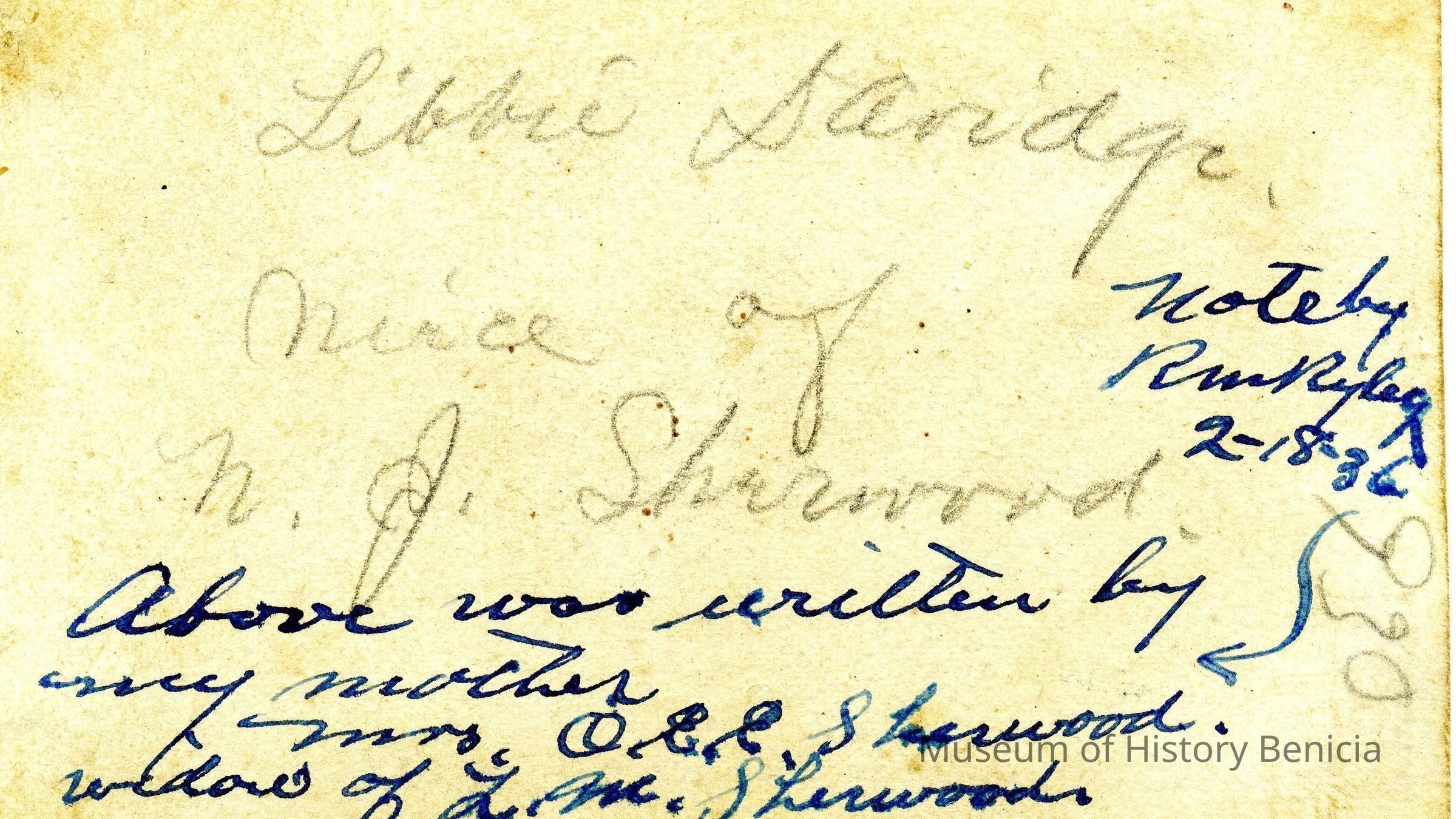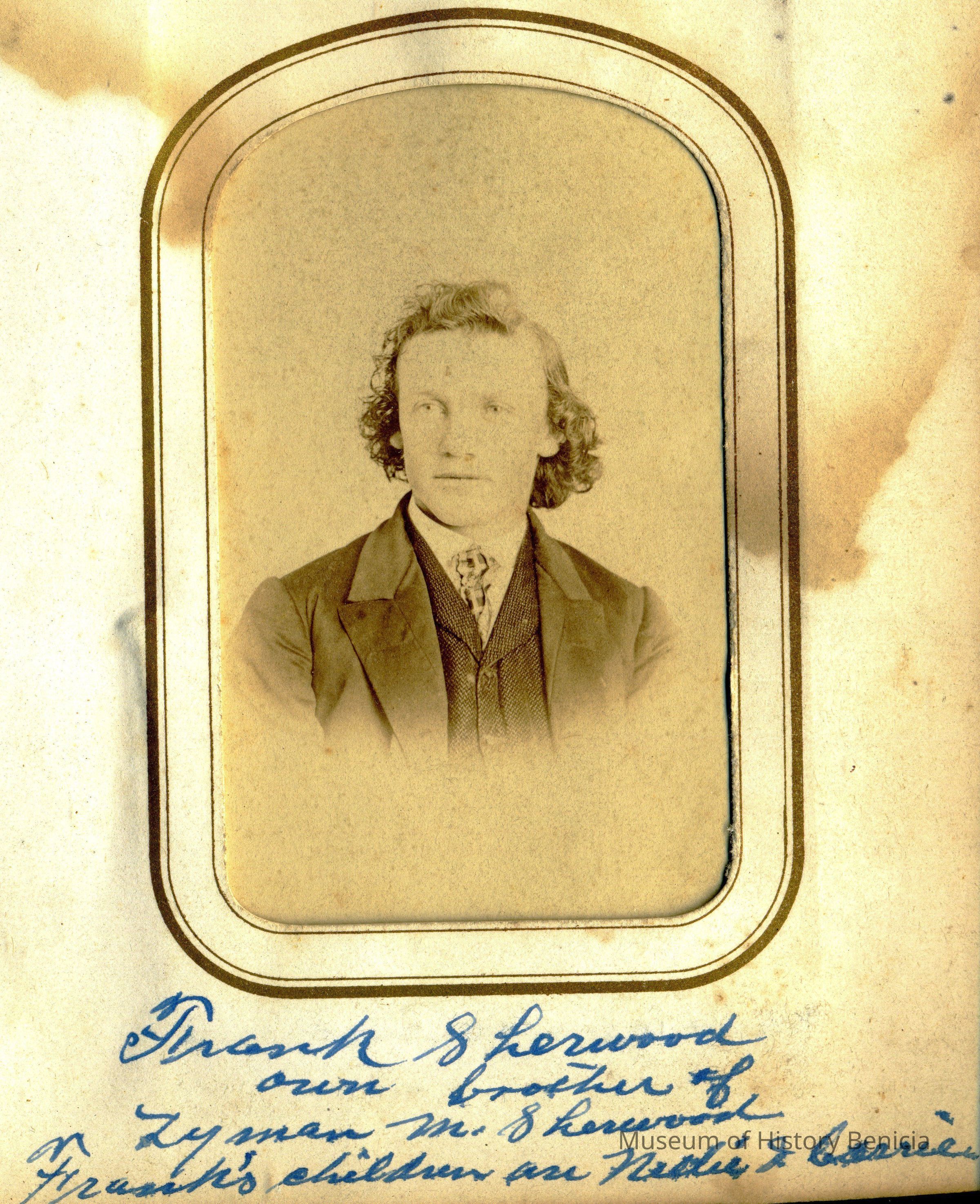 The captions shown in the album are in part based on information from Mr Sherwood's step-son, Ralph M. Ryley of Benicia California. Mr Ryley was the son of Emman Esther Snyder and George Washington Ryley, They divorced in 1883. Esther married Lyman Mumford Sherwood in 1897. Ralph M Ryley died in Benicia on 12/14/1943.Collection