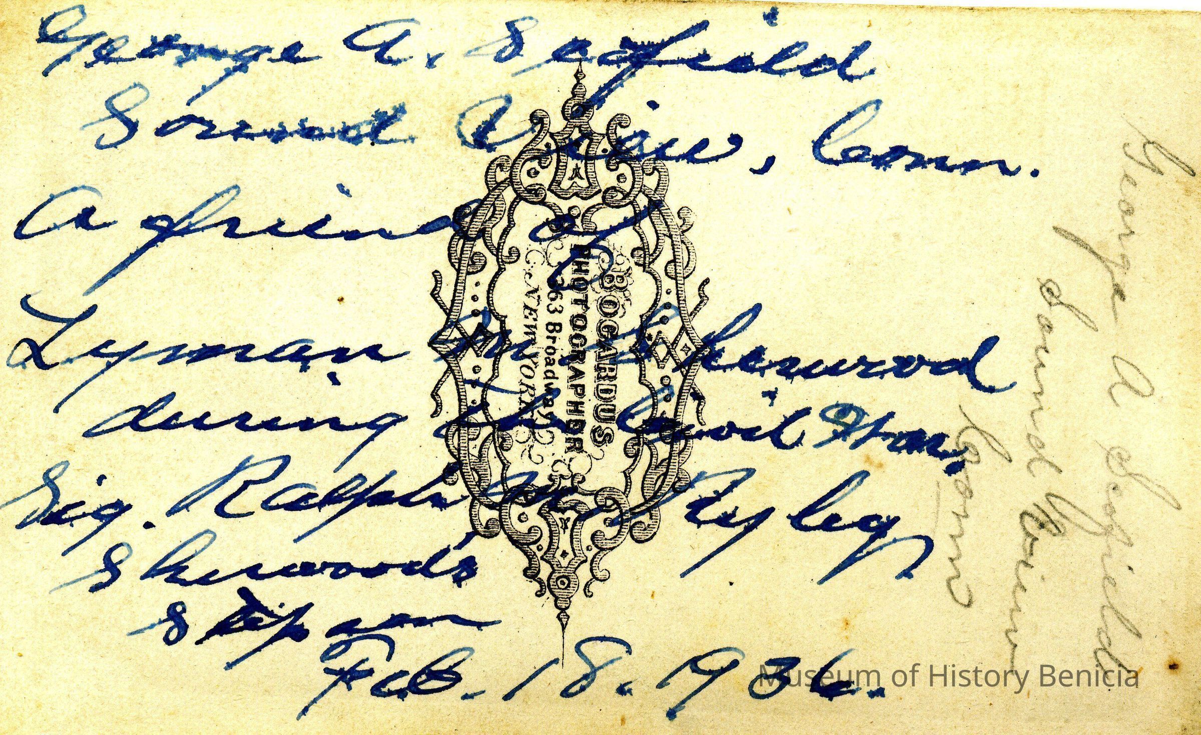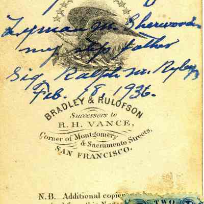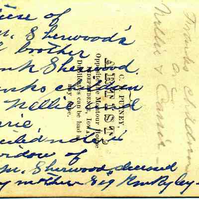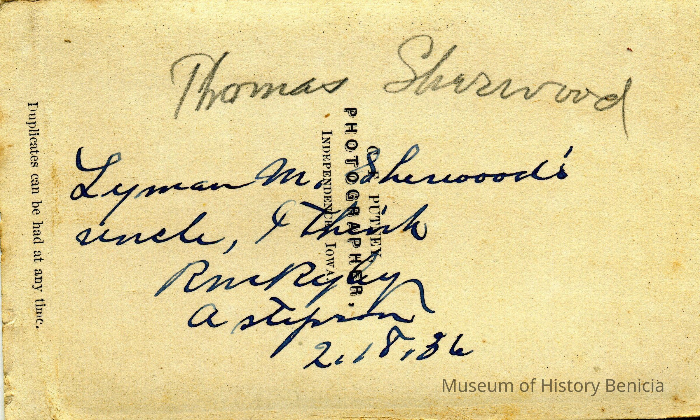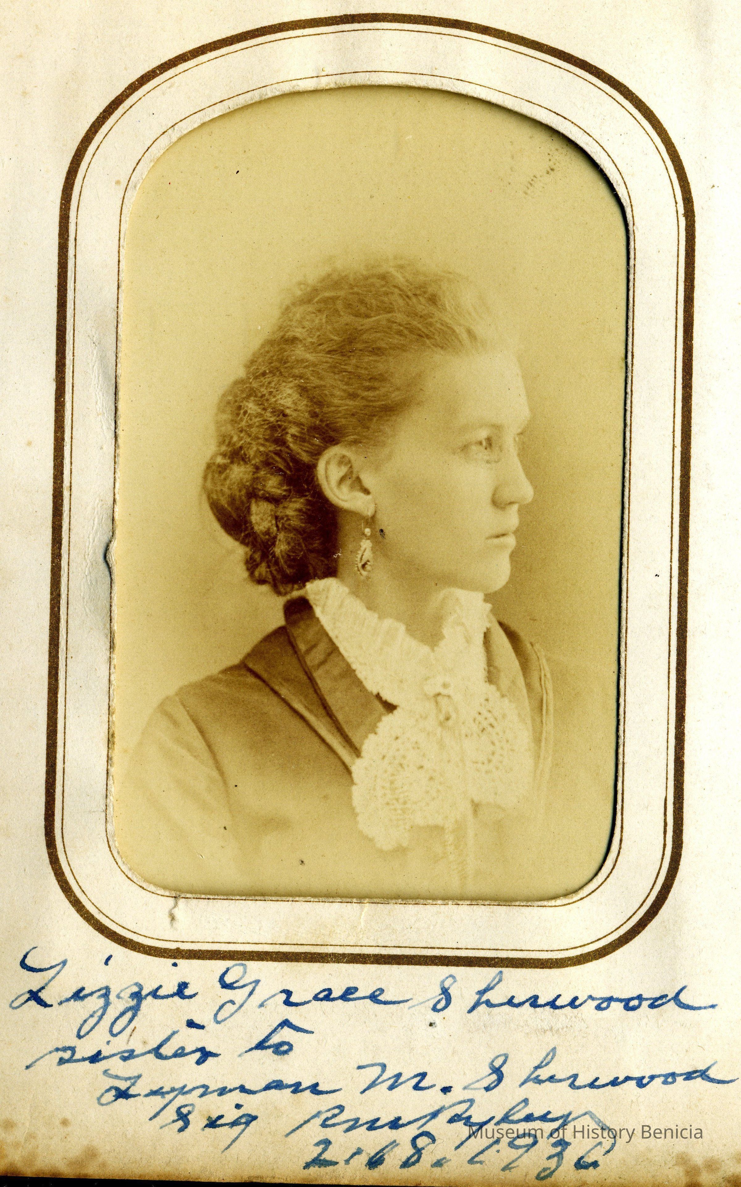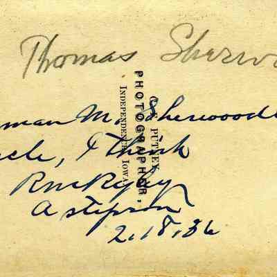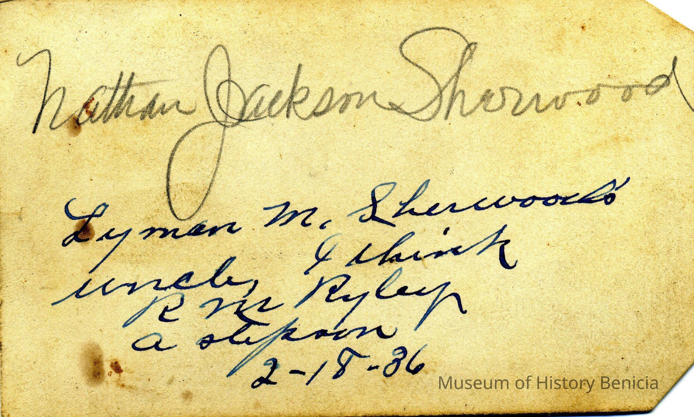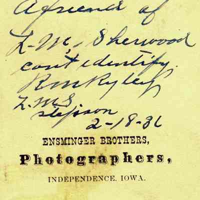 The captions shown in the album are in part based on information from Mr Sherwood's step-son, Ralph M. Ryley of Benicia California. Mr Ryley was the son of Emman Esther Snyder and George Washington Ryley, They divorced in 1883. Esther married Lyman Mumford Sherwood in 1897. Ralph M Ryley died in Benicia on 12/14/1943.Collection