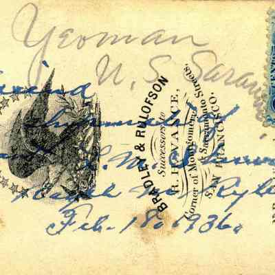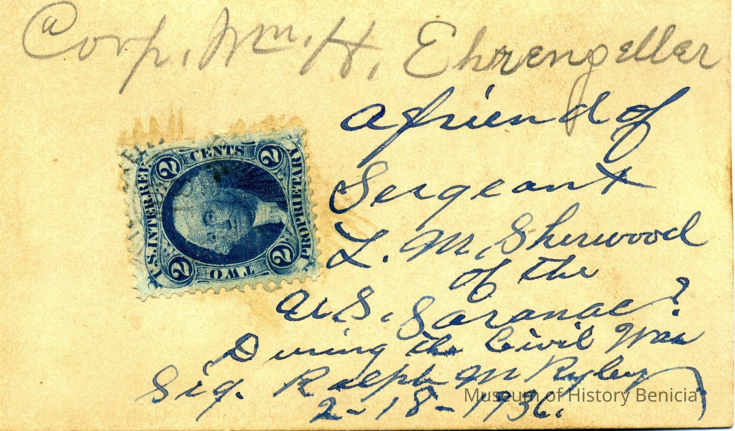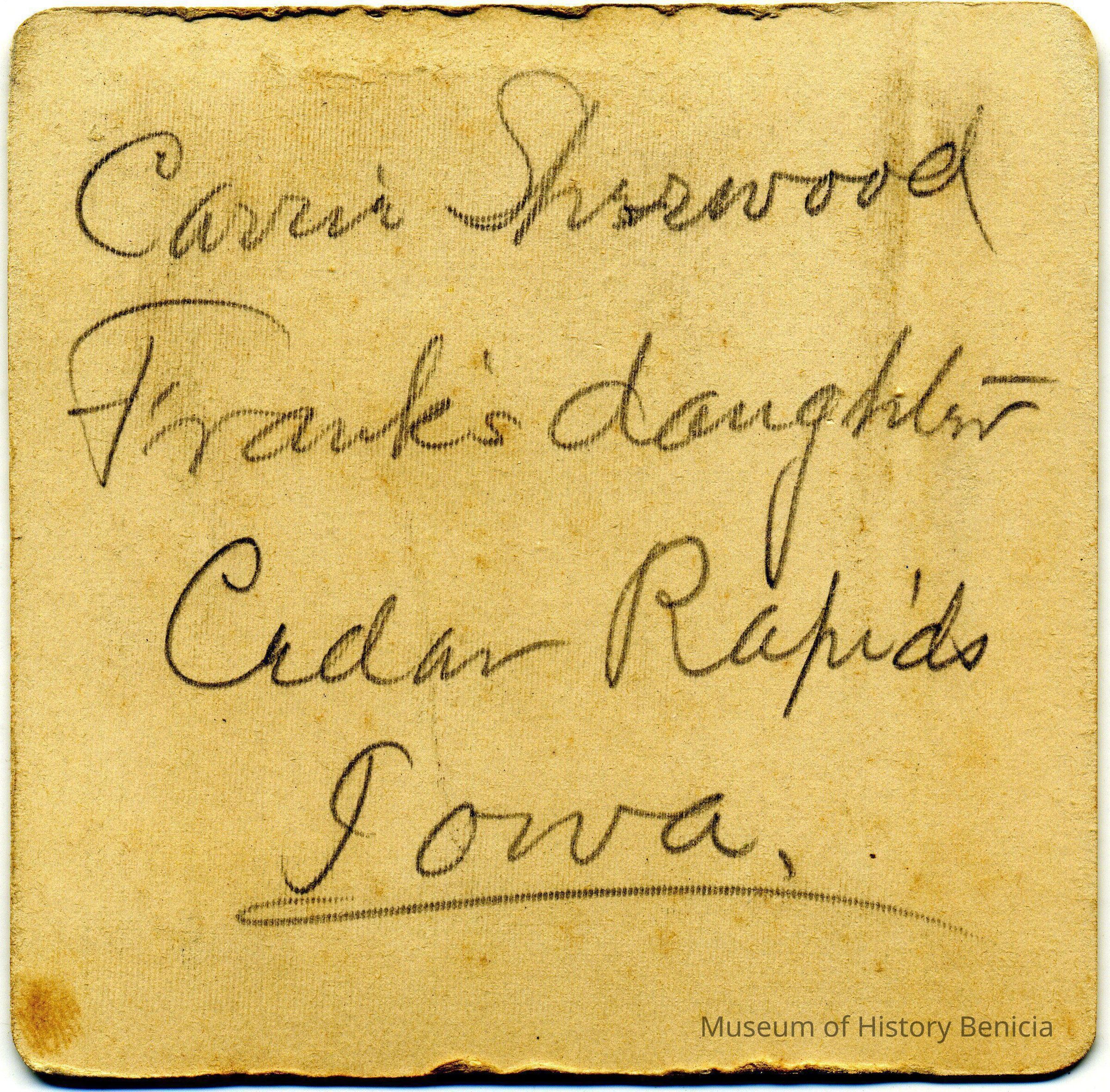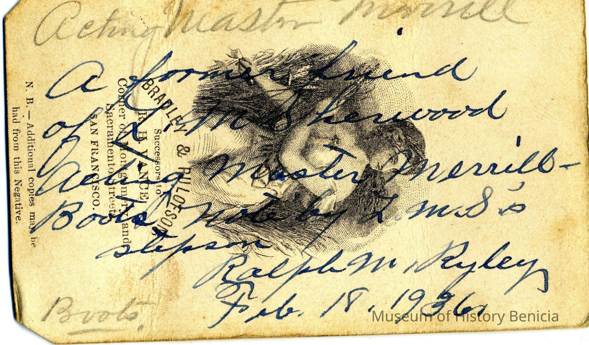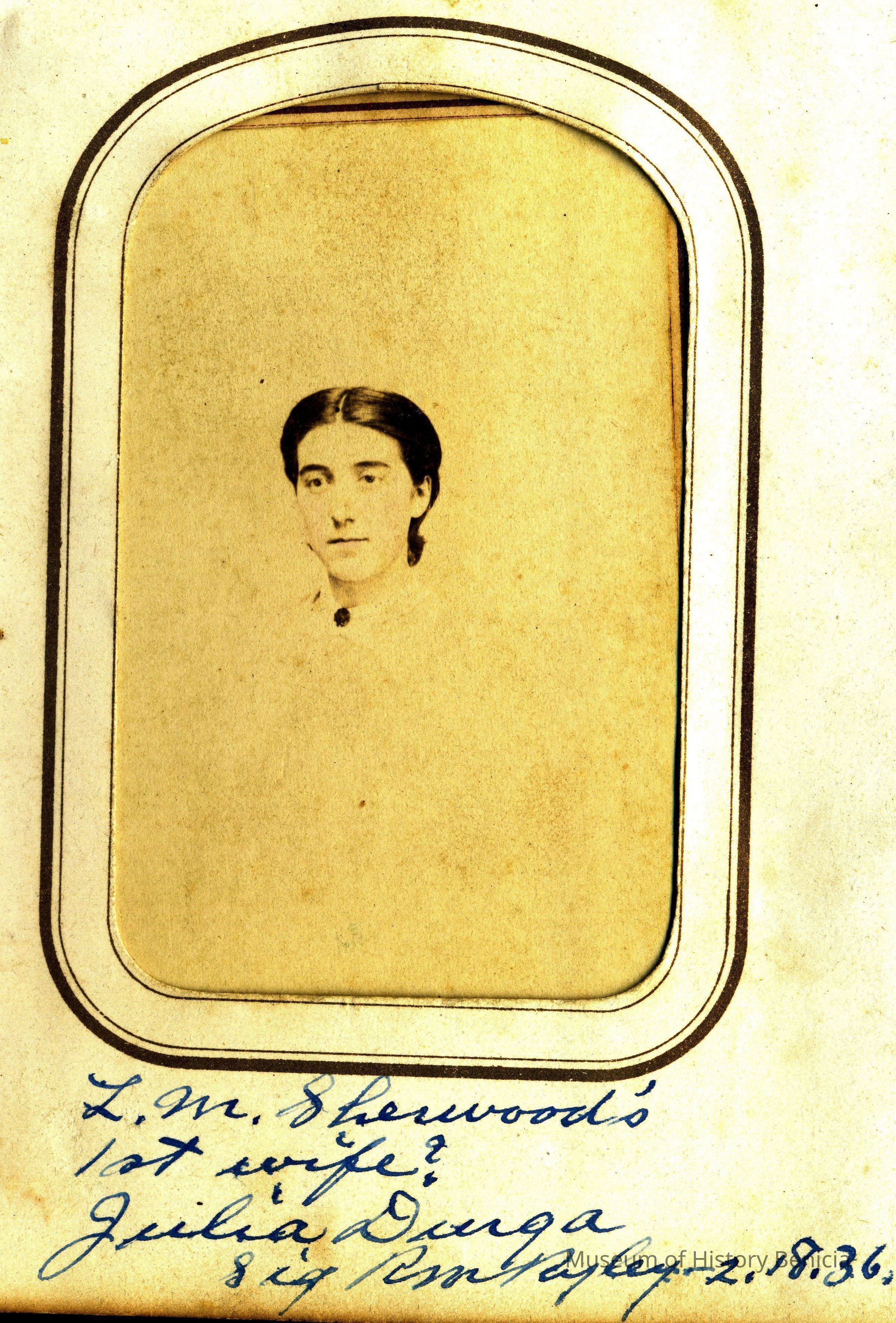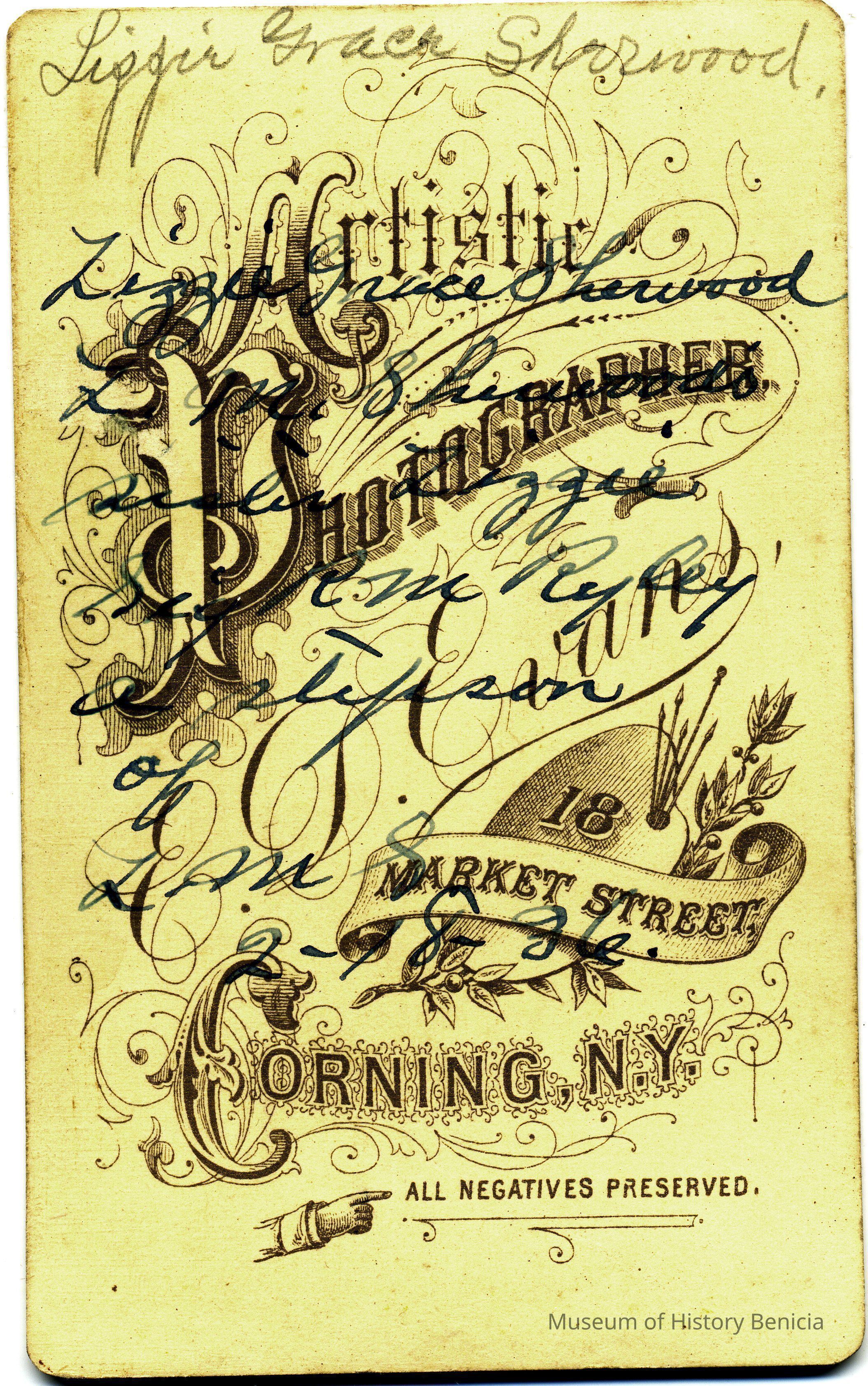 The captions shown in the album are in part based on information from Mr Sherwood's step-son, Ralph M. Ryley of Benicia California. Mr Ryley was the son of Emman Esther Snyder and George Washington Ryley, They divorced in 1883. Esther married Lyman Mumford Sherwood in 1897. Ralph M Ryley died in Benicia on 12/14/1943.Collection