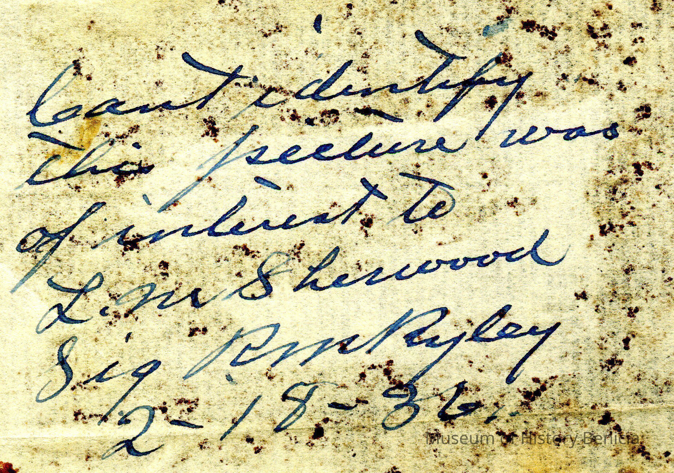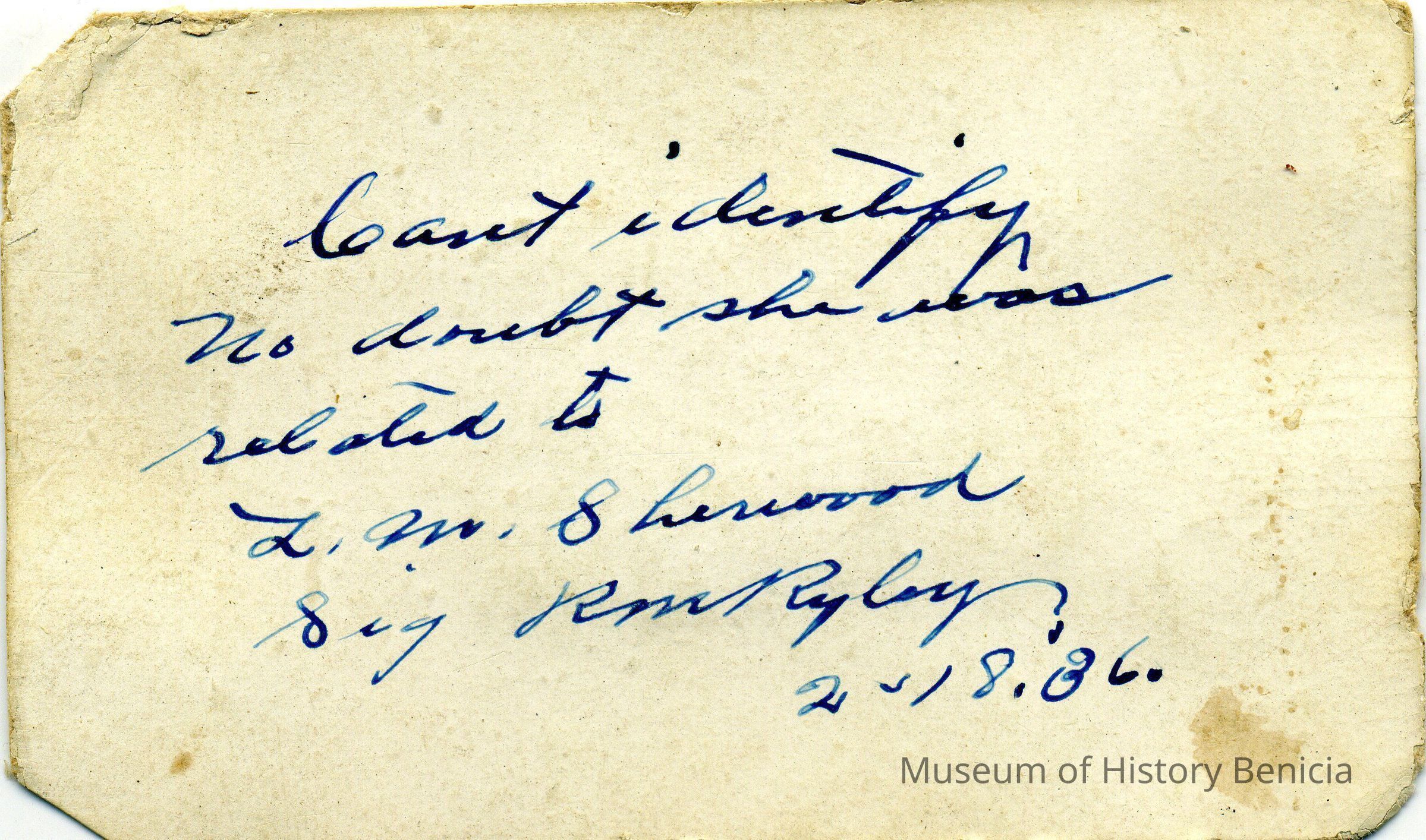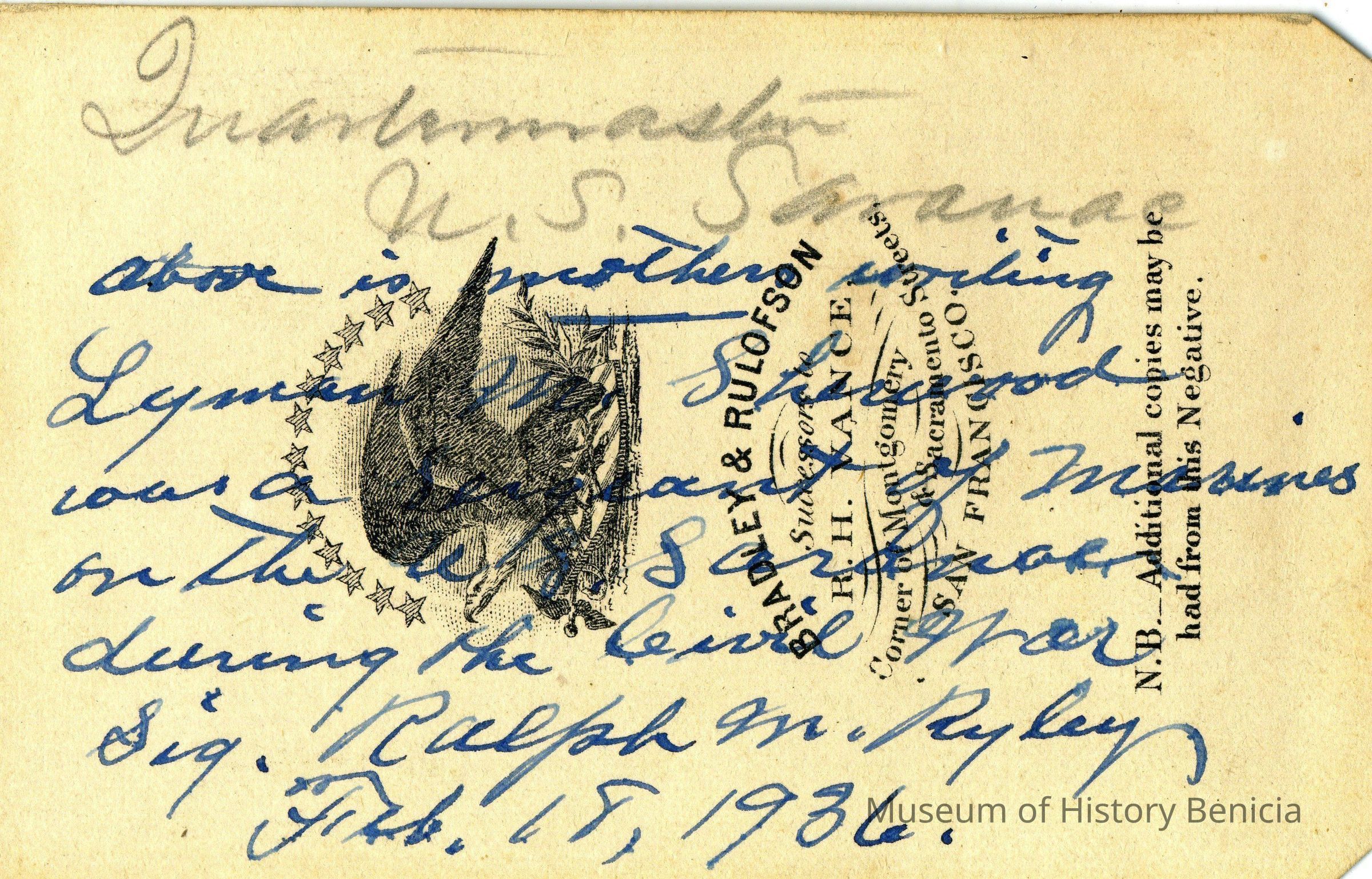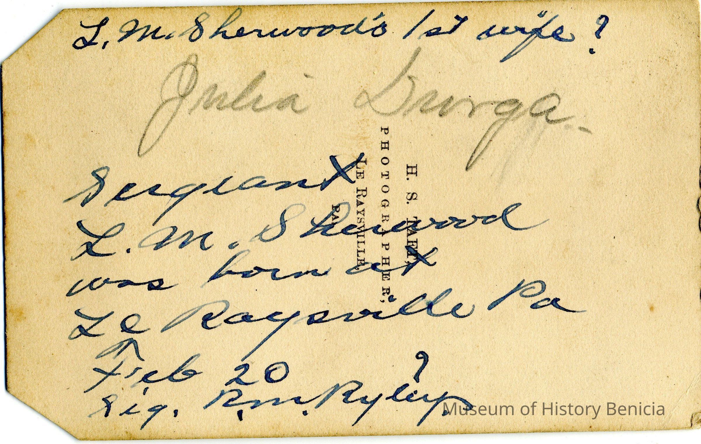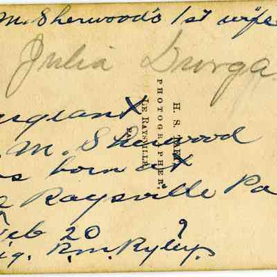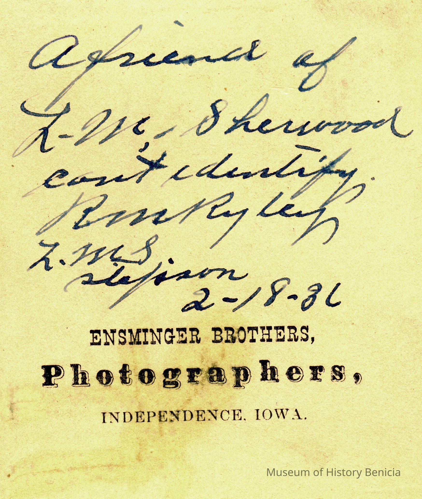 The captions shown in the album are in part based on information from Mr Sherwood's step-son, Ralph M. Ryley of Benicia California. Mr Ryley was the son of Emman Esther Snyder and George Washington Ryley, They divorced in 1883. Esther married Lyman Mumford Sherwood in 1897. Ralph M Ryley died in Benicia on 12/14/1943.Collection