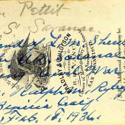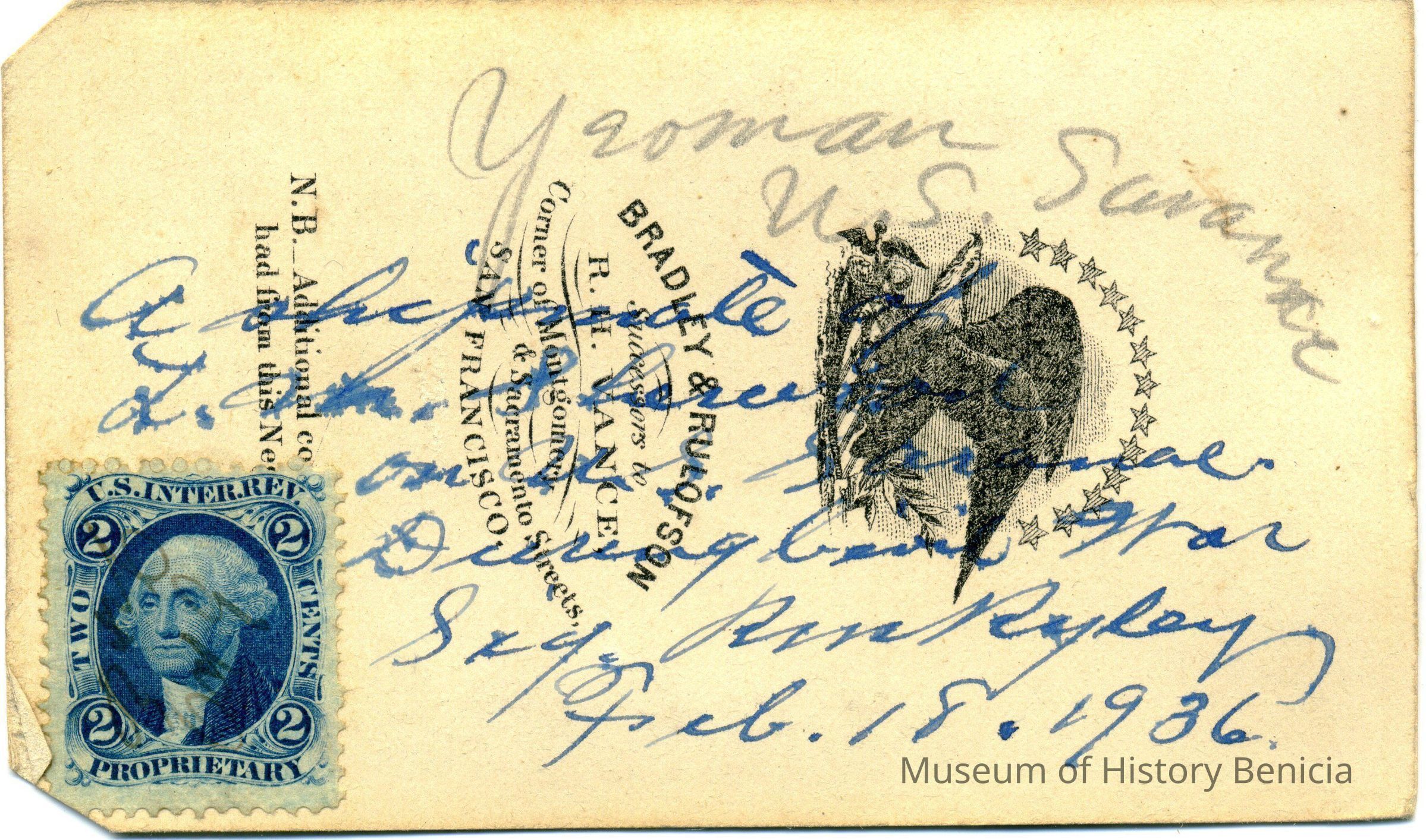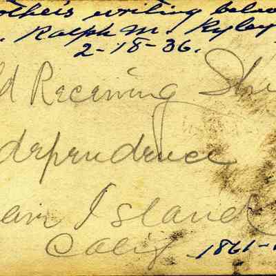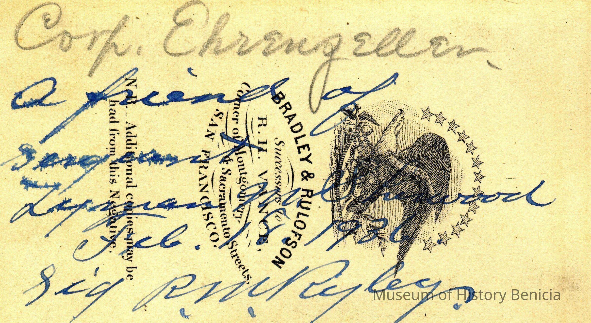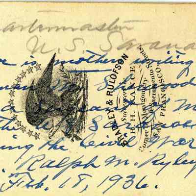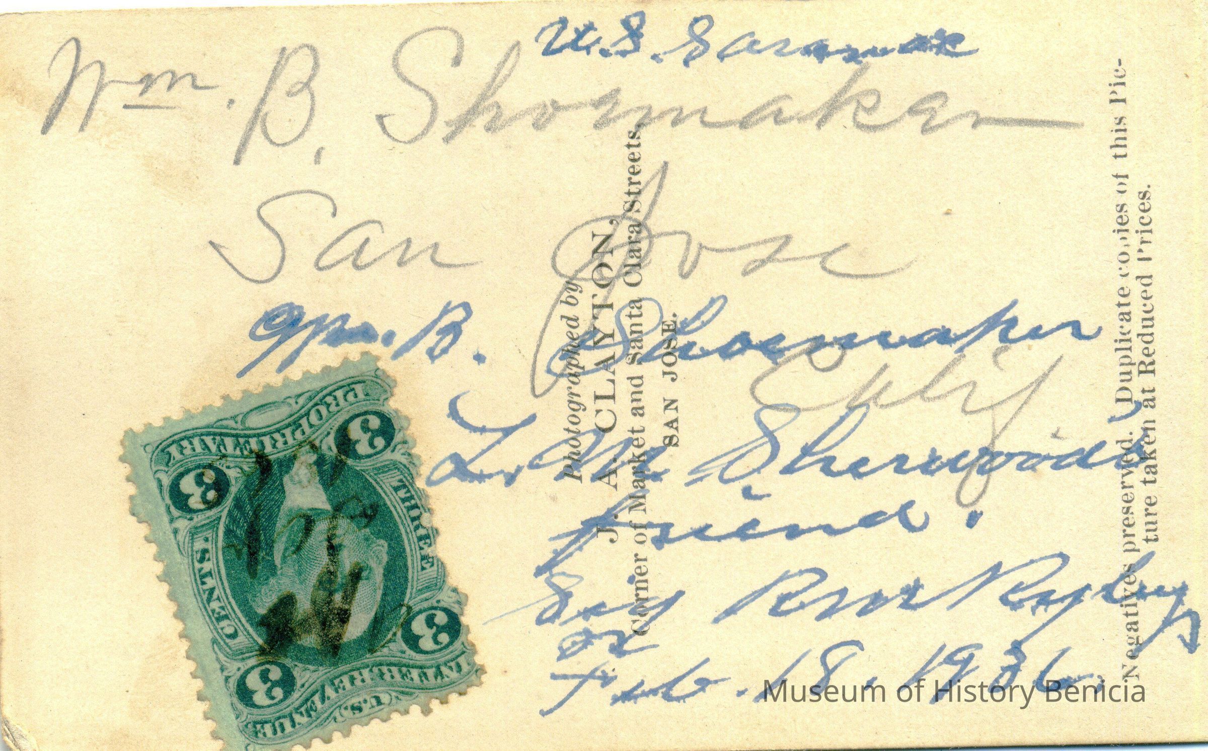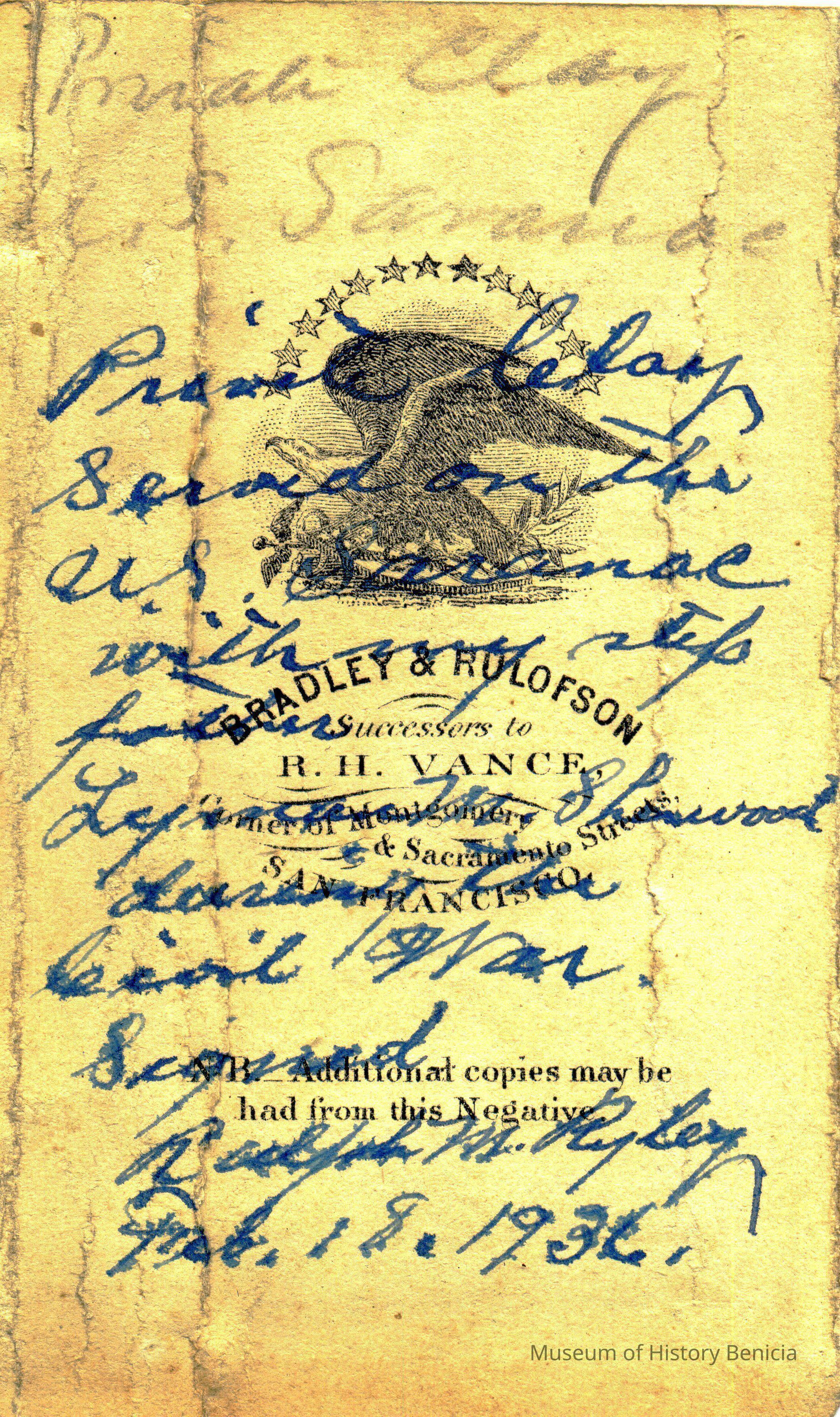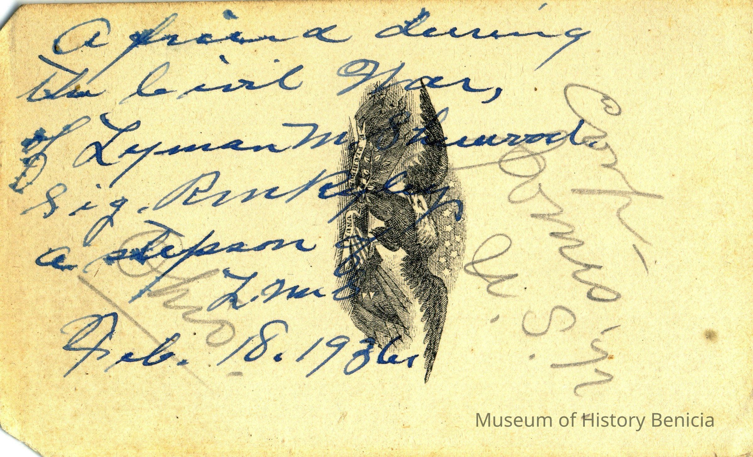 The captions shown in the album are in part based on information from Mr Sherwood's step-son, Ralph M. Ryley of Benicia California. Mr Ryley was the son of Emman Esther Snyder and George Washington Ryley, They divorced in 1883. Esther married Lyman Mumford Sherwood in 1897. Ralph M Ryley died in Benicia on 12/14/1943.Collection