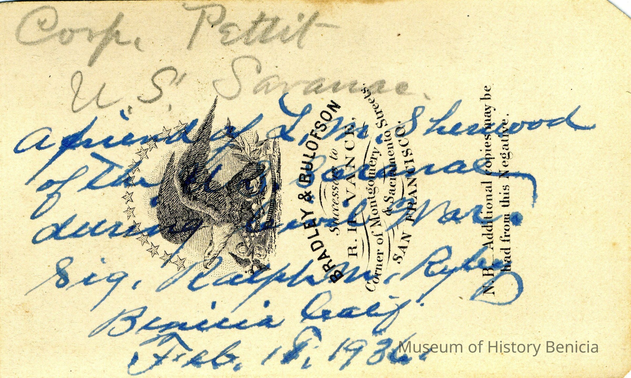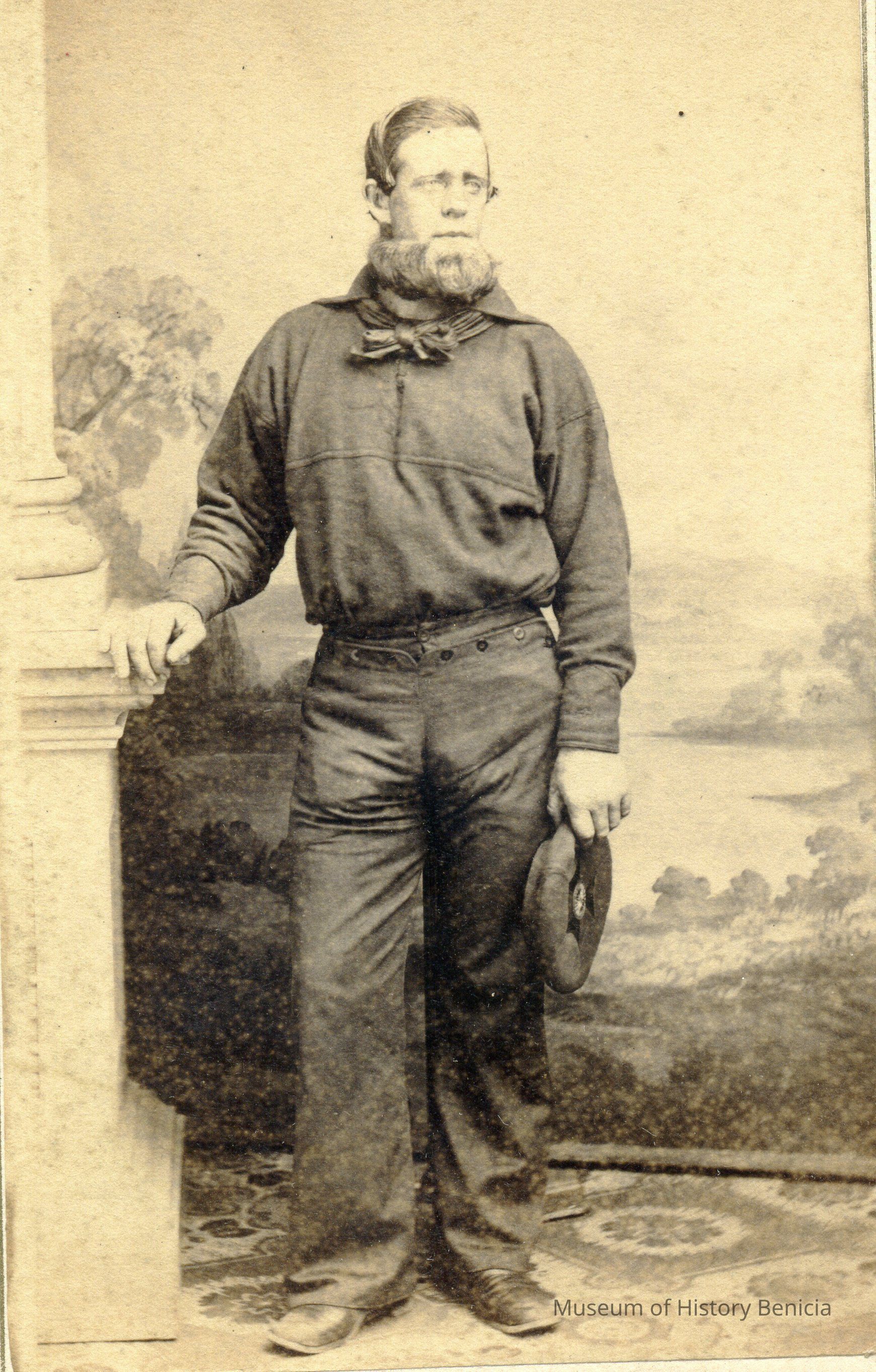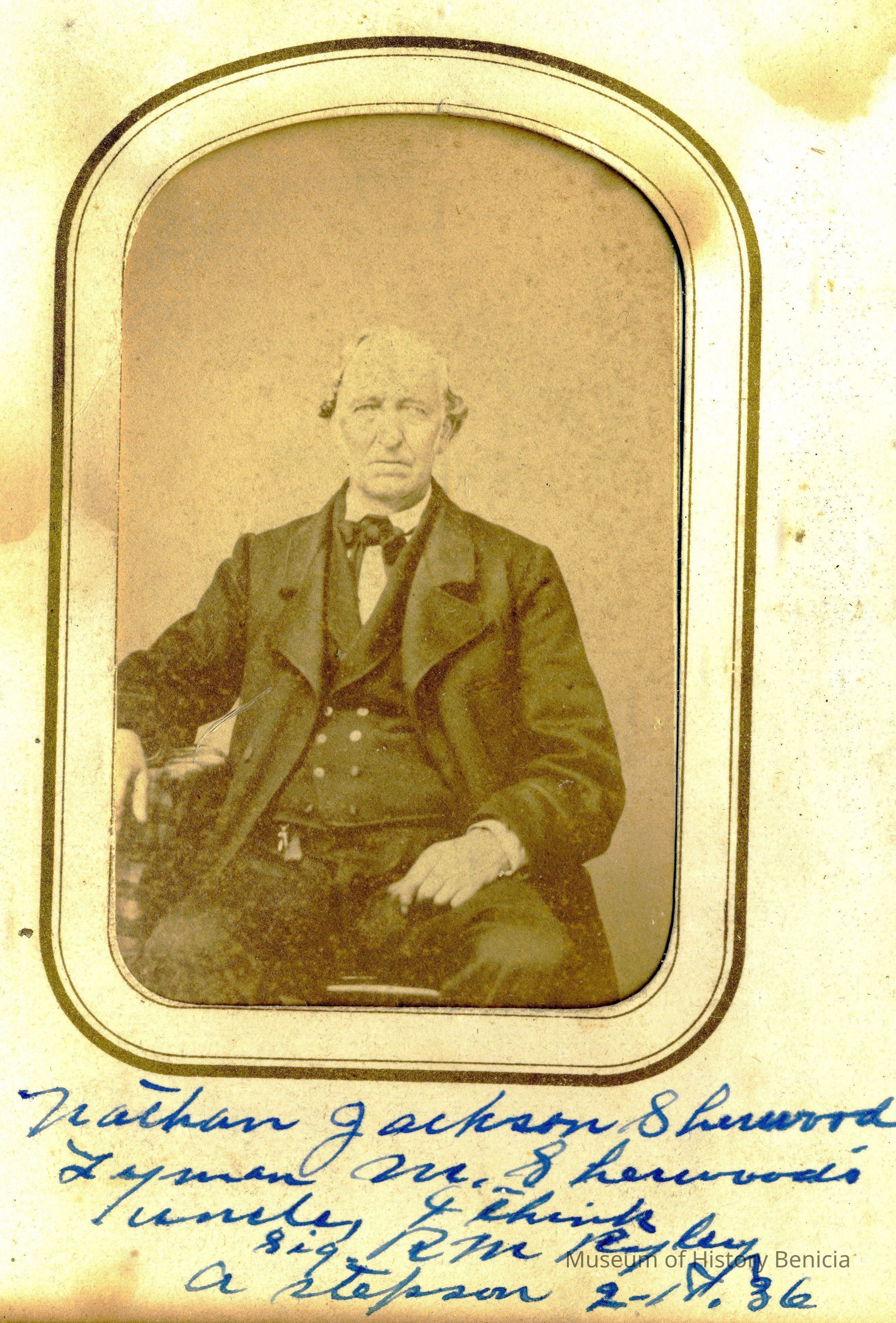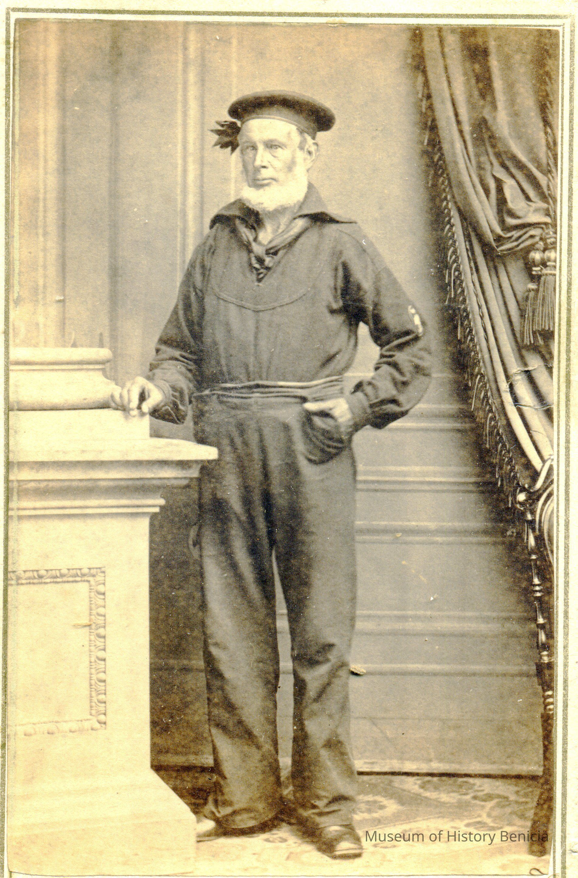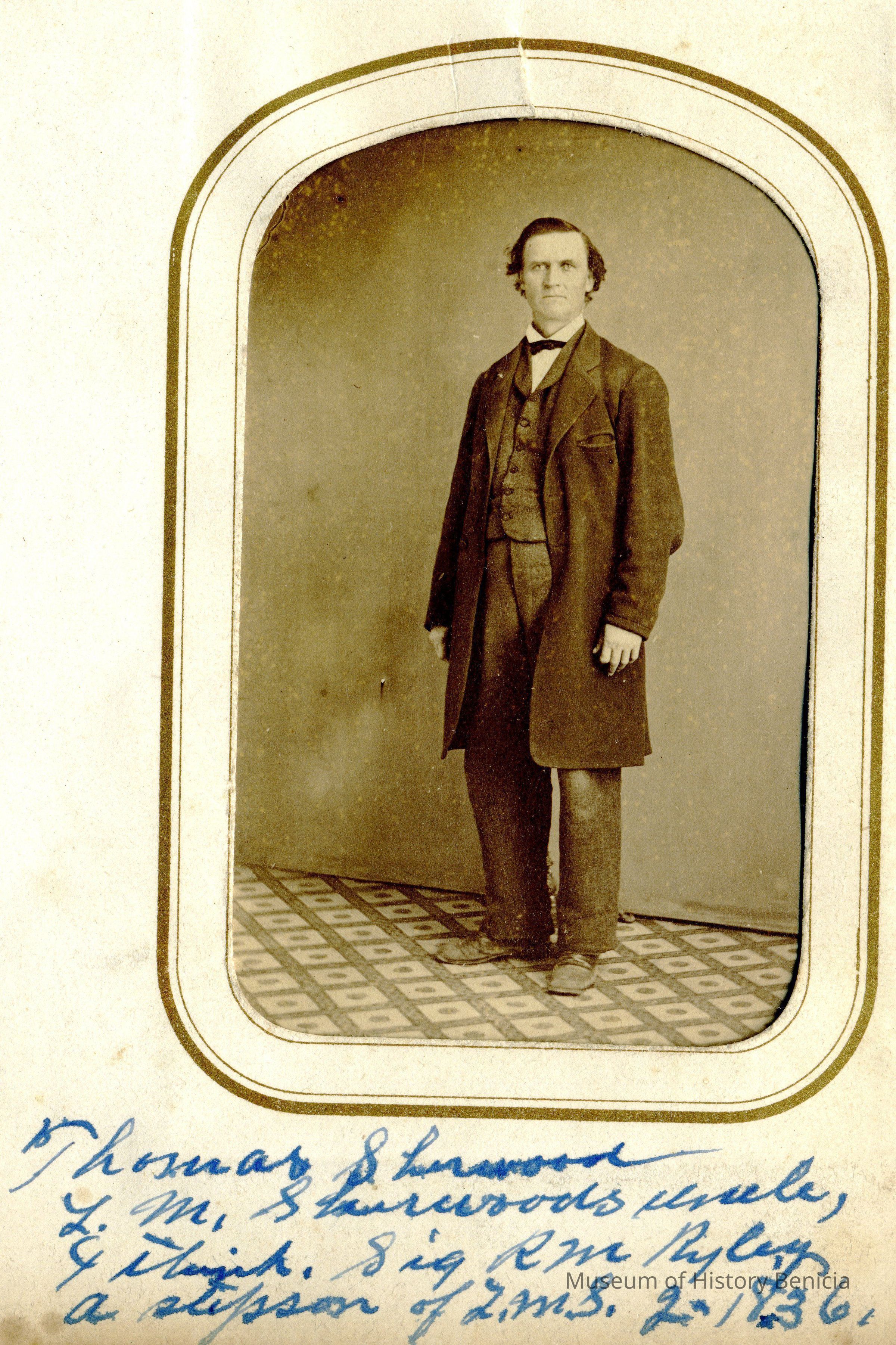 These photos are in the photo album under record number 2017.030.1006. This album belonged to Lyman M. Sherwood. This is Lyman M. Sherwood who was born 02/20/1843 in Le Raysville, PA. He died in Livermore, Alameda Cty, CA on 01/17/1925. He was on the ship Saranac which patrolled along the West Coast around 1860. Many of the photos in the album are of sailors from that ship.
