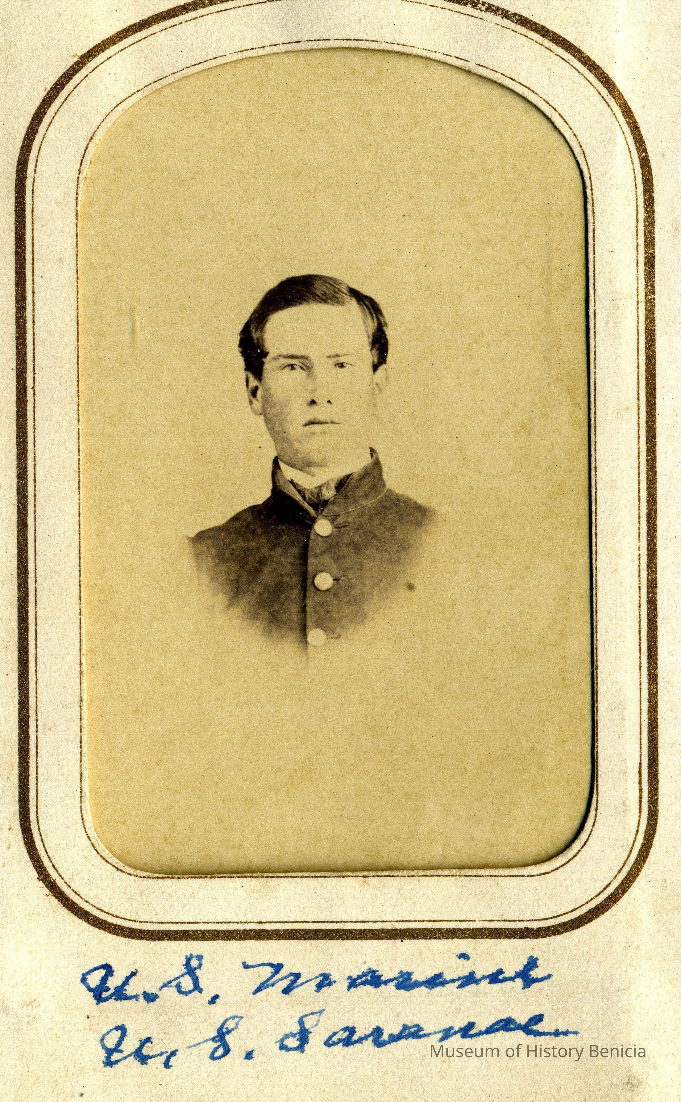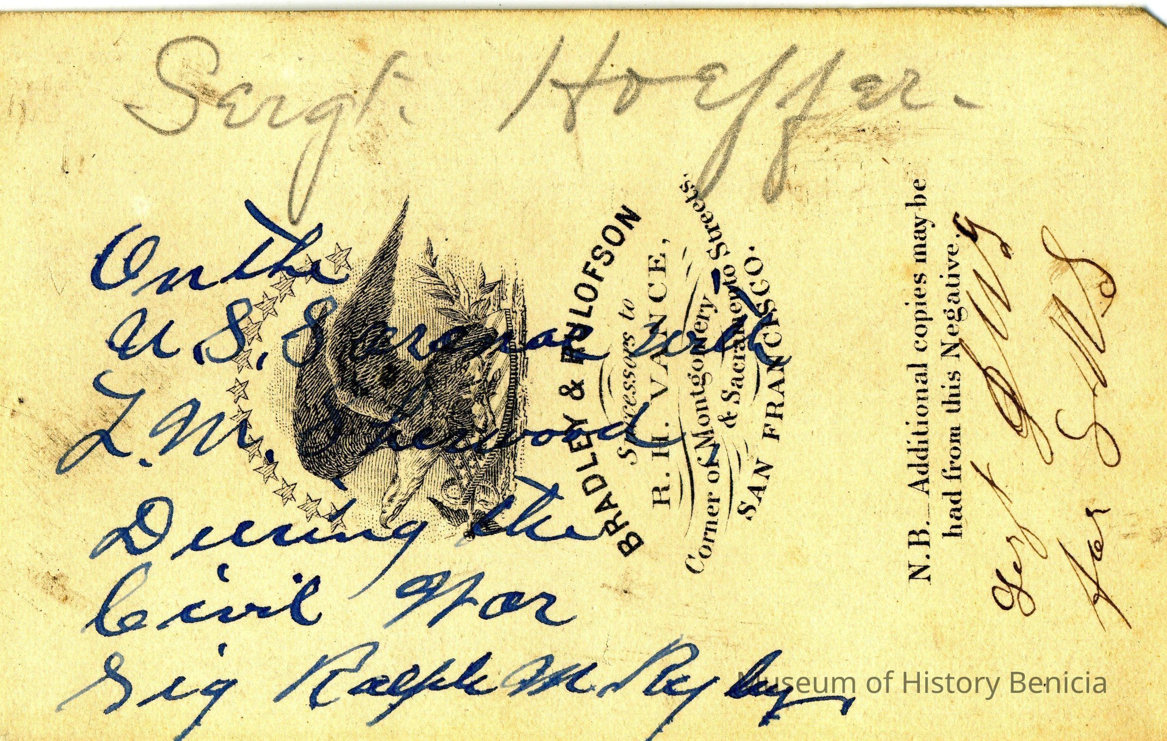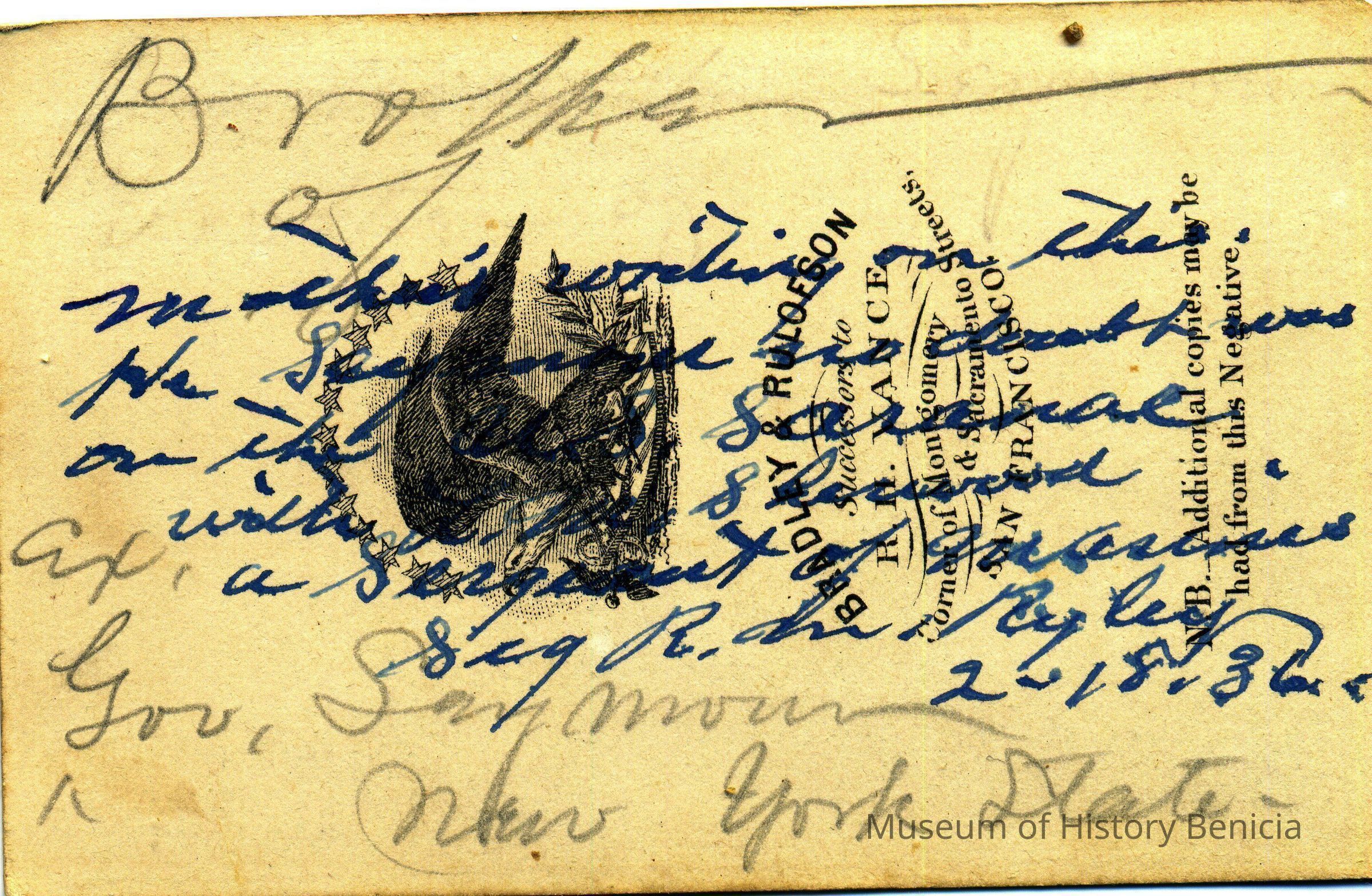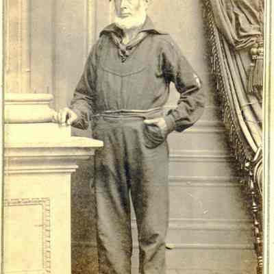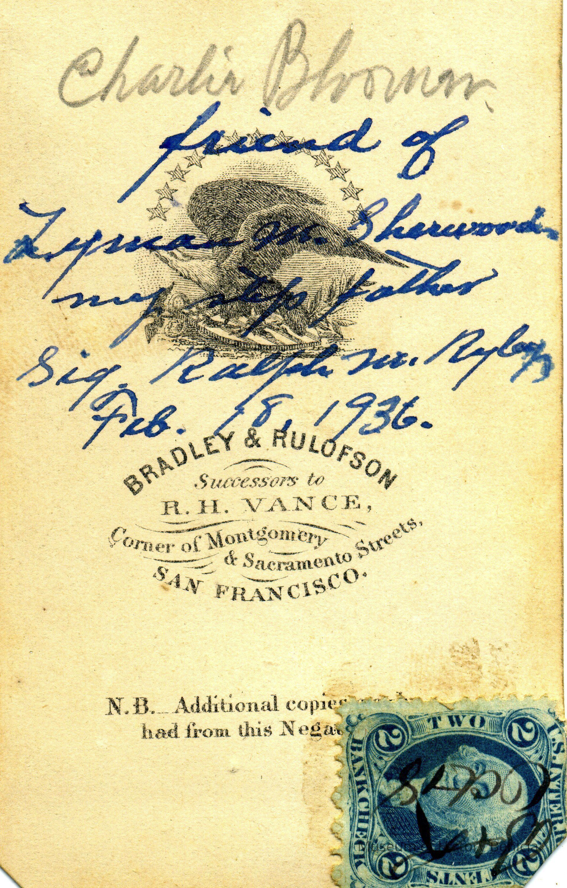 These photos are in the photo album under record number 2017.030.1006. This album belonged to Lyman M. Sherwood. This is Lyman M. Sherwood who was born 02/20/1843 in Le Raysville, PA. He died in Livermore, Alameda Cty, CA on 01/17/1925. He was on the ship Saranac which patrolled along the West Coast around 1860. Many of the photos in the album are of sailors from that ship.