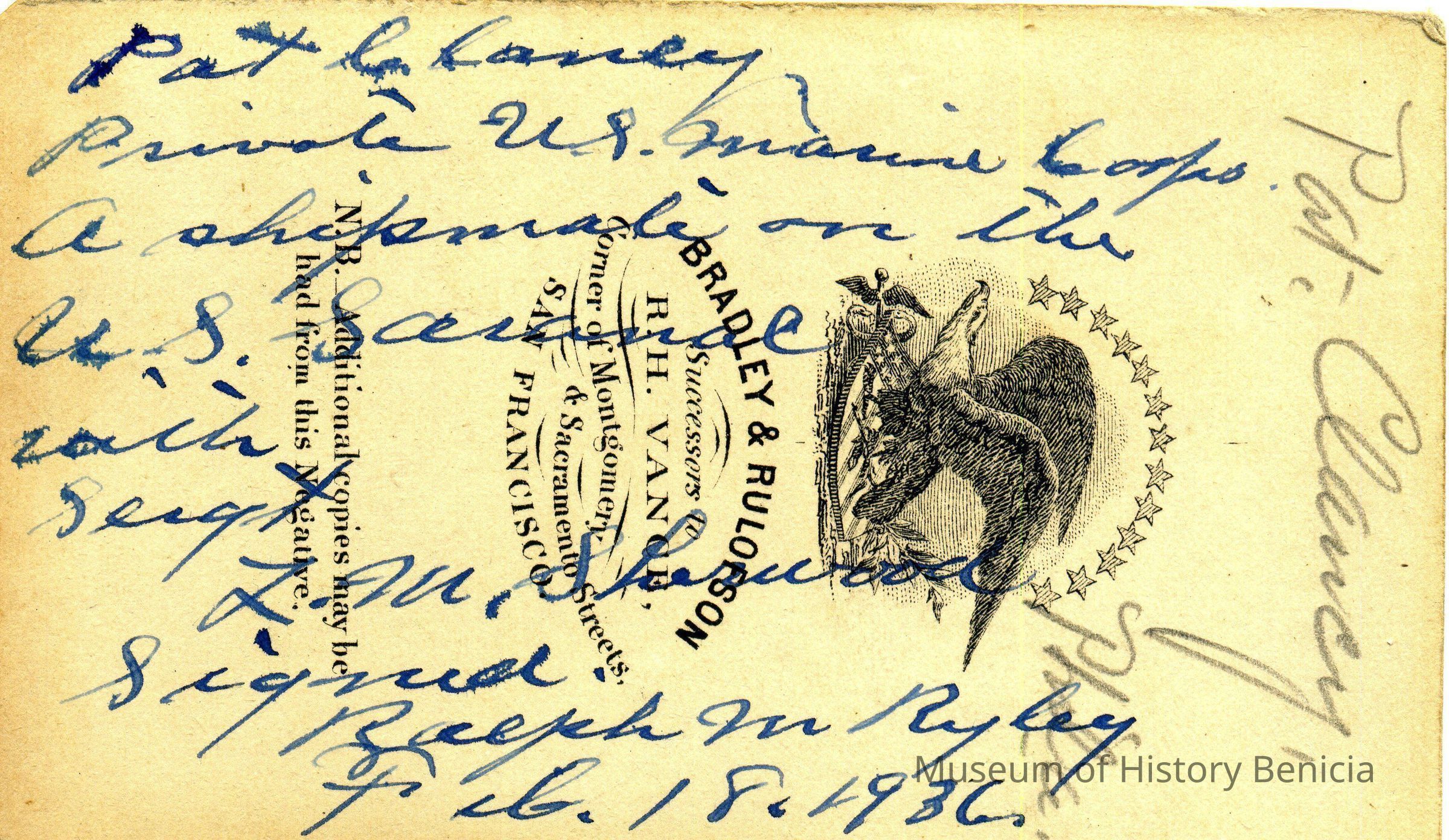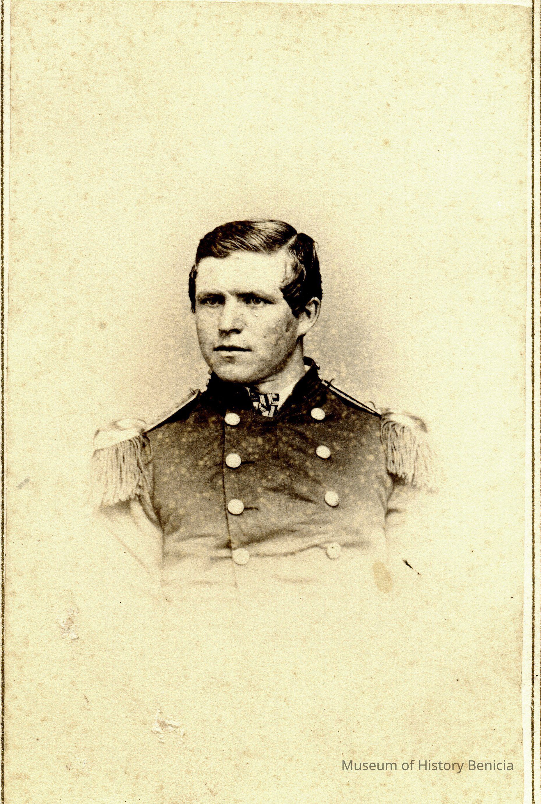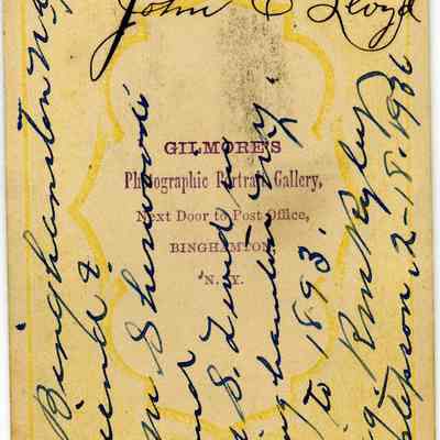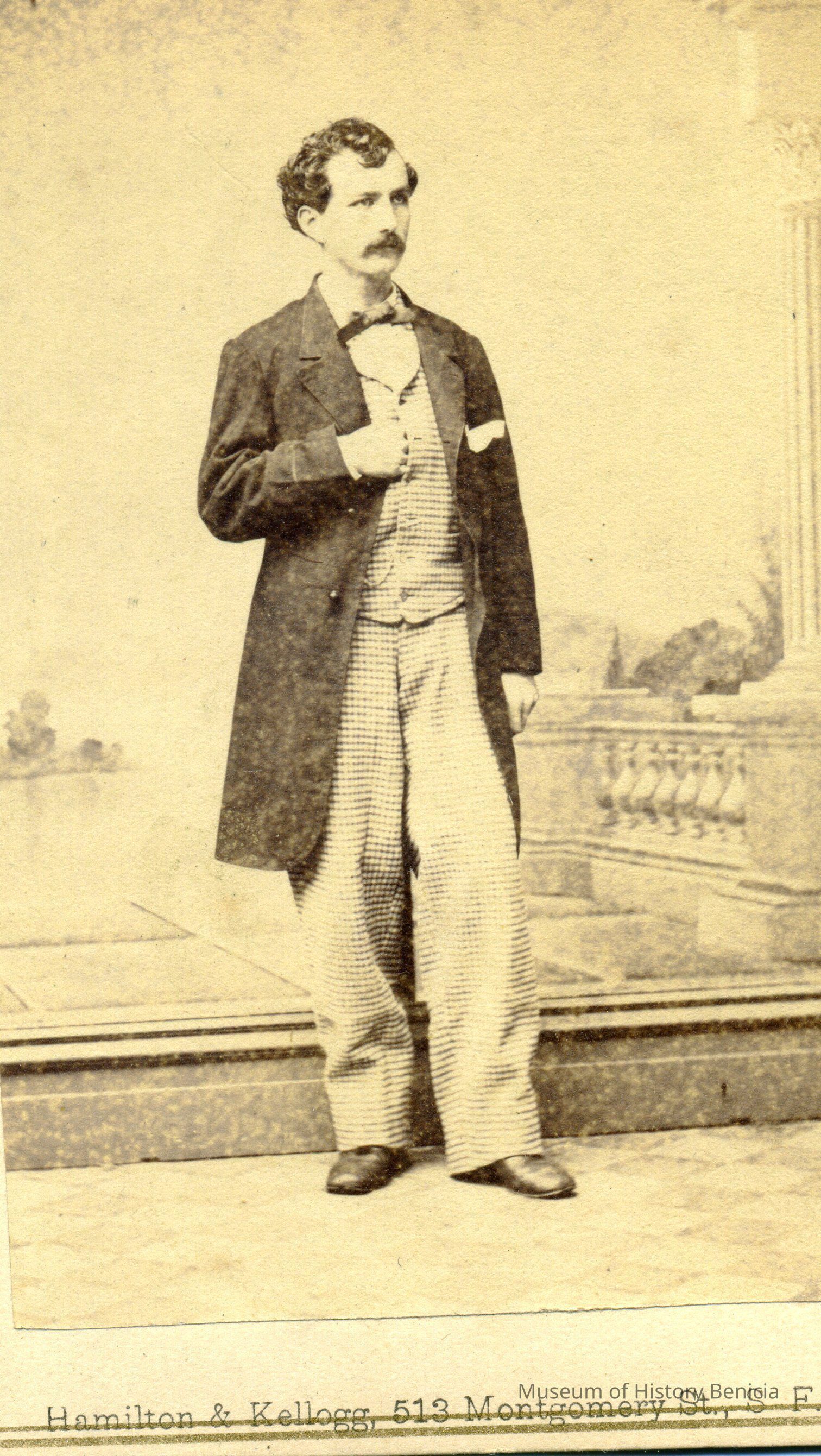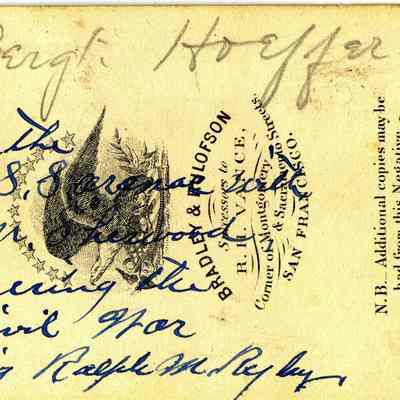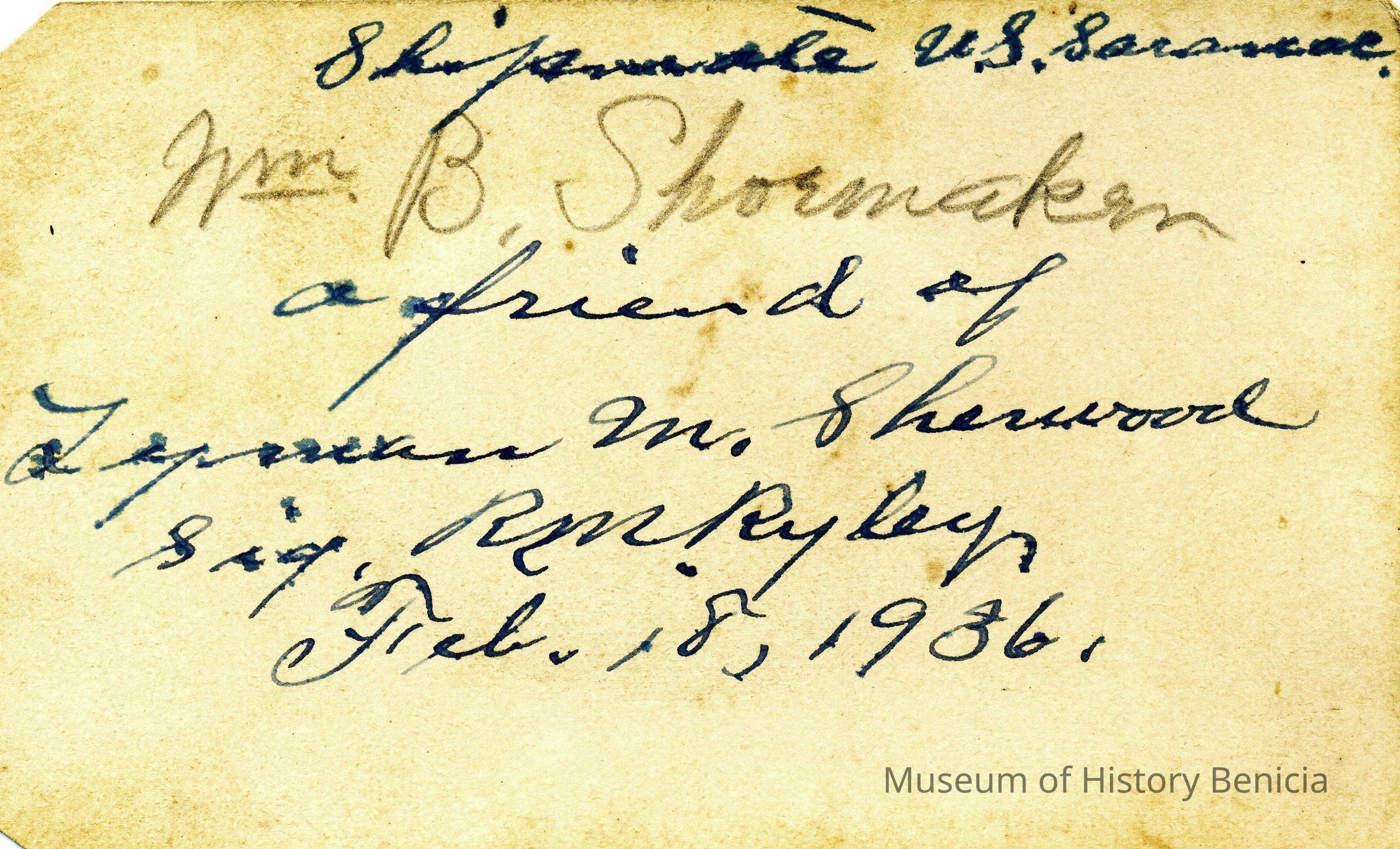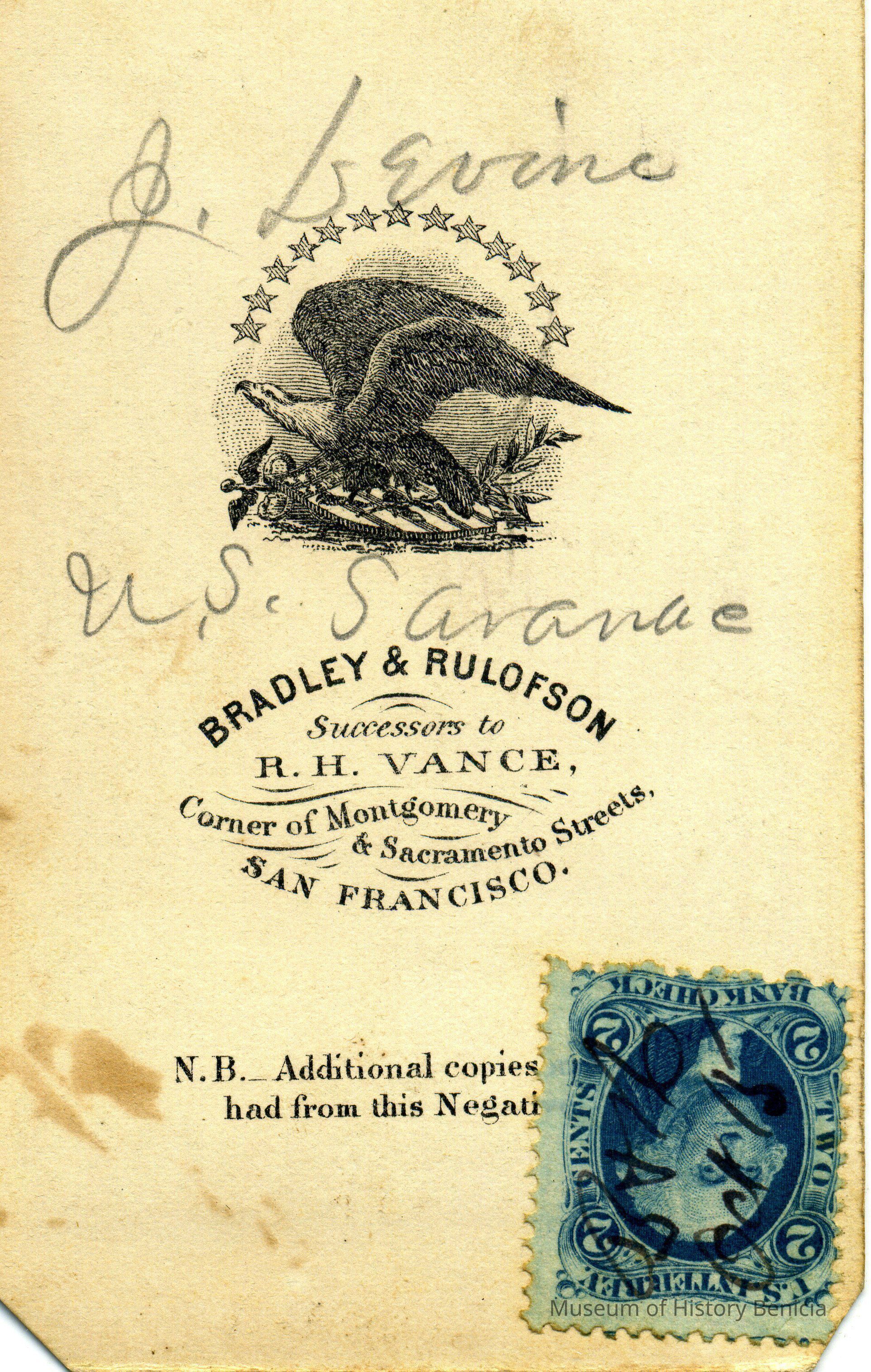 These photos are in the photo album under record number 2017.030.1006. This album belonged to Lyman M. Sherwood. This is Lyman M. Sherwood who was born 02/20/1843 in Le Raysville, PA. He died in Livermore, Alameda Cty, CA on 01/17/1925. He was on the ship Saranac which patrolled along the West Coast around 1860. Many of the photos in the album are of sailors from that ship.