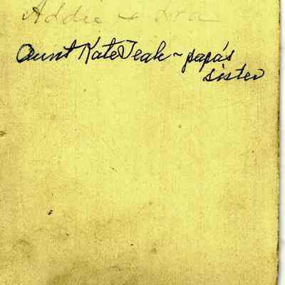 This is a portrait of a woman. It is 2" x 2.5". It looks like a very small carte-de visite. She has a large bunch of flowers on her lapel. The back says she is "Aunt Kate Teale - papa's sister.