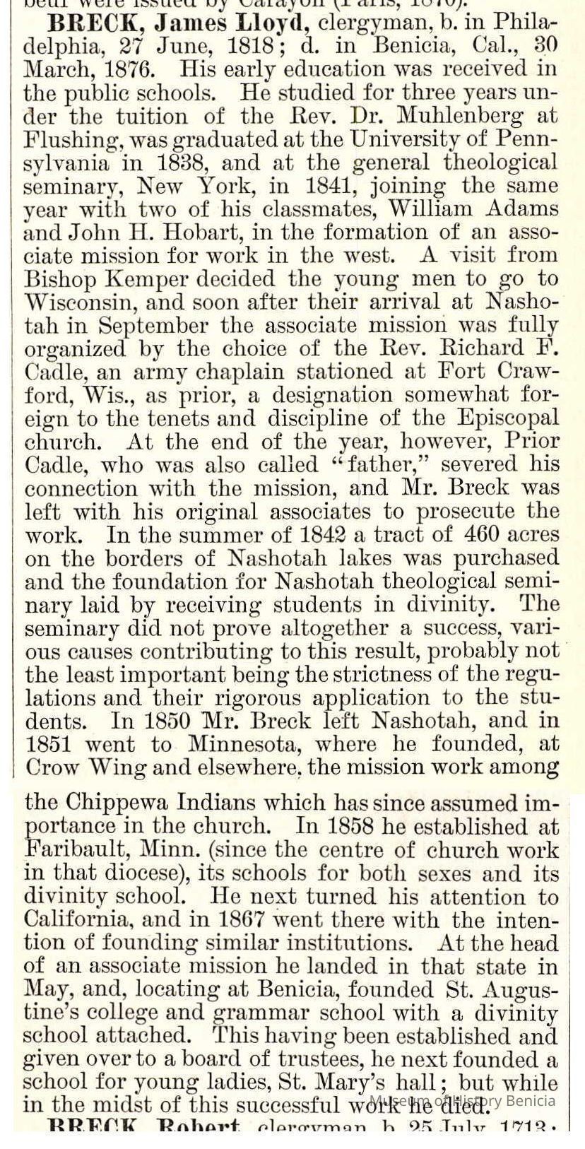 He founded and was the Dean of St. Augustine's and St. Mary's Episcopal Schools, Benicia, Calif. 1860's". Attache is a biography of James Lloyd Breck.