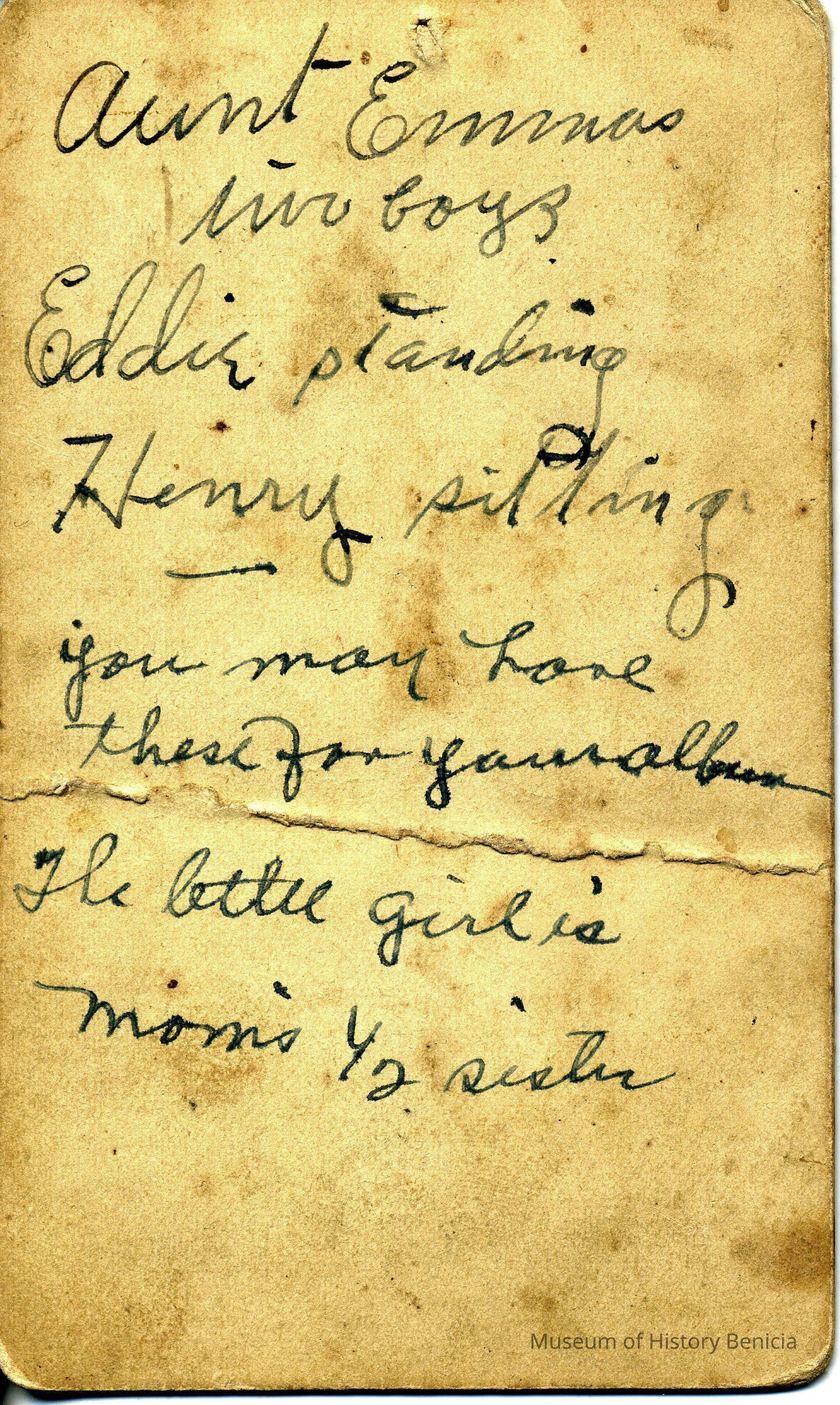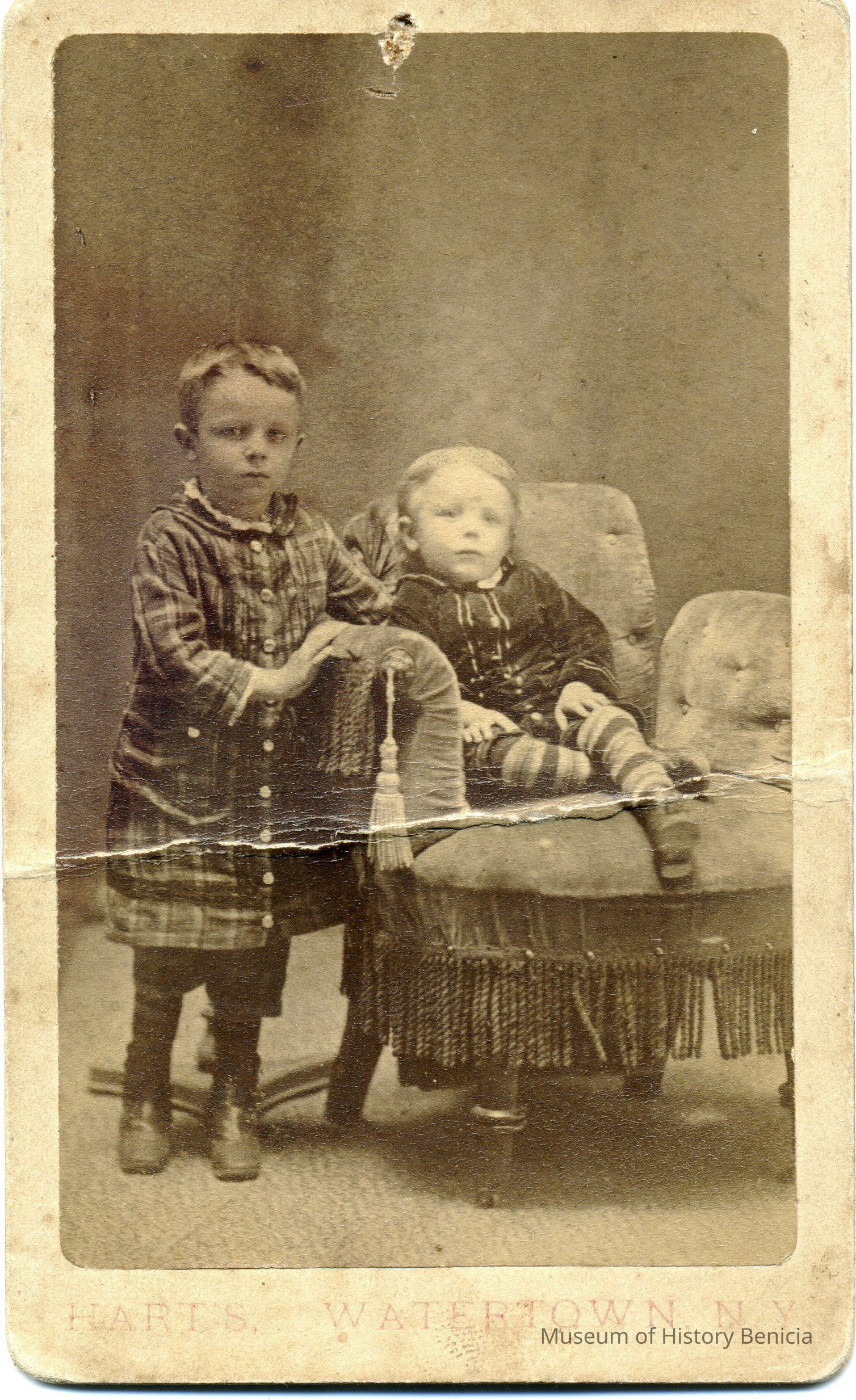 Carte-de-visite of two boys, one is sitting in a chair while the other poses next to him. Hart's