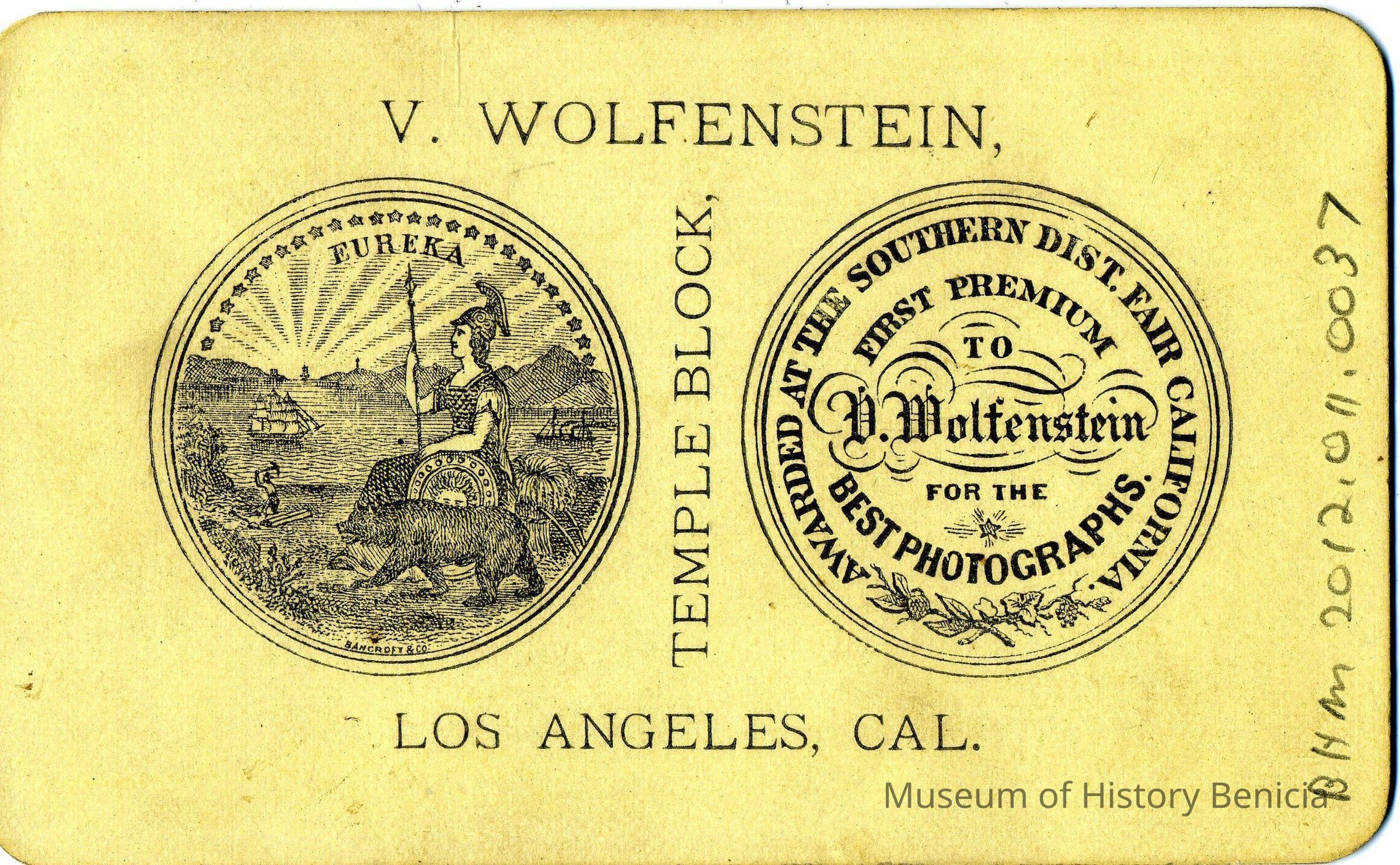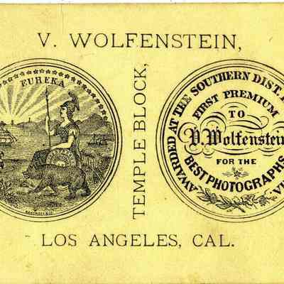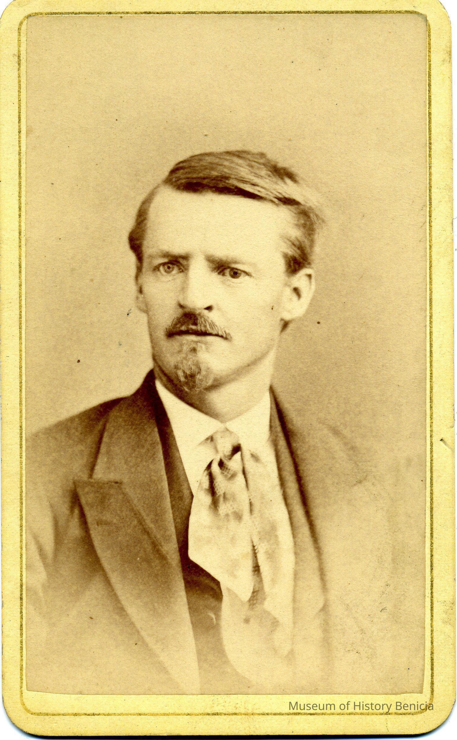 Carte-de-visite of a man with a gotee and mustache. The advertizing on the back says that D Wolfenstein was awarded First Premium for best photographs at the Southern Dist Fair California.Collection