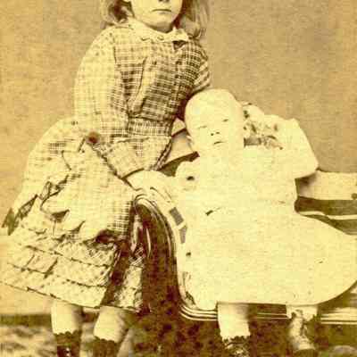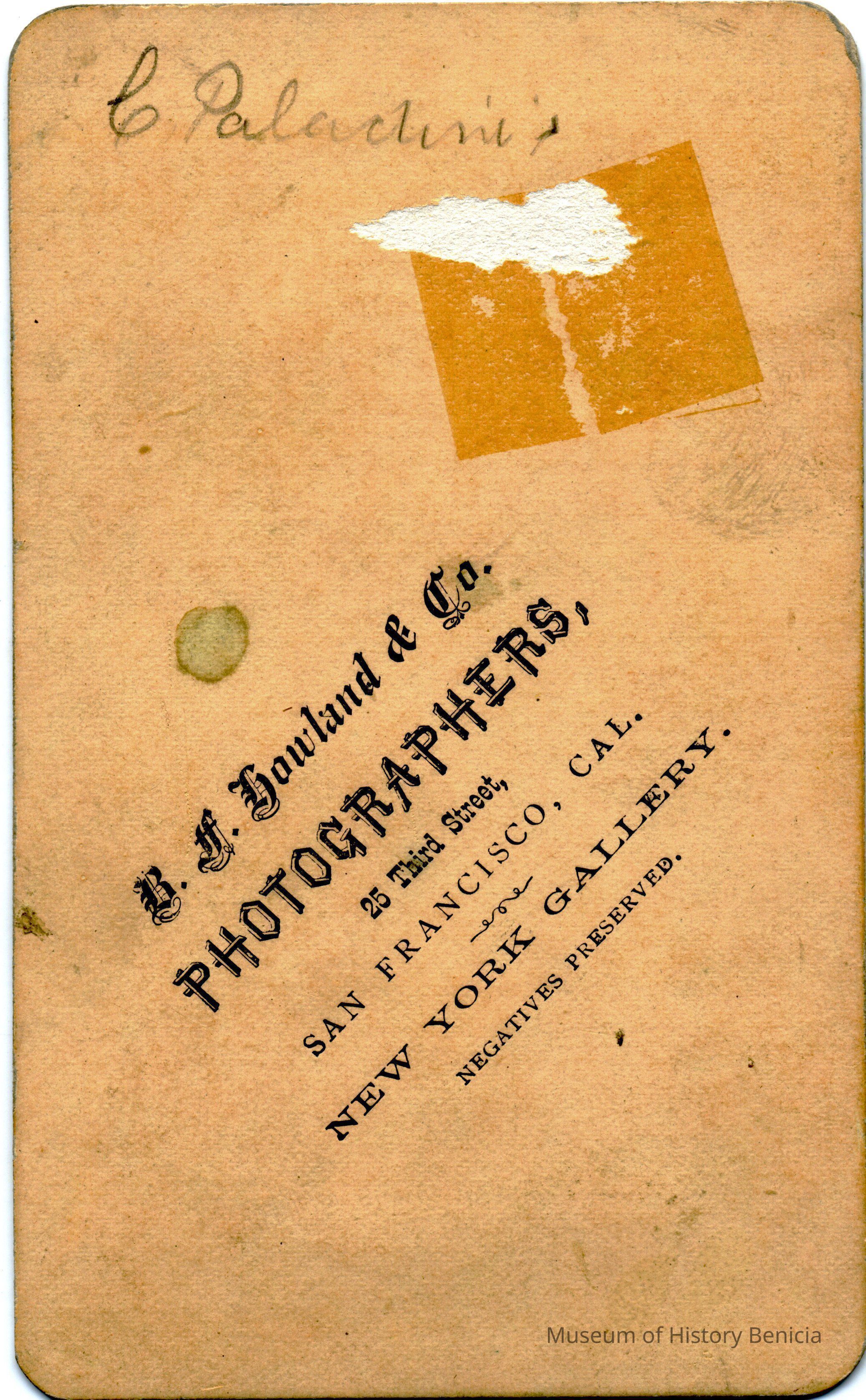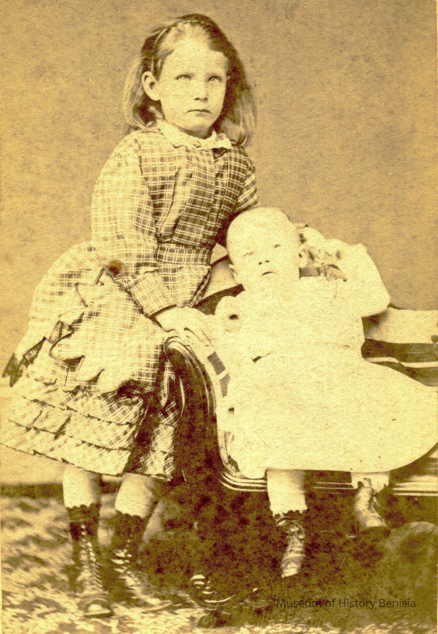 This is a Carte-de-Visite of a young girl with a baby in a chair. The back says C. Paladini. This could be Celia Paladini Dillingham with her younger sister Oceana. She is the older sister of Oceana Dillingham Erwin.Collection