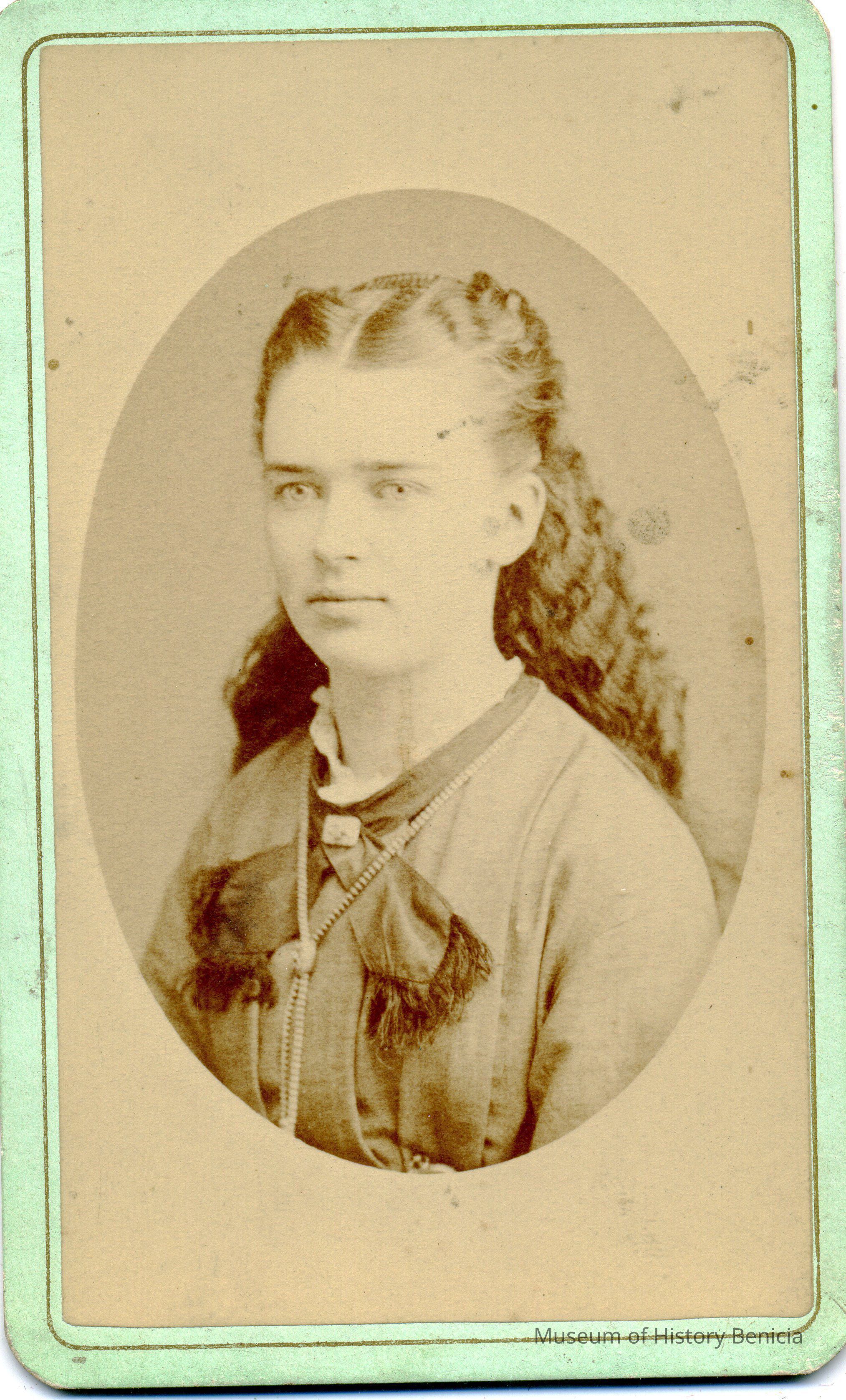 Carte-de-visite of a woman in an oval frame with a blue border.