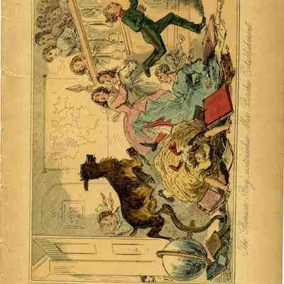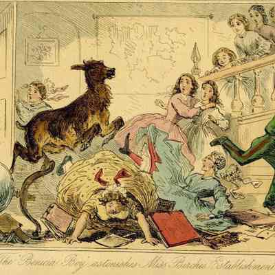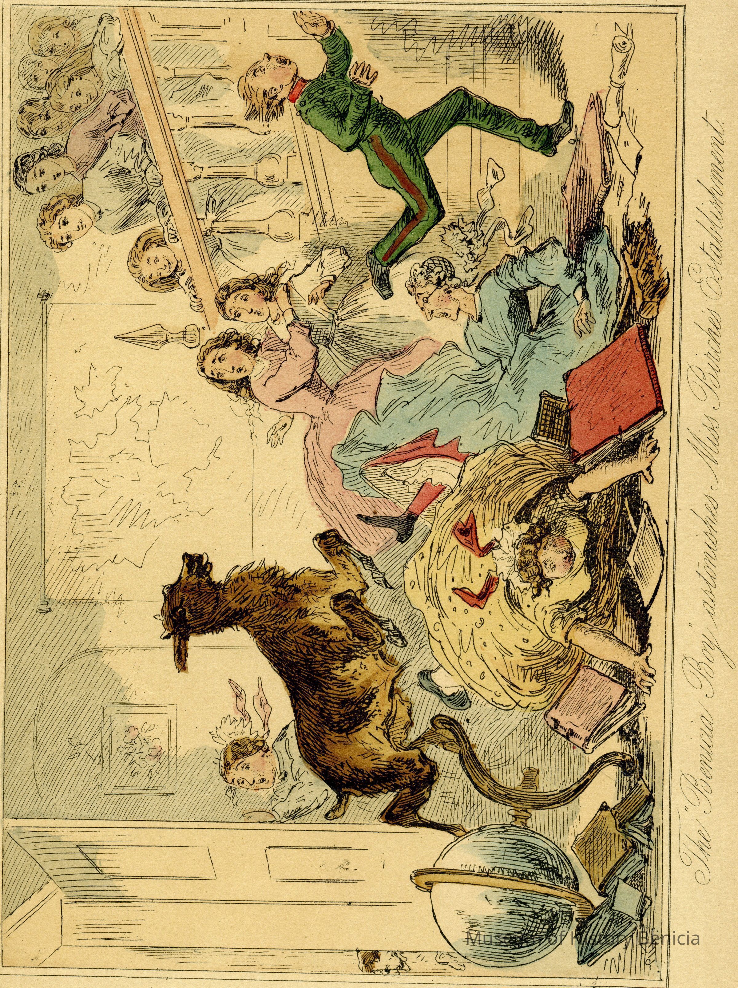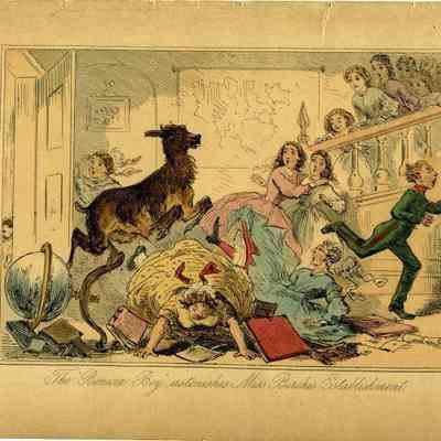 "The Benicia Boy astonishes Miss Birches Establishment". Original colored engraving by John Leech and H K Browne "Phiz" in 1840-1855.