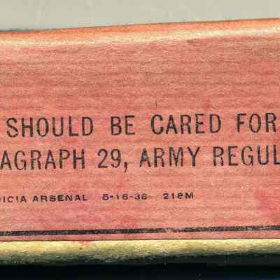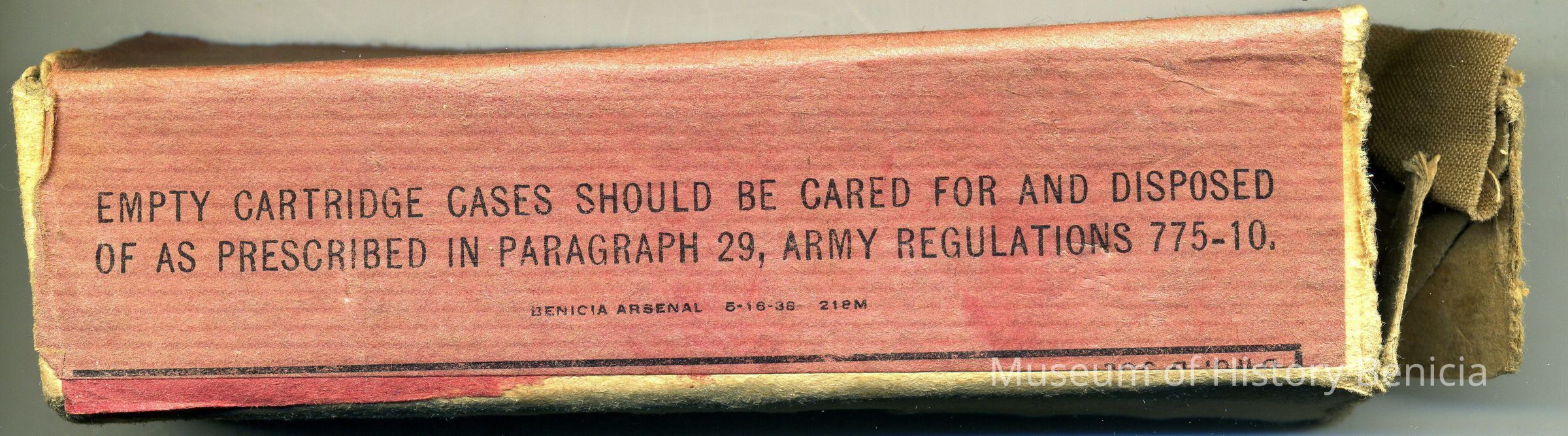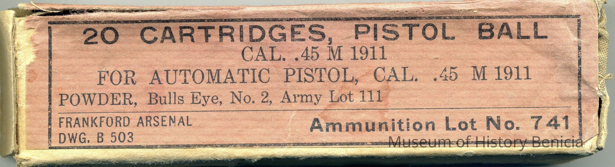 Box "20 cartridges Pistol Ball. Cal .45m 1911 for Automatic Pistol. Cal .45m 1911 Powder, Bulls Eye, No. 2, Army Lot 111. Frankford Arsenal DWBB 503, Ammunition Lot No. 741. Roll tested at Benicia Arsenal, 1938"Collection