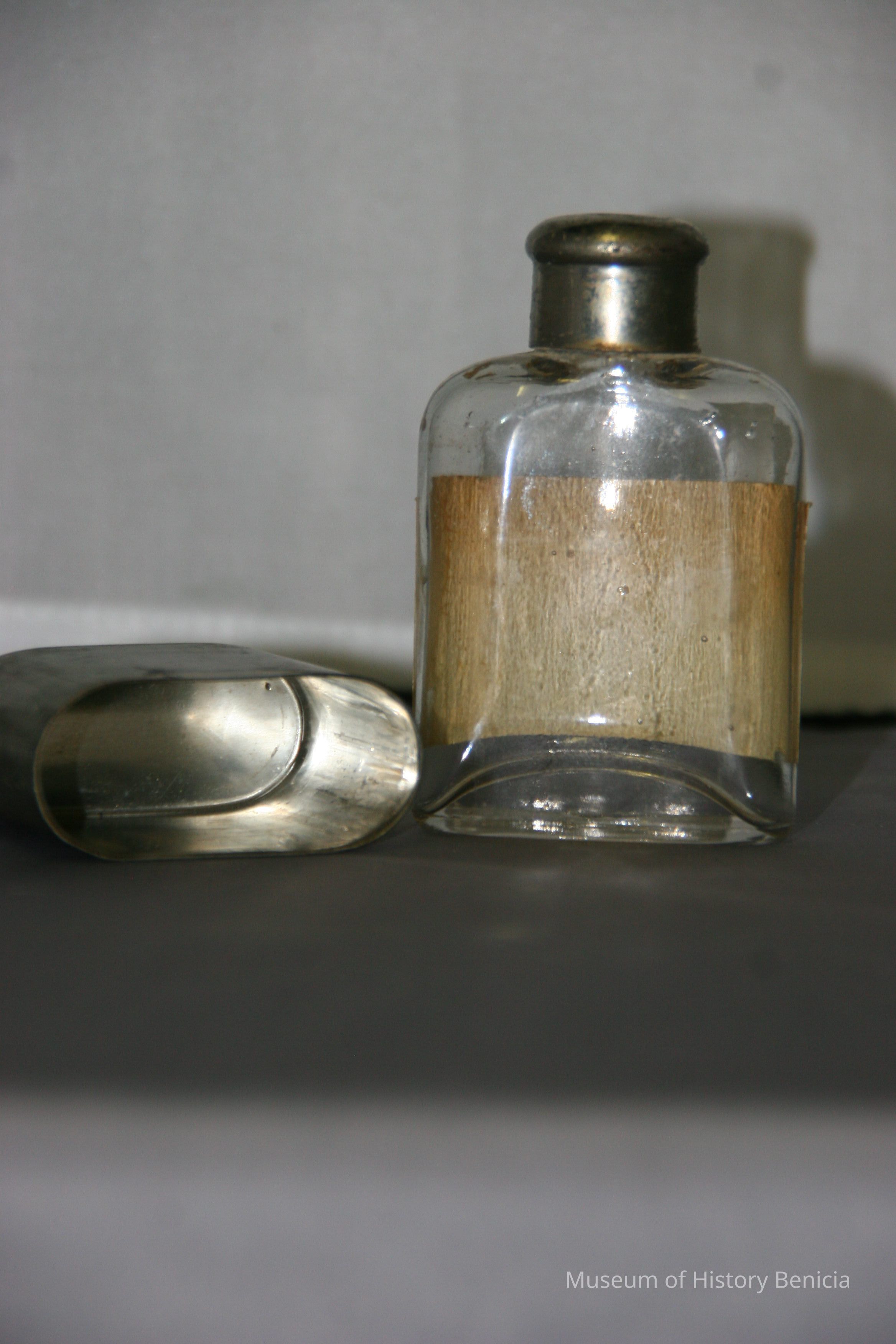 metal cup/case which fits over the lower part of the clear glass medicine bottle BHM 1996.044.0010a