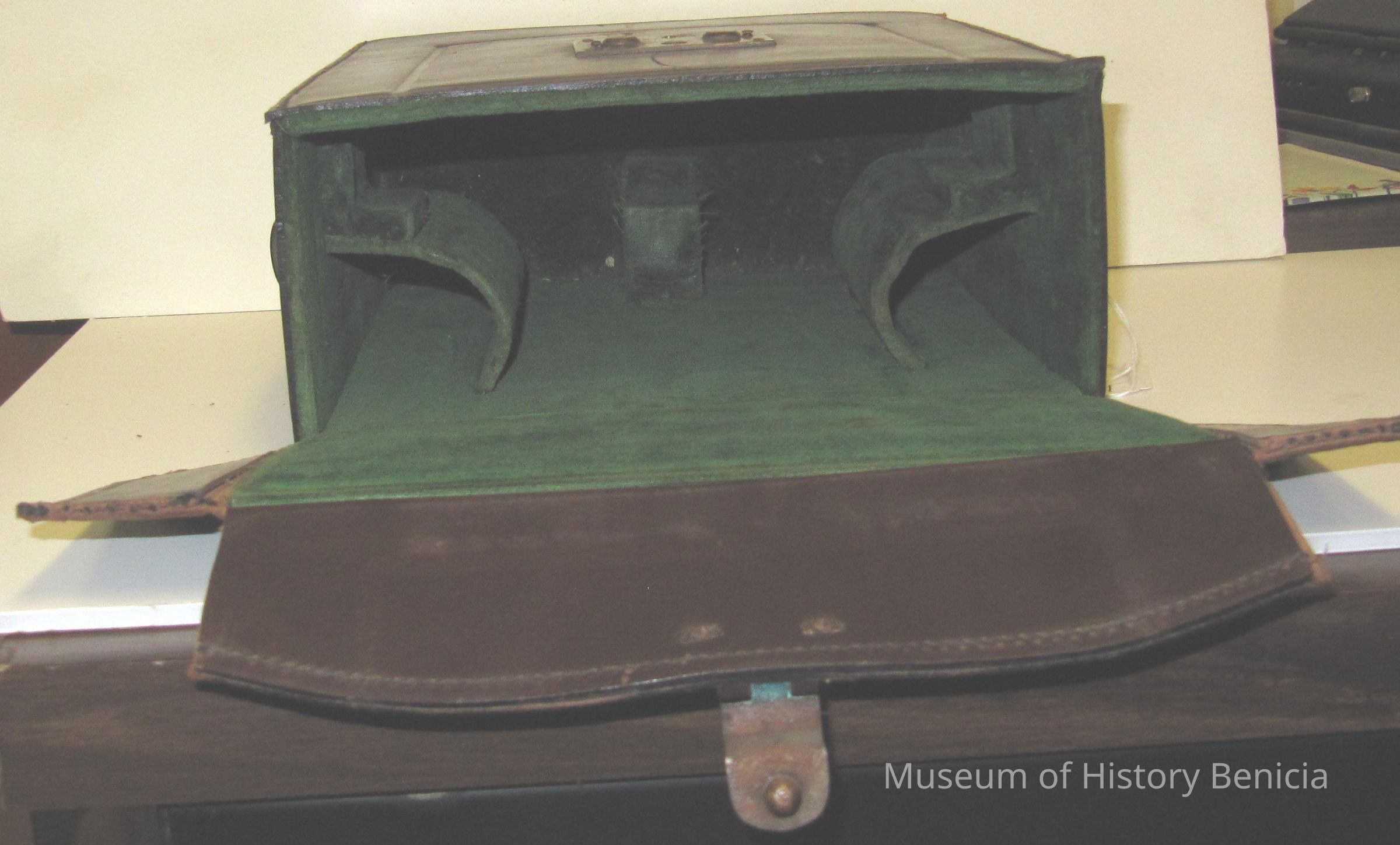 This is a leather case for Victor Cine film camera model 3. This is a 16 mm movie camera taking 100 foot spools. The case is 9.5" x 9.5" x 4.25". It has a green velor interior with preformed interior for this camera.Collection