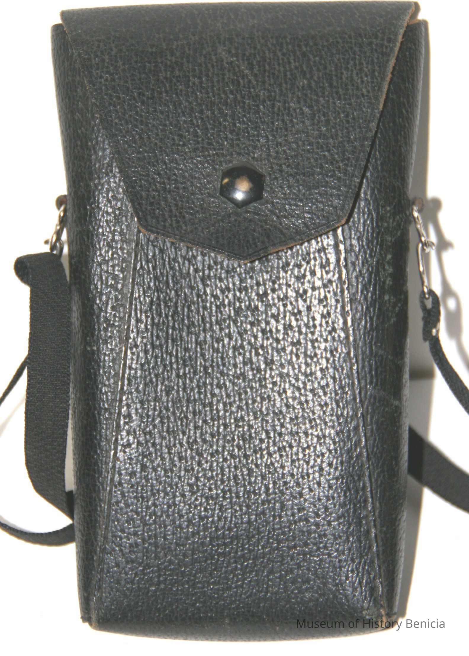 Found with camera 93.3.12 No 2 Folding Hawkeye model B. Black leather with front snap shoulder strap