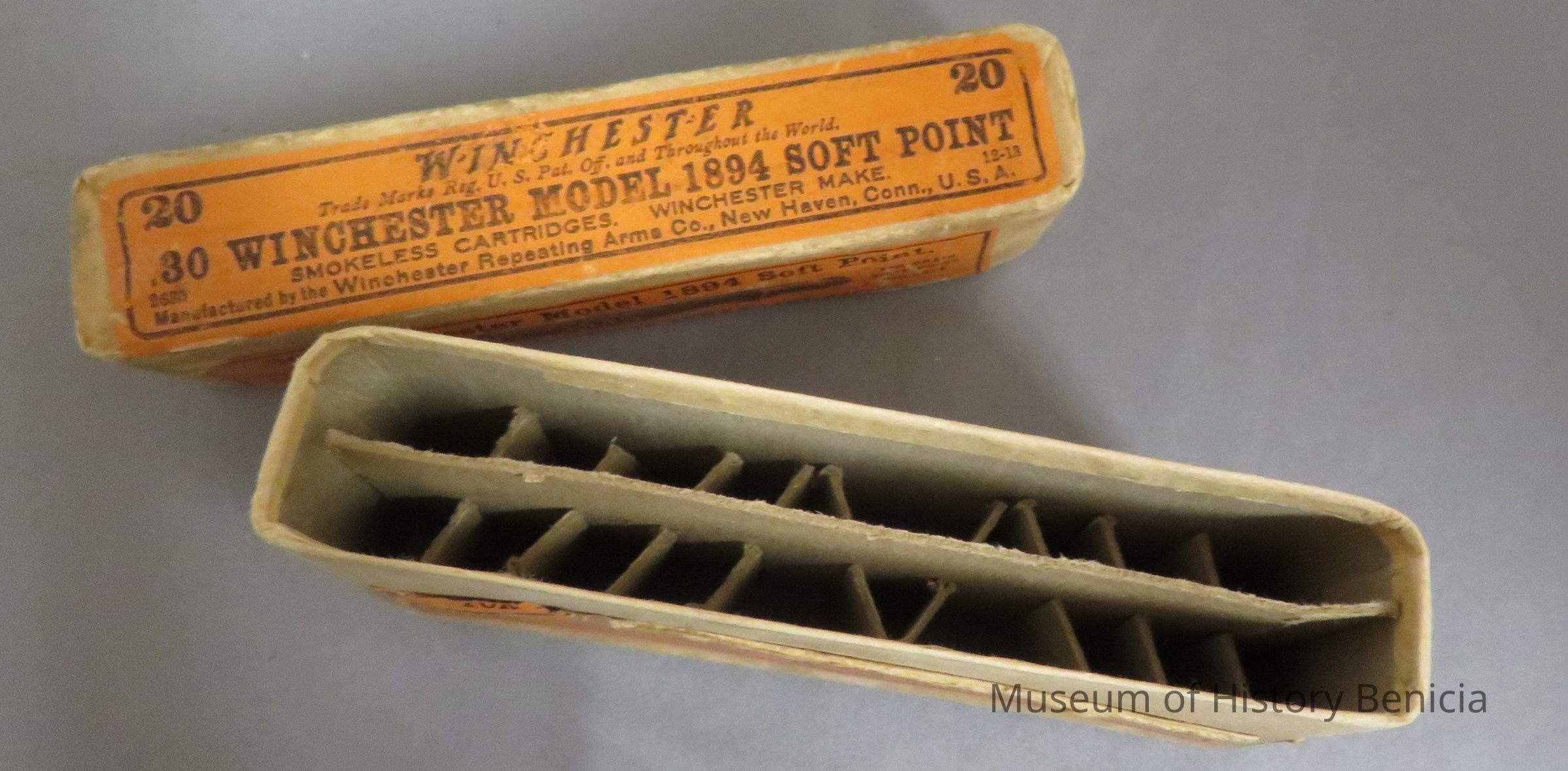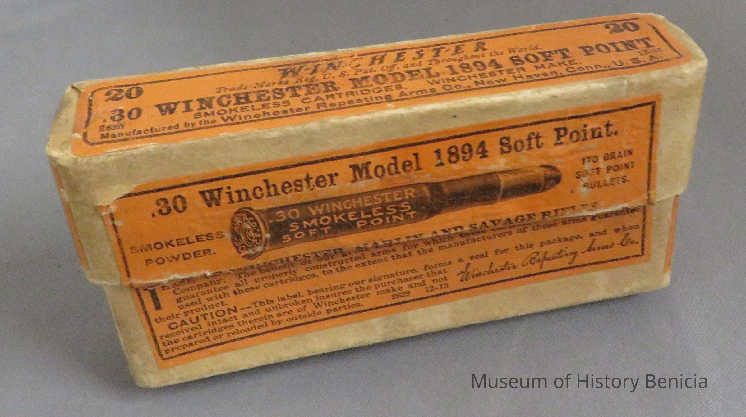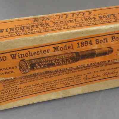 Cardboard case for 20 smokeless powder, soft point, 30 caliber Winchester model 1894 170 grain soft rifle cartridges.