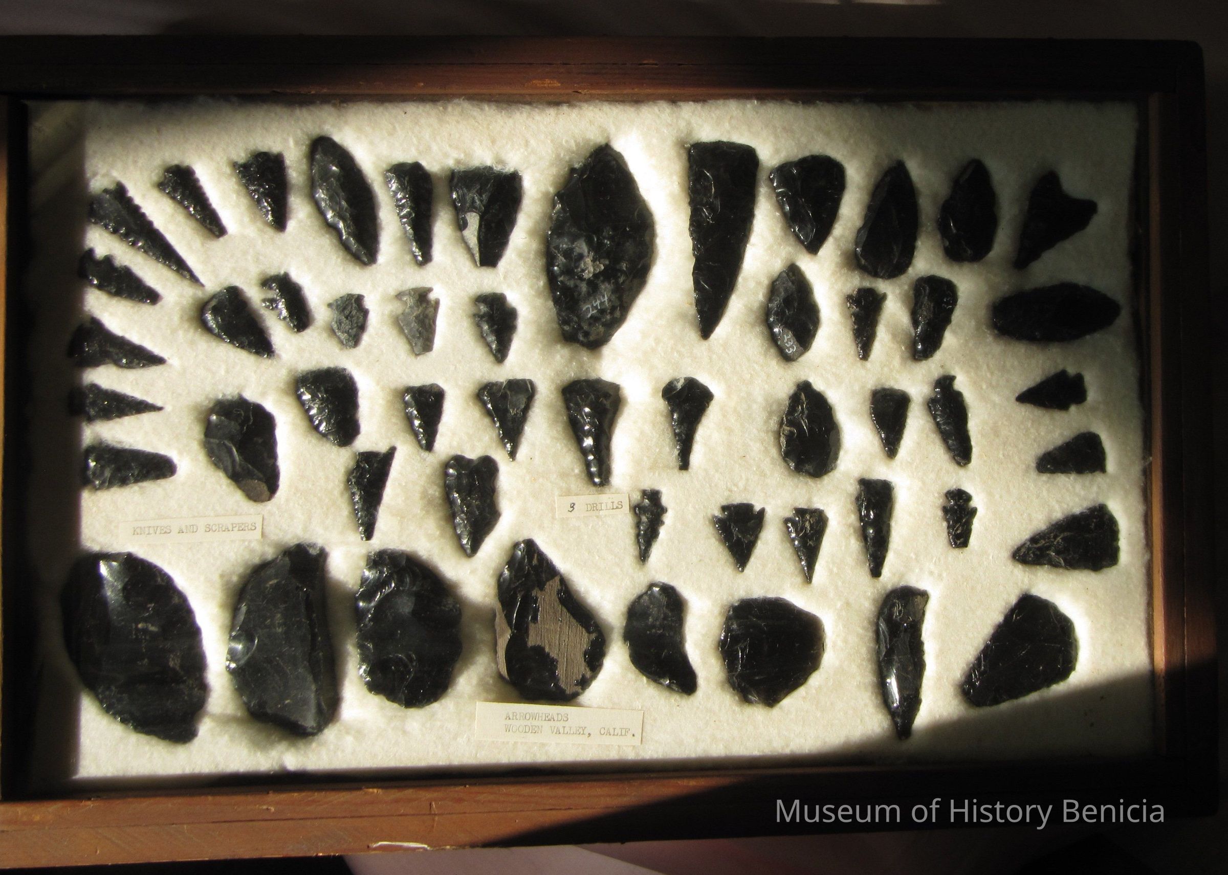 Display case containing Indian arrowheads marked Wooden Valley, Calif. Includes knives, scrapers and 3 drills. marked case No 1 / H Lerch / 308-07-7537 / Y0623490Collection