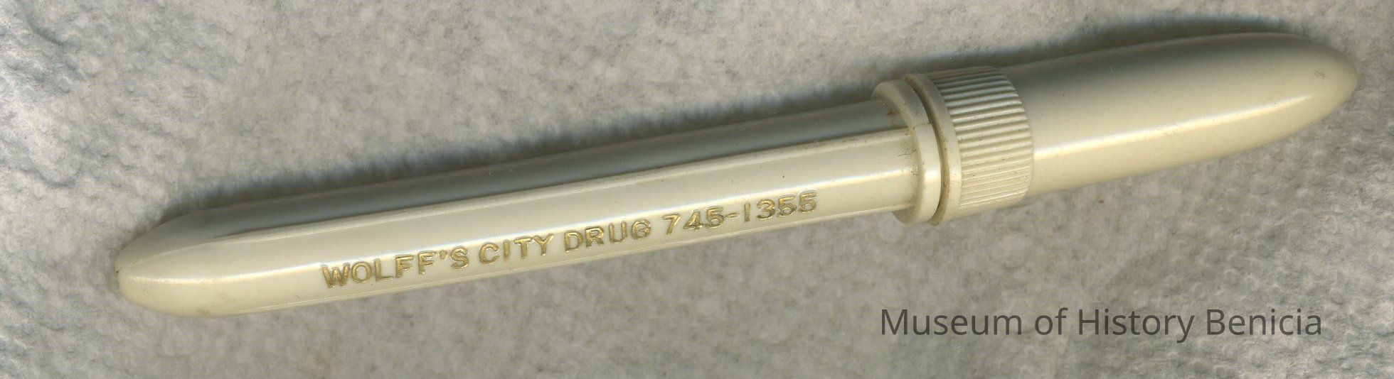 "Wolff's City Drug 747-1355" in gold lettering; tapers at each end;