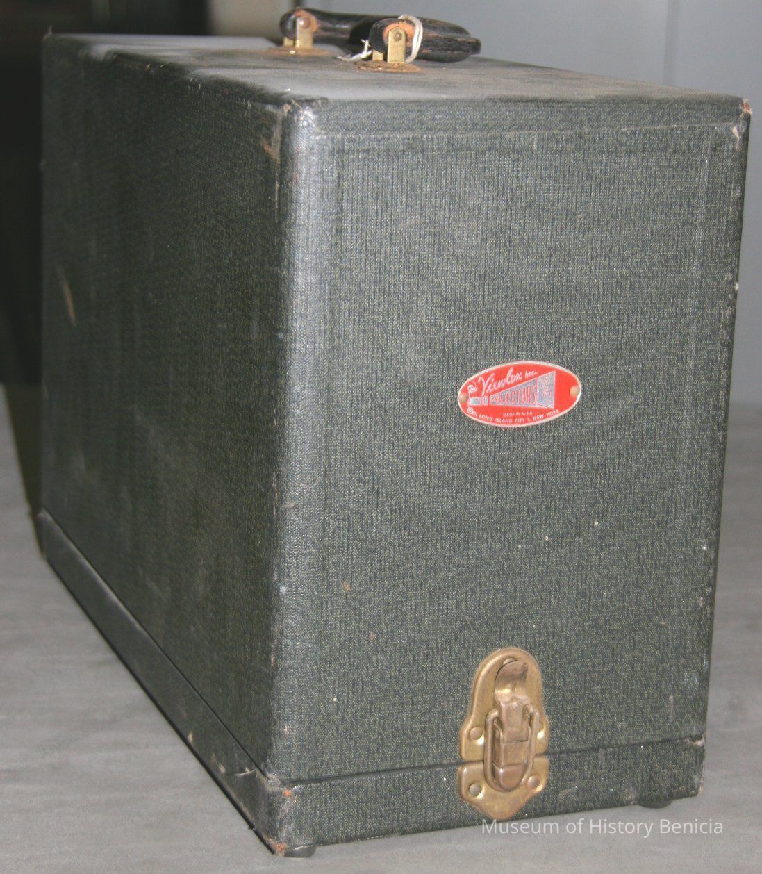 Film strip projector case found with Viewlex film strip projector (93.3.16). 2-part case-bottom attaches to projector, top attaches to bottom with two hinges - carrying handle (suitcase-type) on top - Viewlex metal name plate on one side.Collection