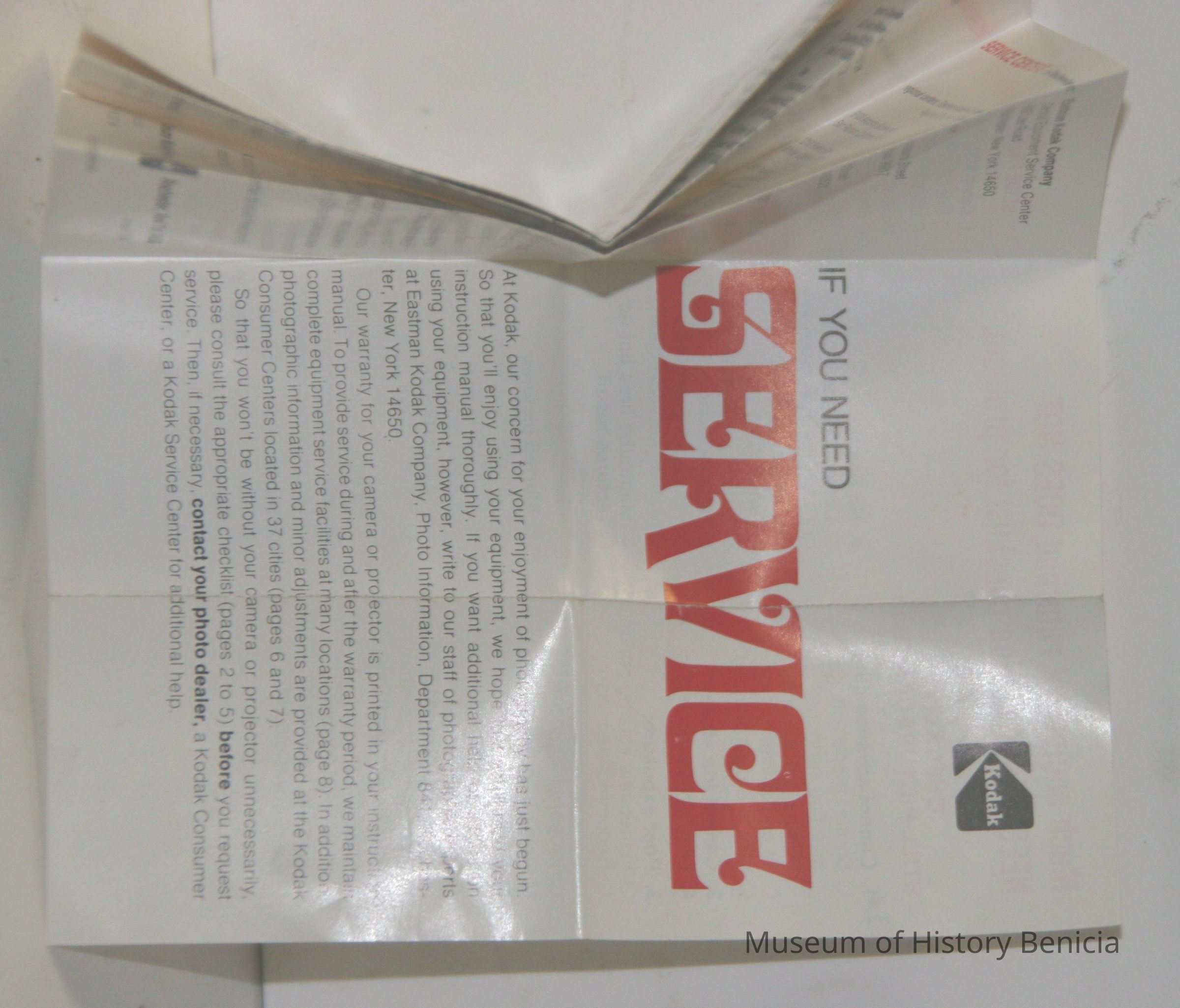Kodak Service bulletin. Lists Kodak consumer centers, check lists for movie cameras, slide projectors and still picture cameras.