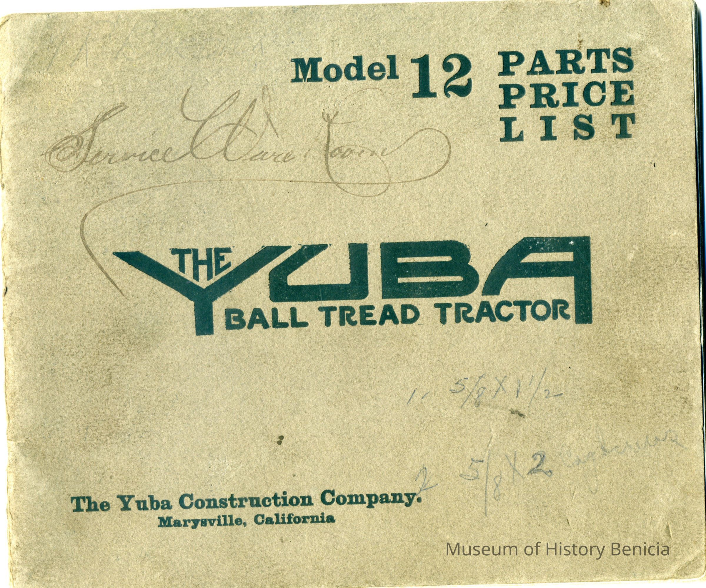 31 page catalog of the Model 12 Ball Tread Tractor from Yuba. The inside cover shows it belonged to M.R. Burdick. It contains parts for this device.Collection